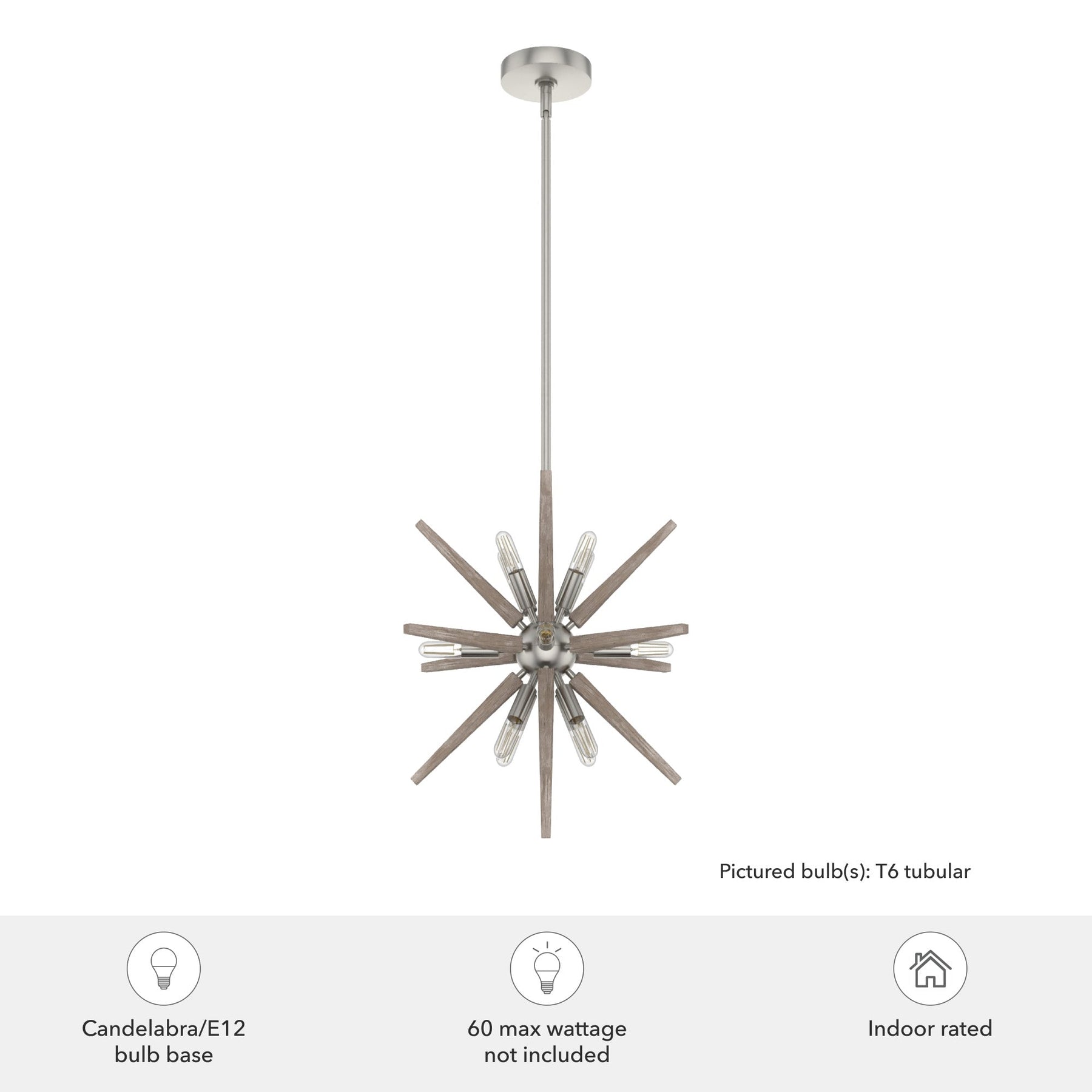 A: The fixture uses twelve E12-base light bulbs, with T6 Tubular shape bulbs recommended, and can accommodate up to 60 Watts each.