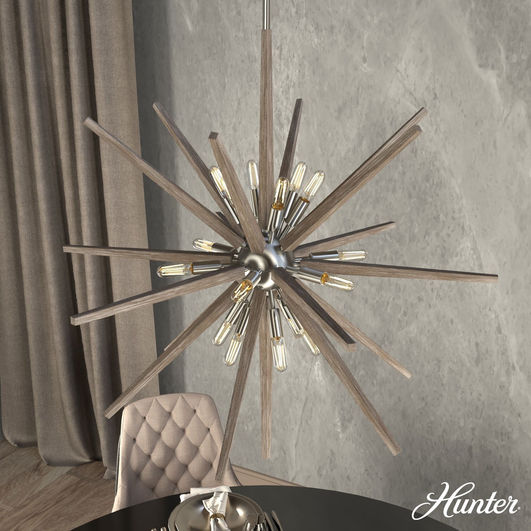 Illuminate your space with the Hunter Jupiter Star 18-Light Brushed Nickel Mid-century Sputnik LED Light, crafted for elegant kitchens and expansive rooms. This striking fixture combines the brilliance of LED lighting with a mid-century modern design, perfect for large areas that demand a touch of sophistication and flair.