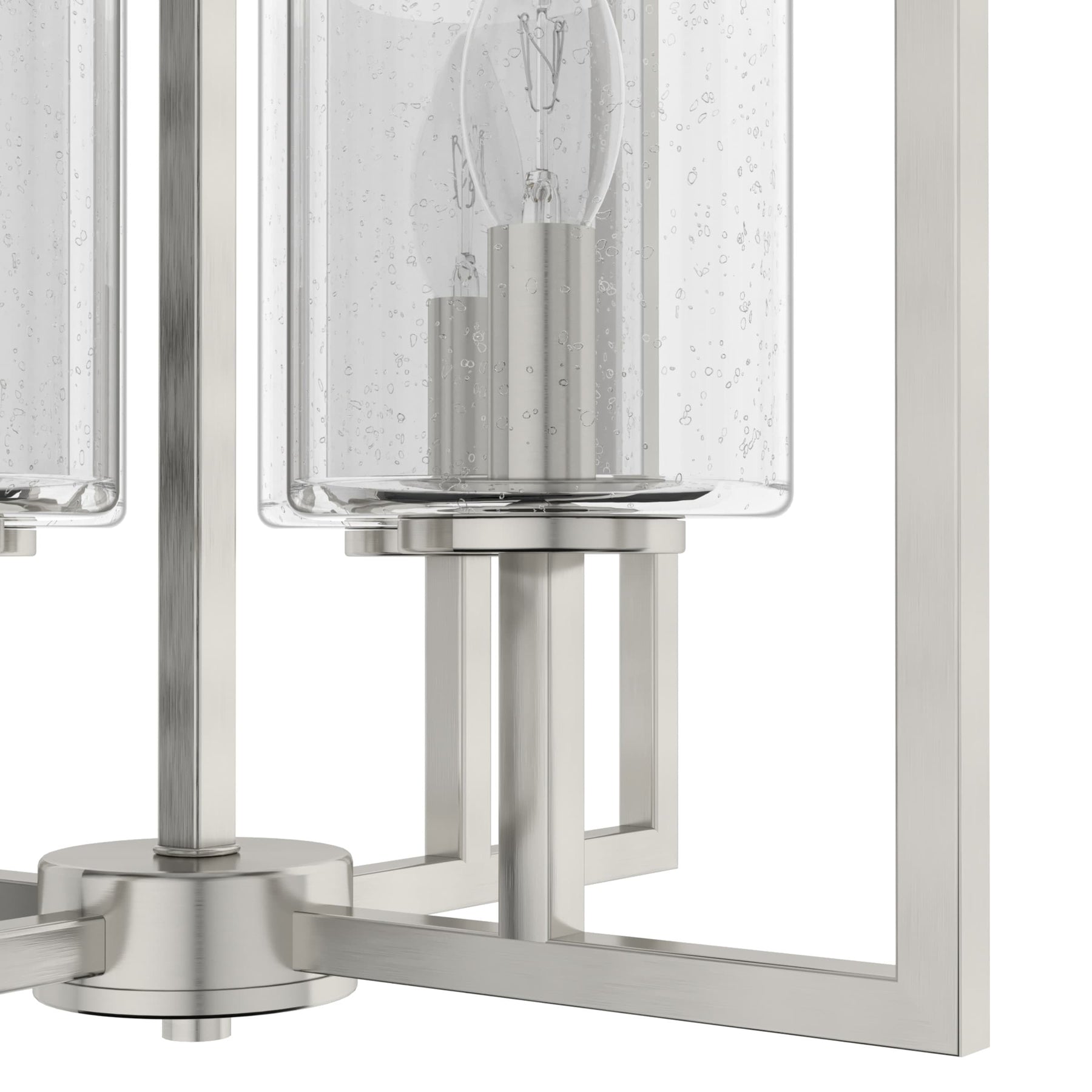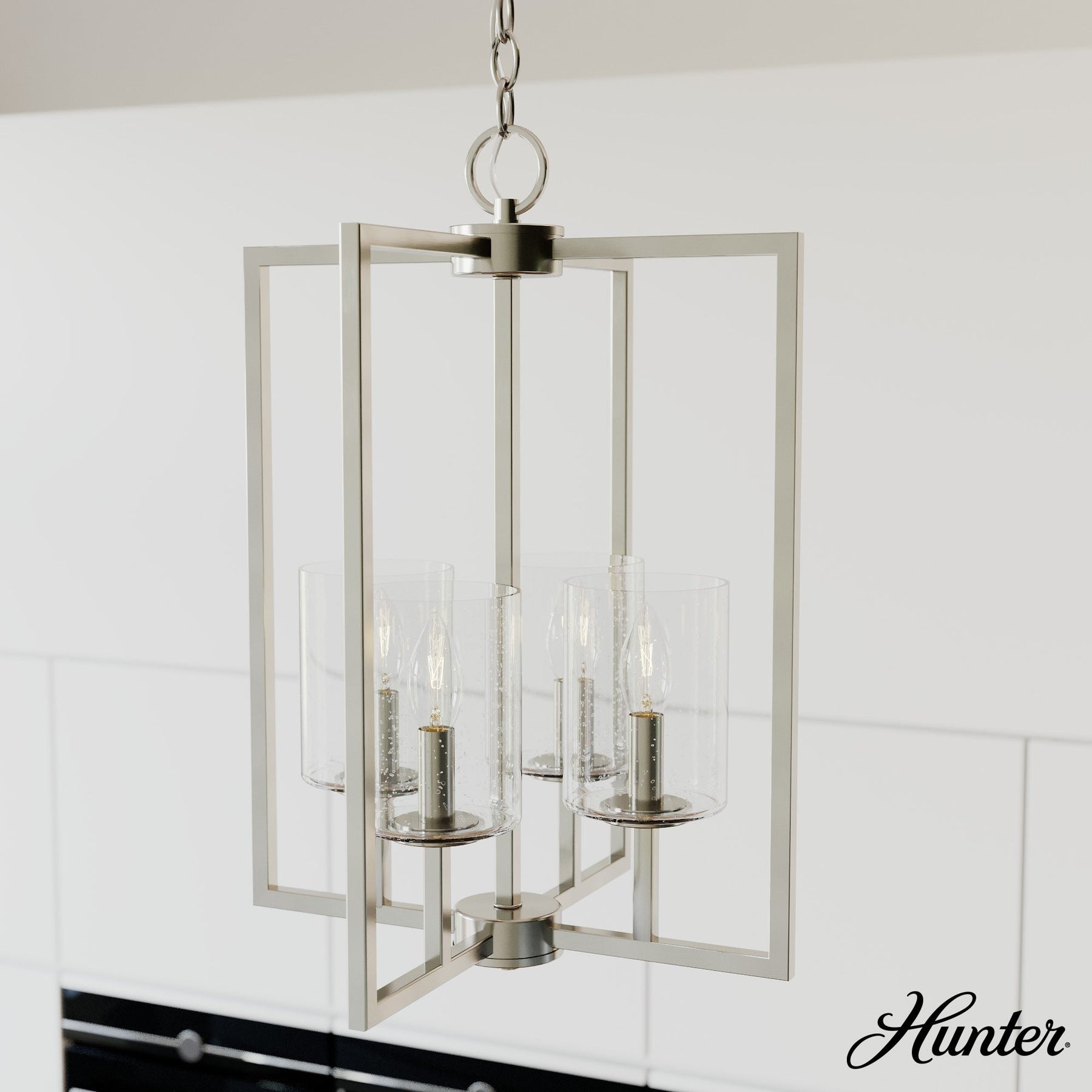 The Hunter Kerrison 4-Light Pendant Light combines timeless elegance with modern flair, featuring a brushed nickel finish and seeded glass shades. Ideal for kitchens or dining areas, this adaptable fixture transforms any space with its sophisticated design and captivating illumination.