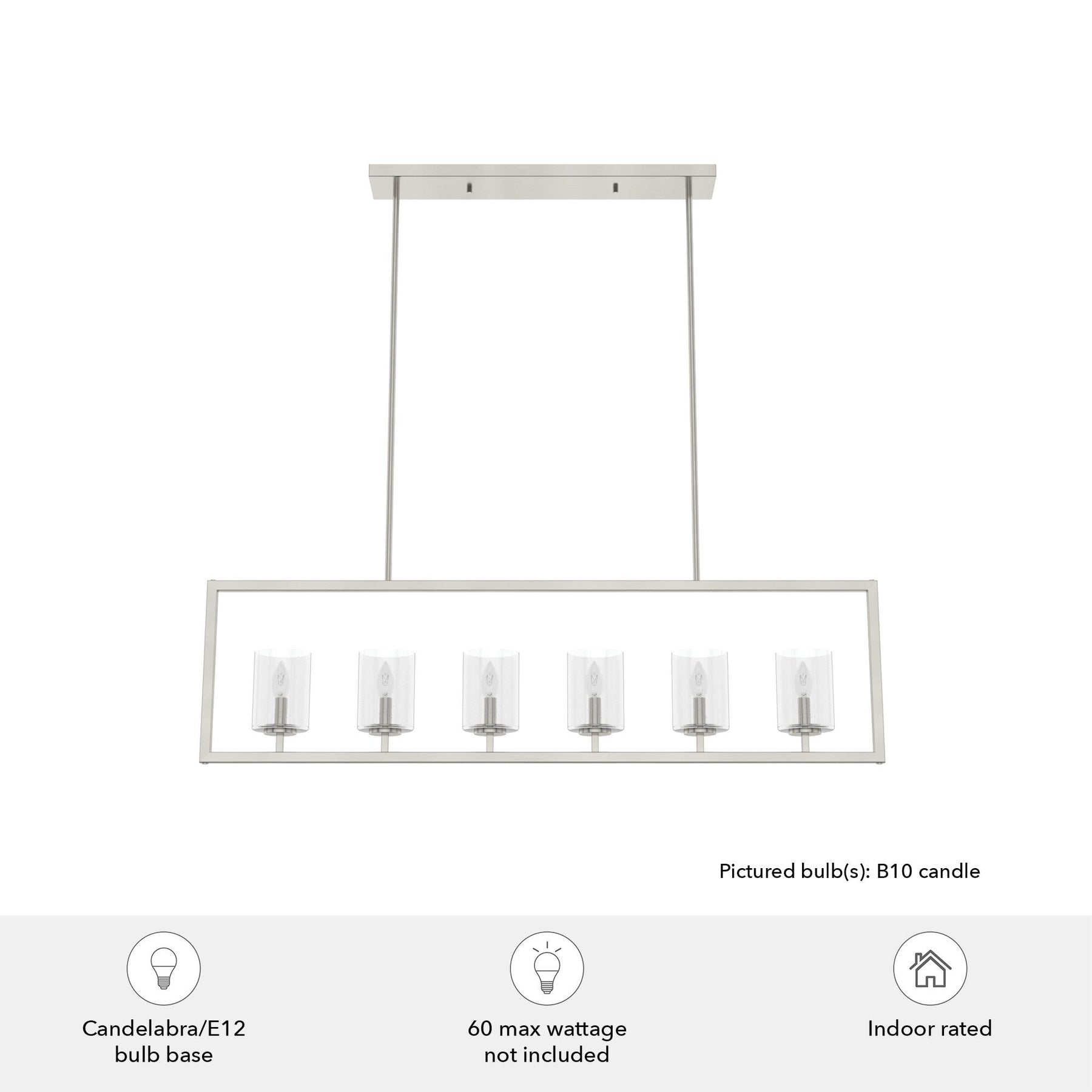 A: The chandelier requires six E12-base light bulbs, with B10 Candle bulbs recommended, each up to 60 watts or the LED equivalent.