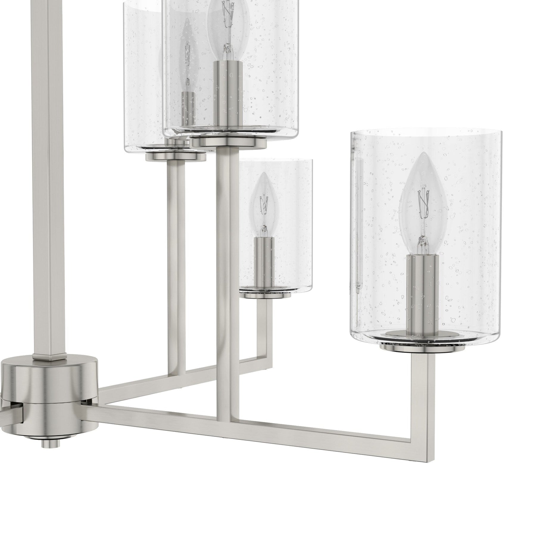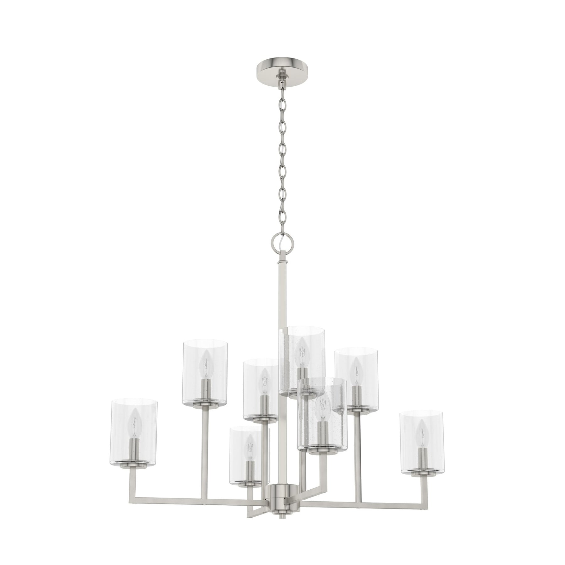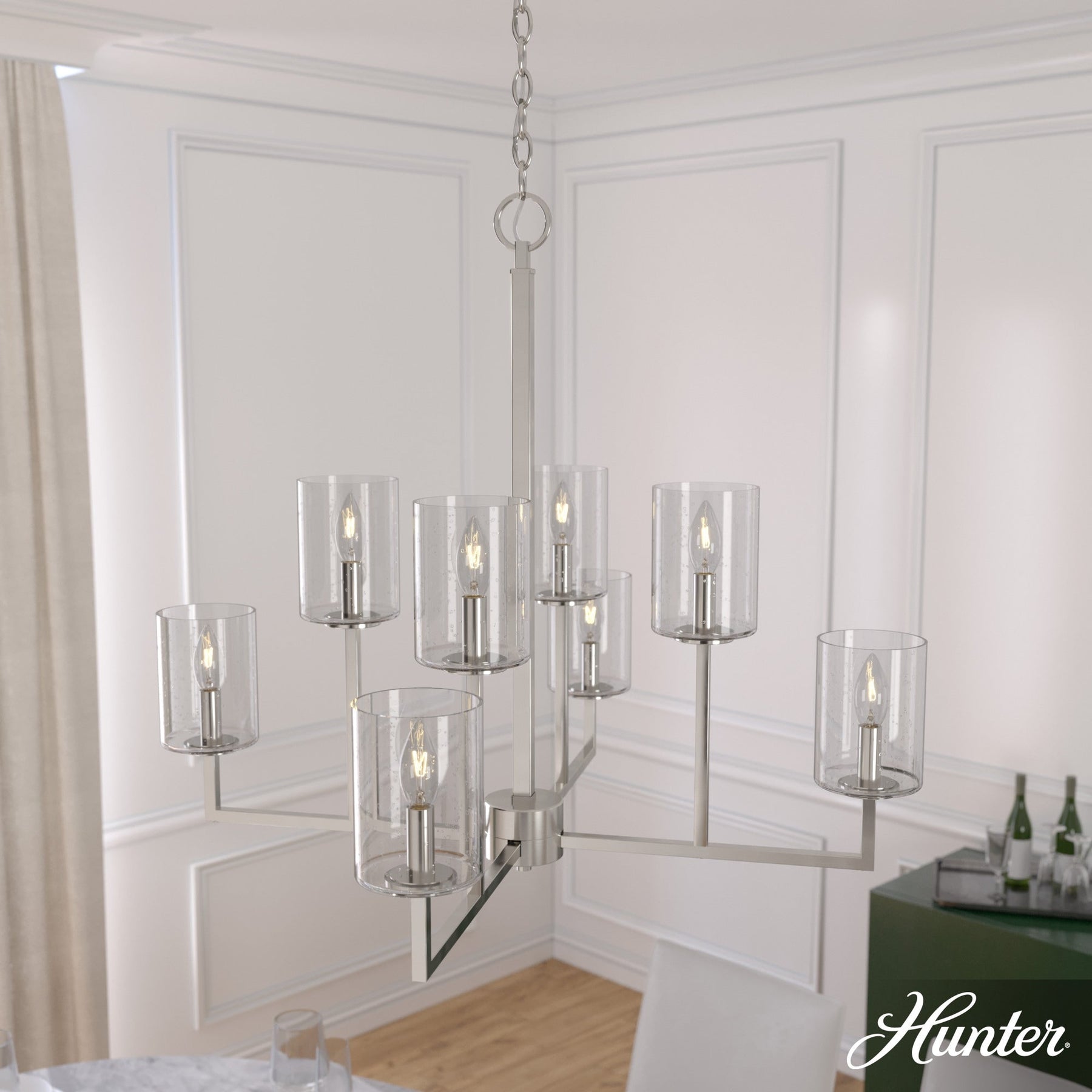 Elevate any room with the Kerrison 8-Light Brushed Nickel Chandelier from Hunter. This transitional fixture combines sleek geometric lines with premium seeded glass for a refined touch. Perfect for kitchens, dining rooms, or foyers, it offers flexible hanging options and compatibility with LED bulbs for modern convenience.