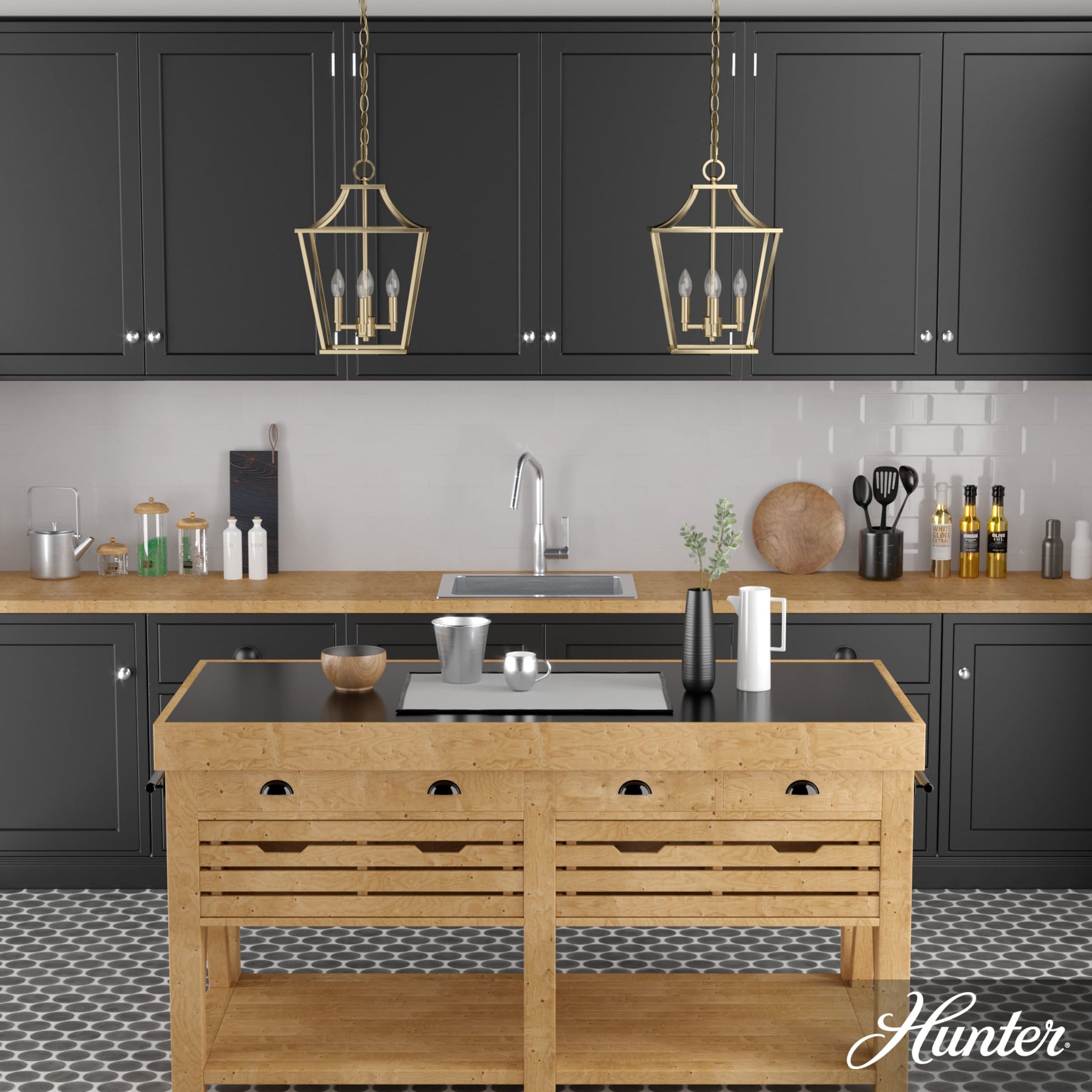 Illuminate your home with the Hunter Laurel Ridge 4-Light Alturas Gold Lantern Pendant. Its transitional design blends modern elegance with traditional Georgian silhouettes, offering a sophisticated lighting solution for kitchens, dining rooms, and more. The adjustable chain allows for versatile hanging options to suit your space perfectly.