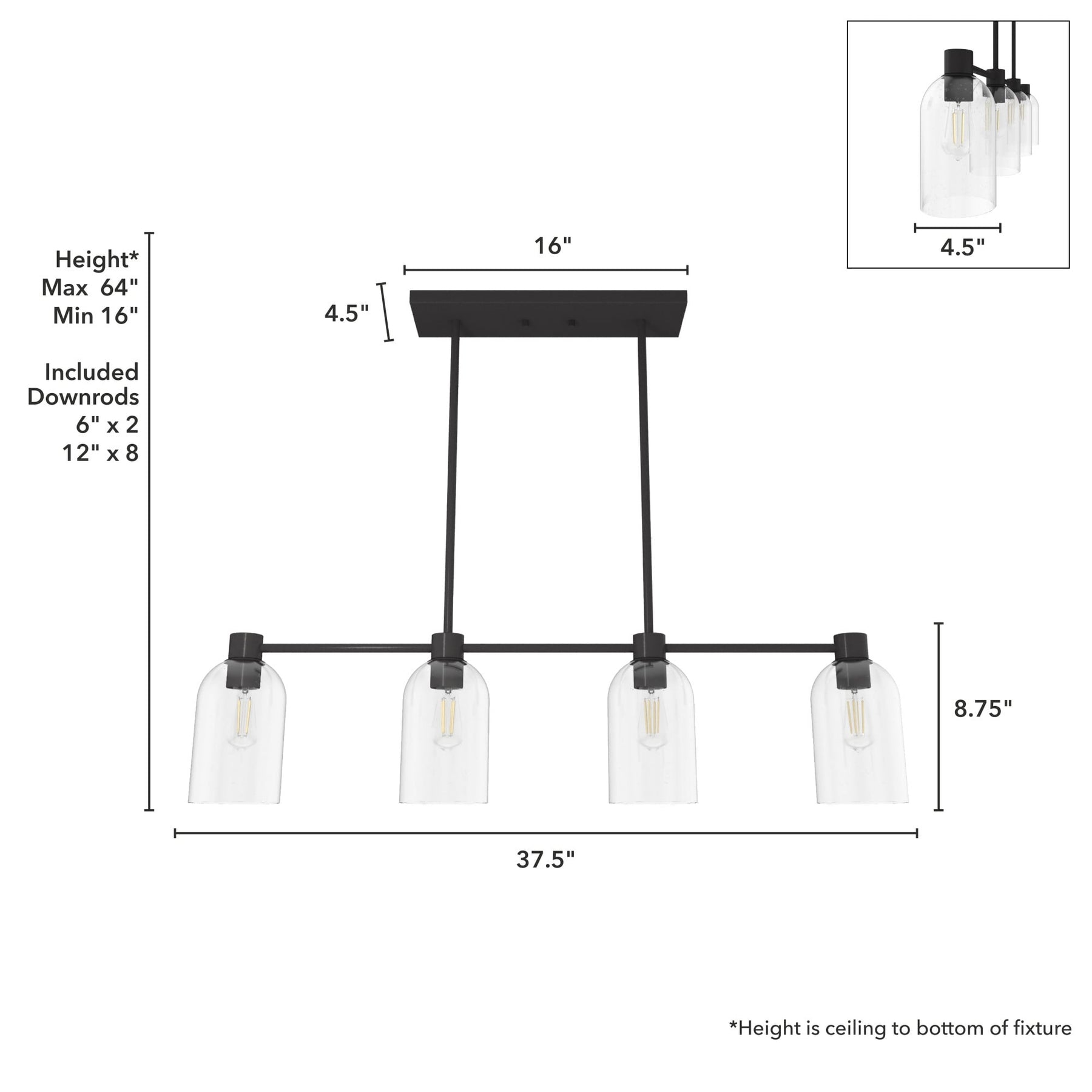 A: Yes, it comes with one 6-inch and four 12-inch downrods, allowing you to adjust the hanging height from 16 to 64 inches.