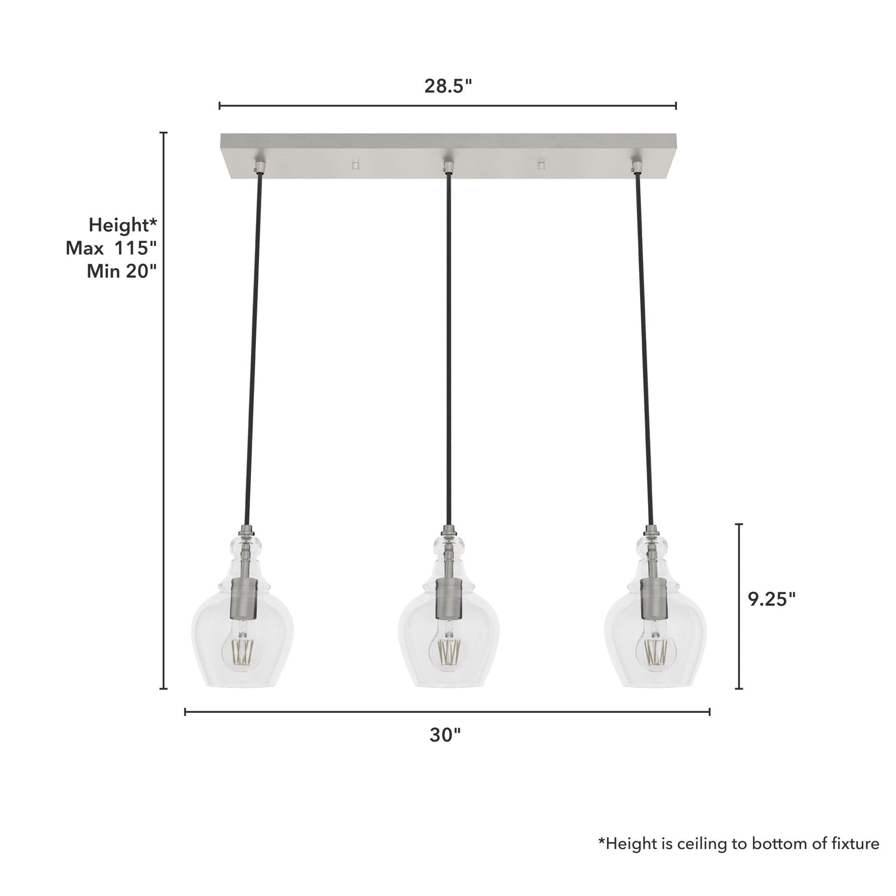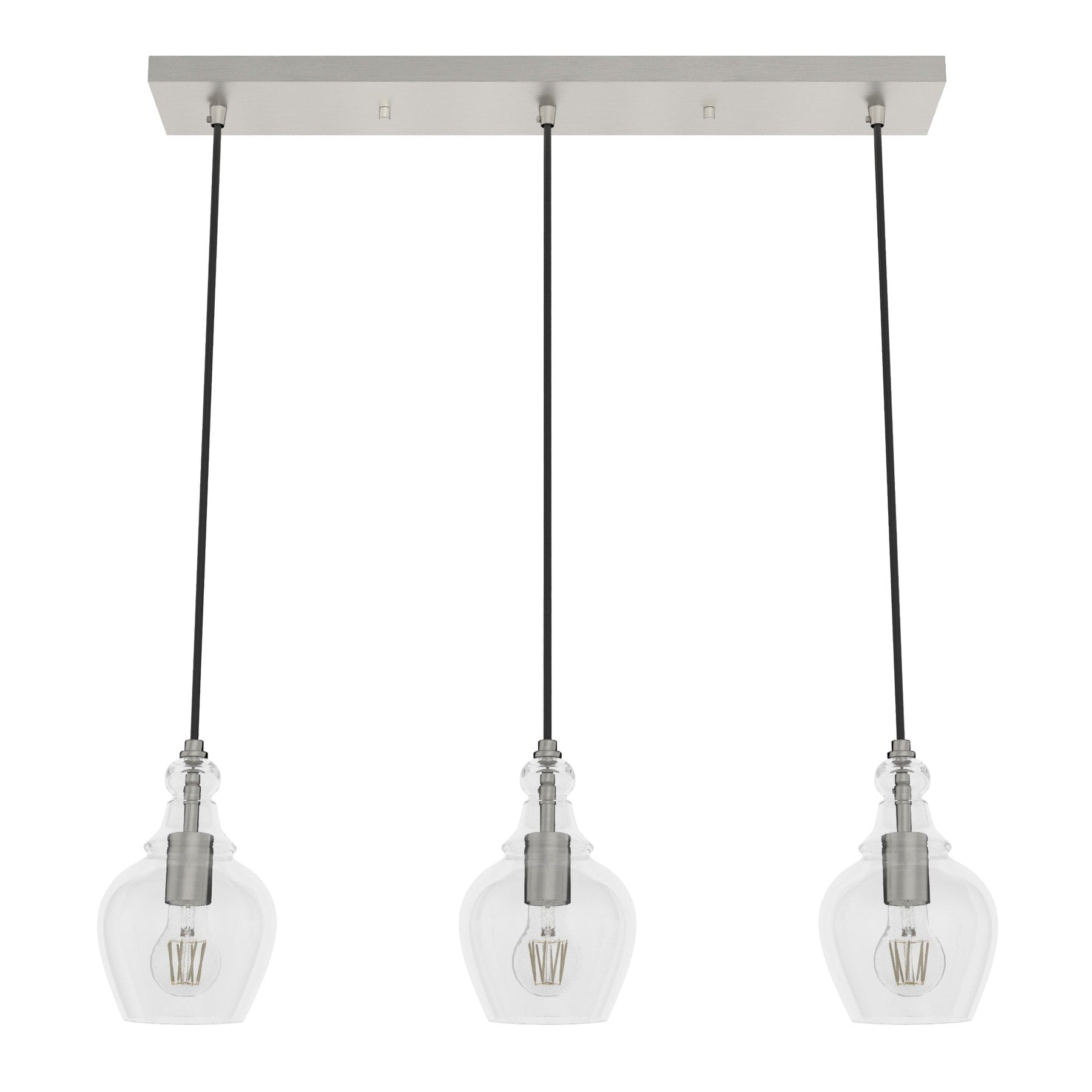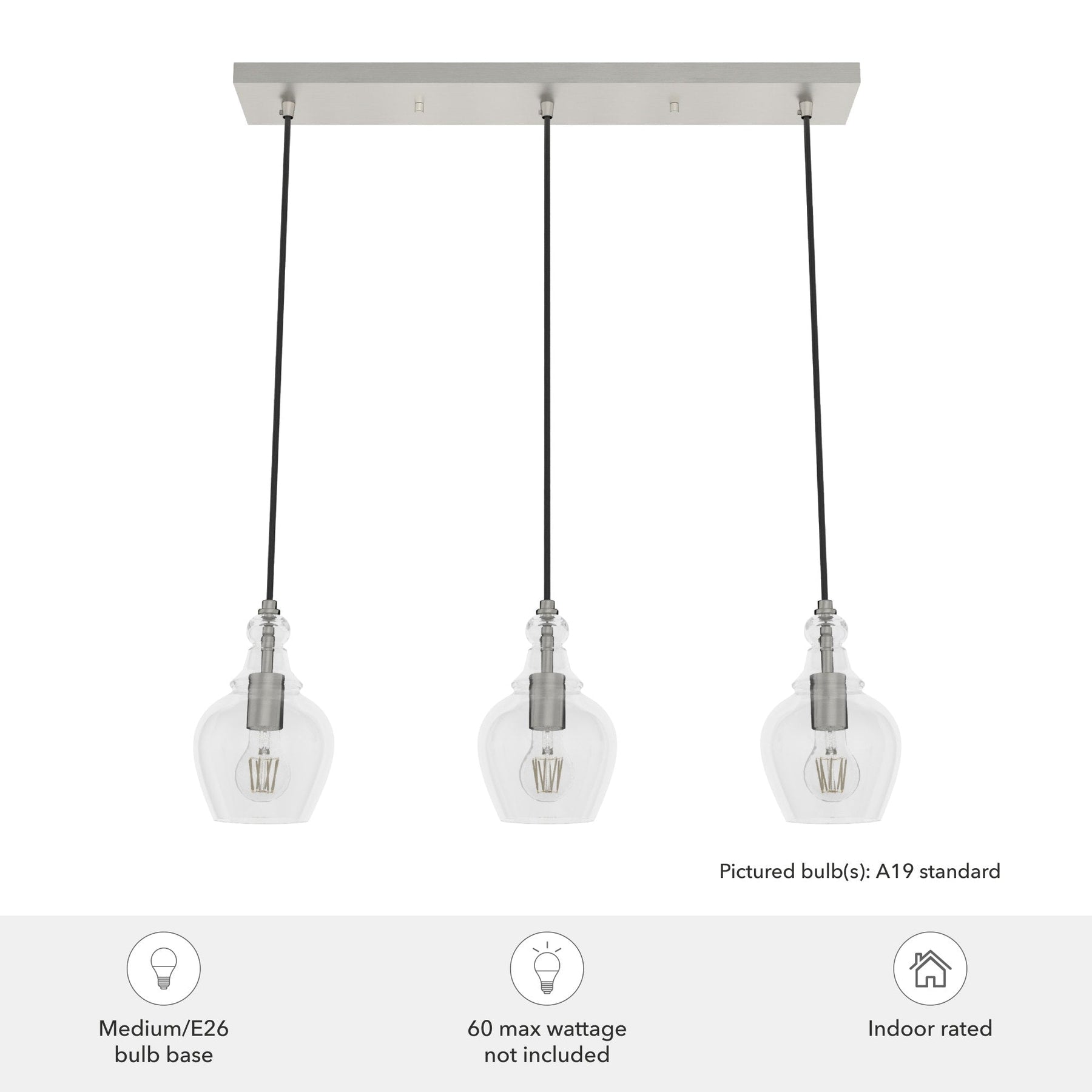 Illuminate your space with the elegantly transitional Hunter Maple Park 3-Light Pendant. Featuring a brushed nickel finish and clear glass shading, this linear LED hanging fixture adds a touch of sophistication to any kitchen, dining area, or living room. Designed for easy installation and adjustable hanging heights, it offers both style and practicality to any setting.