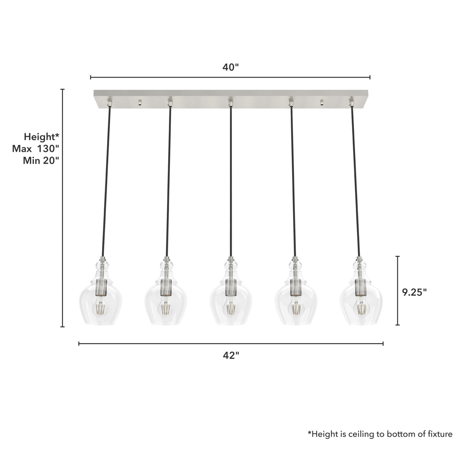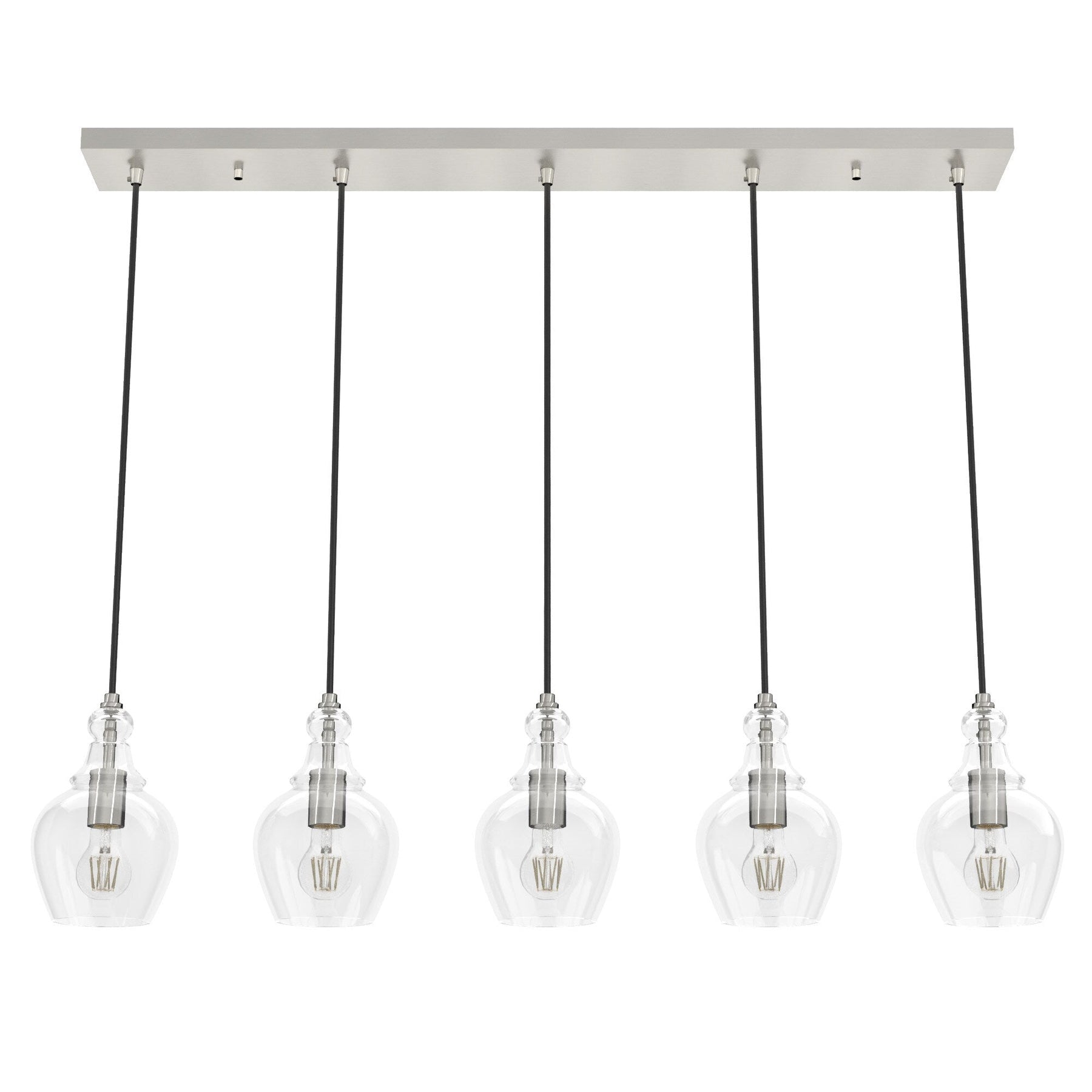Enliven your interior with the Maple Park 5-Light Linear Pendant, a beacon of elegance that harmonizes rustic textures with contemporary design. Its clear glass shades emit a soft radiance, creating a welcoming aura across dining and living spaces. Adorned with a sleek brushed nickel finish, it effortlessly anchors any room with understated opulence. Elevate the ambiance by pairing it with Edison bulbs for a nostalgic glow, making this fixture a cornerstone of sophisticated and luxurious home settings.