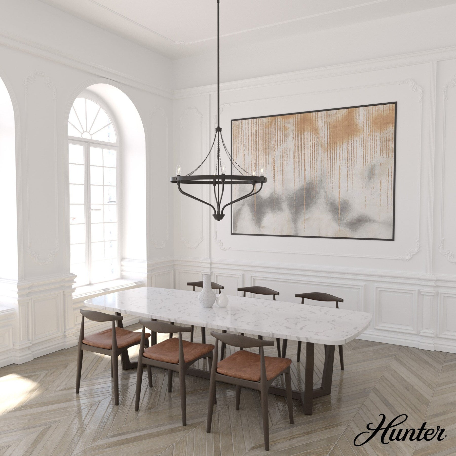 Envision the Hunter Merlin Chandelier as the linchpin of your interiors—a piece that exudes warmth and mystique through its artful composition. Its sleek, noble bronze finish juxtaposes industrial design with a contemporary twist, making it a perfect focal point over a dining table or in a living space. Accentuate its striking form by pairing it with rustic, raw materials like reclaimed wood or brushed metals. This chandelier isn't just illumination; it's an essential thread in the tapestry of luxurious living.