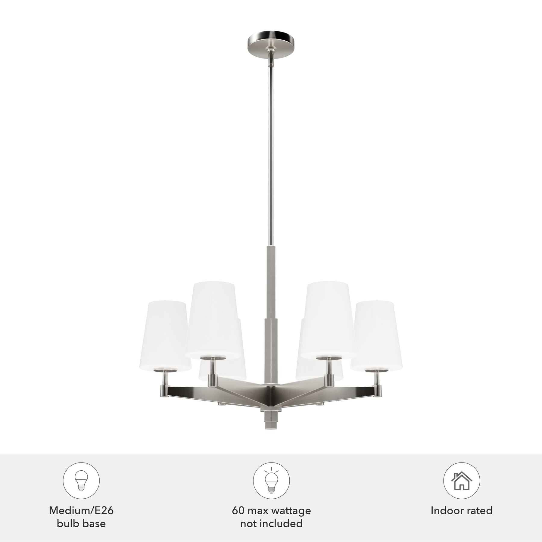 A: The chandelier uses six E26-base bulbs, with A19 as the recommended shape. You can choose up to 60-Watt incandescent bulbs or the LED equivalent.