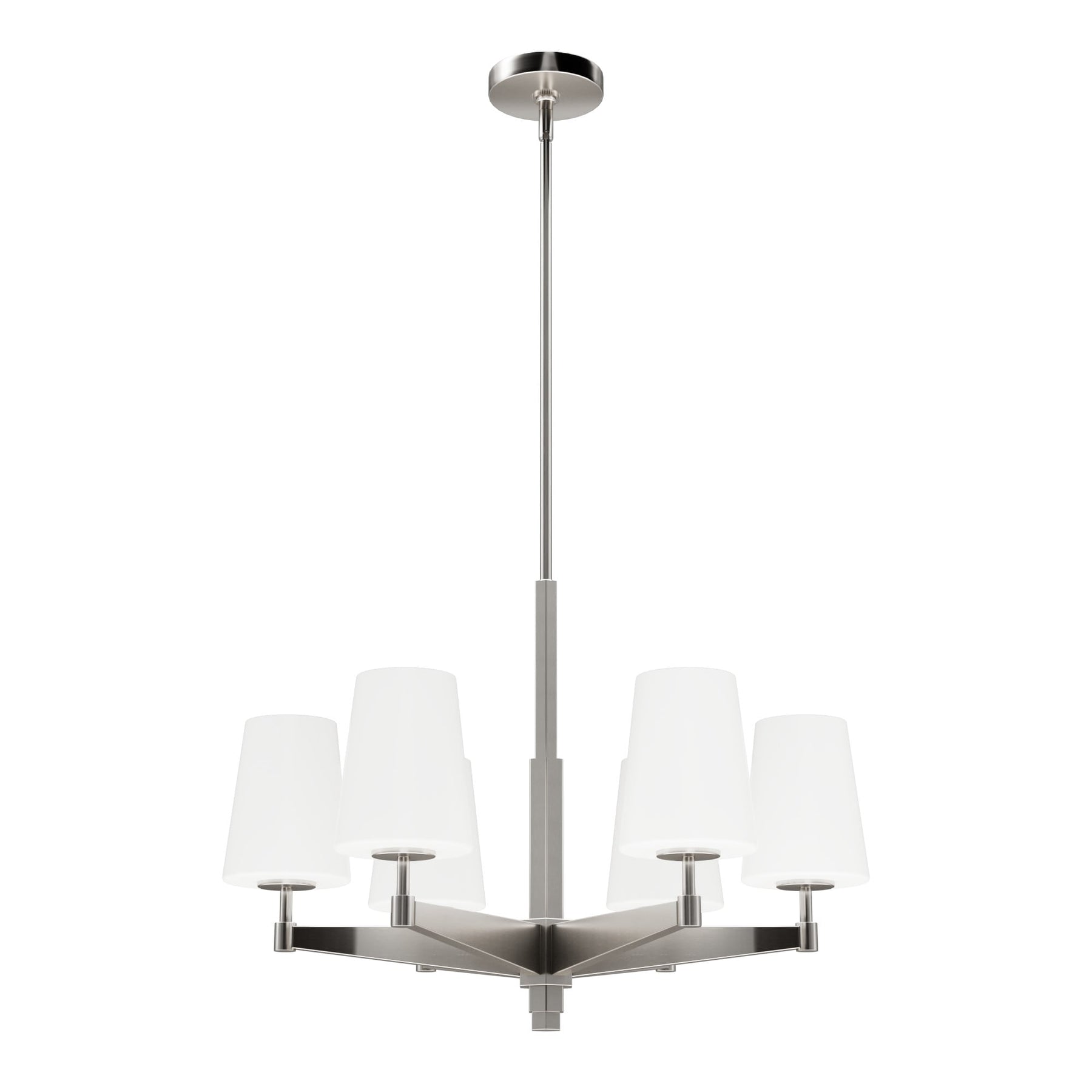 The Hunter Nolita Chandelier effortlessly transforms your interior into a haven of modern elegance with its radiant glow and sleek design. Its brushed nickel finish paired with cased white glass shades casts light with an inviting warmth, enhancing the allure of your kitchen or dining area. Imagine styling this piece above a marble-topped dining table, where its geometric precision accentuates the room's clean lines and sophisticated vibes. Let the Nolita chandelier be a centerpiece that defines luxury and elevates your living space.