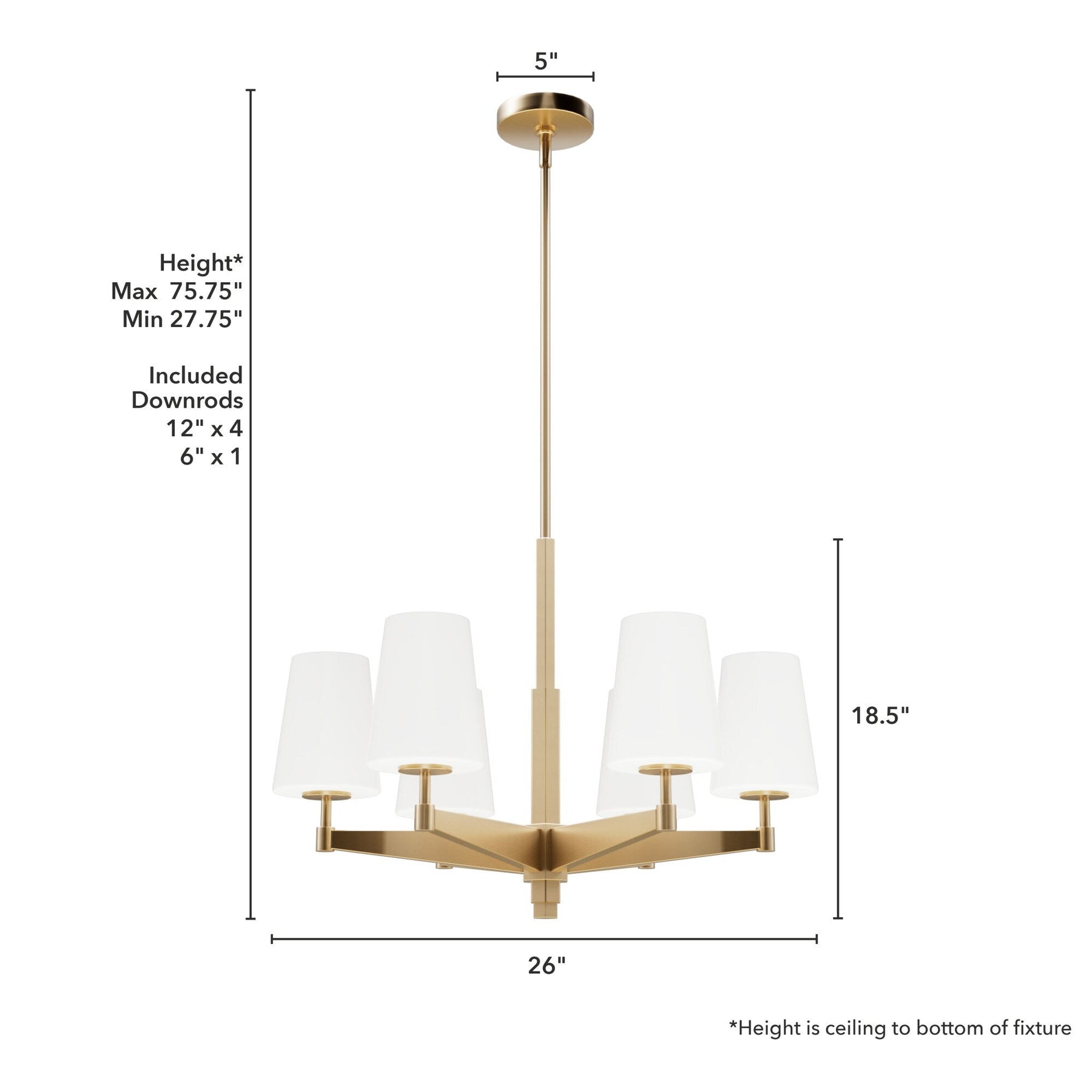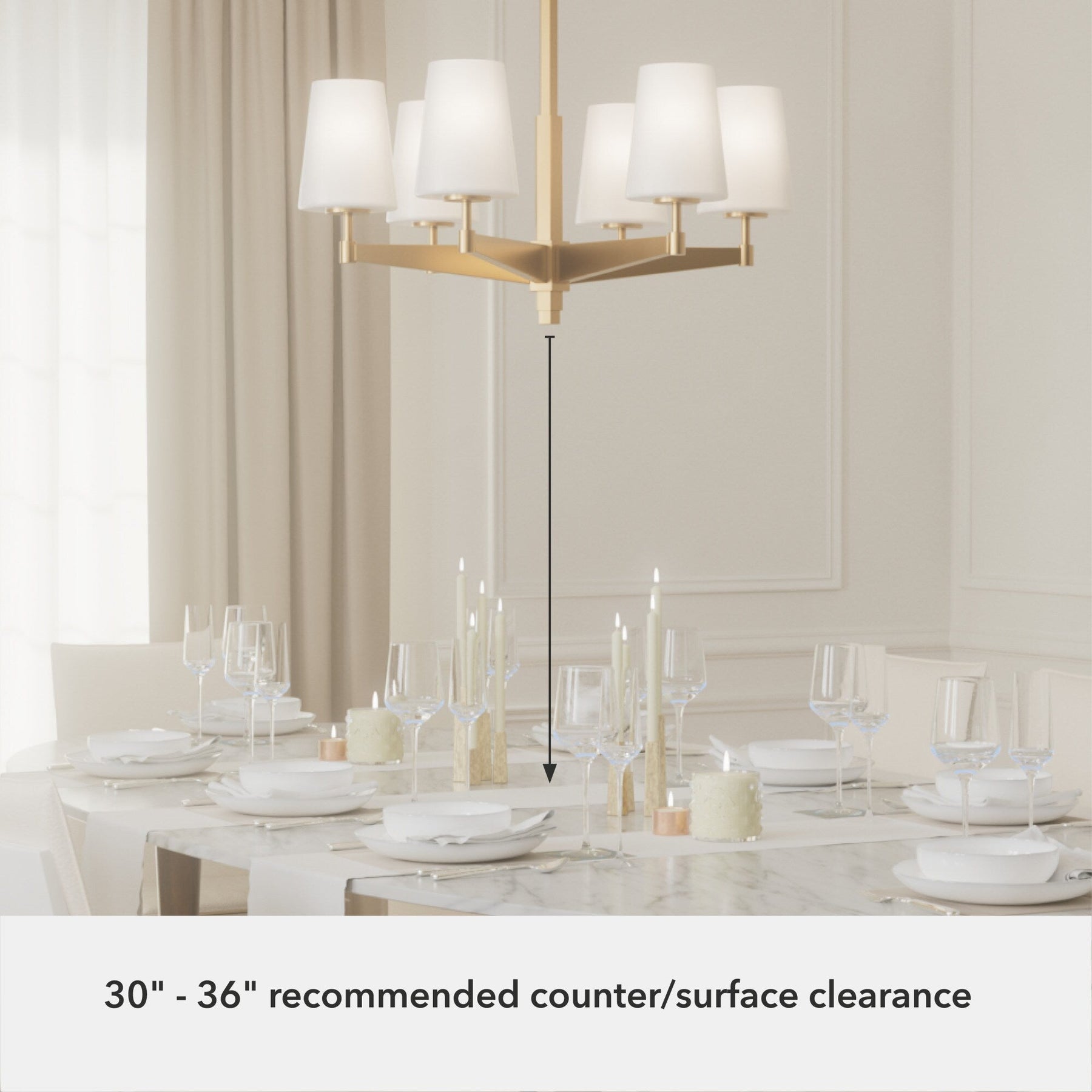 Elevate your living space with the Hunter Nolita 6-Light Satin Gold Chandelier. This modern, sophisticated chandelier offers flexible hanging options and a sleek design, making it perfect for kitchens, dining rooms, and living areas. Crafted from durable materials with premium cased white glass to diffuse a warm, inviting glow.