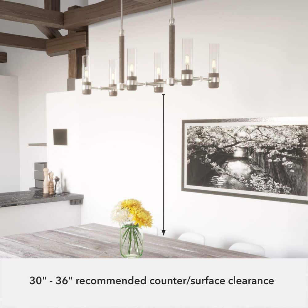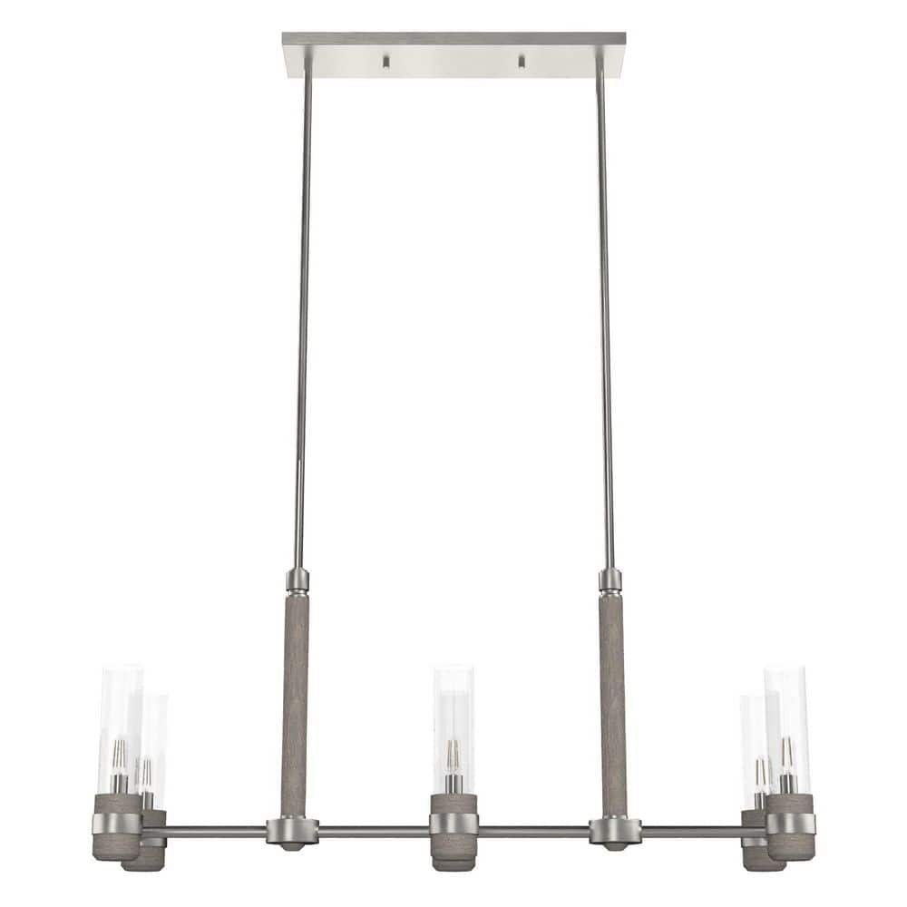 Transform your space with the chic and modern River Mill 6-Light Candlestick Chandelier by Hunter. Crafted with a brushed nickel finish and clear seeded glass shades, it evokes a rustic yet contemporary aesthetic perfect for any home. Its versatile design allows for adjustable hanging lengths, making it ideal for dining rooms, kitchens, and foyers.