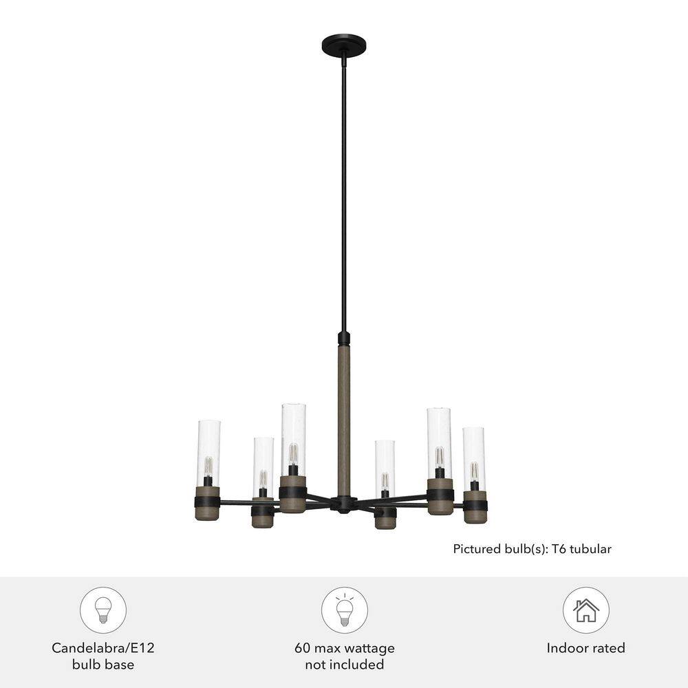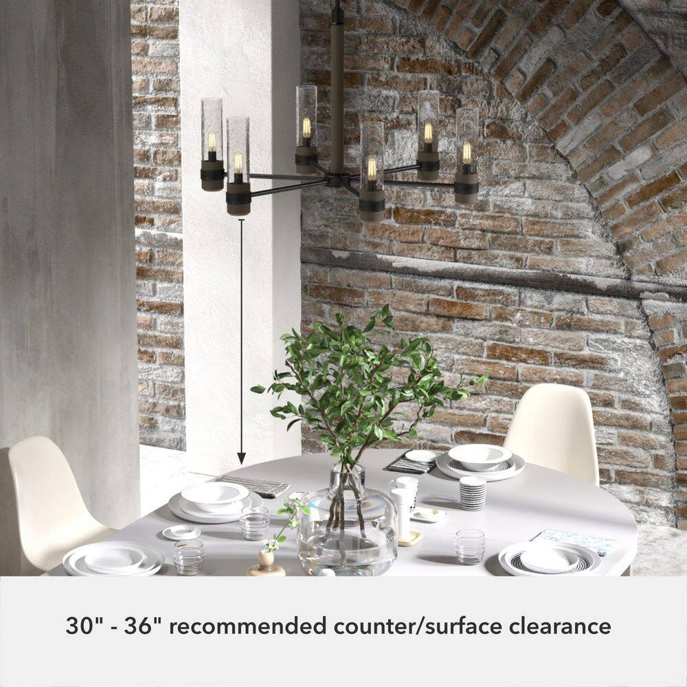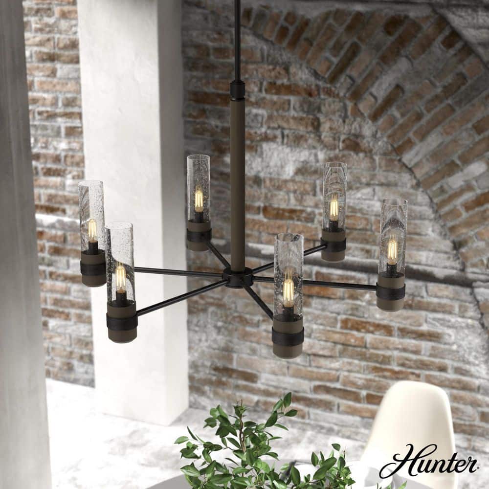 Elevate any room with the timeless elegance of the Hunter River Mill 6-Light Chandelier. Combining rustic iron with sleek, clear seeded glass shades, this fixture exudes a modern mountain lodge charm. Perfect for illuminating kitchens, dining rooms, or foyers, its adjustable hanging length offers versatile style options.