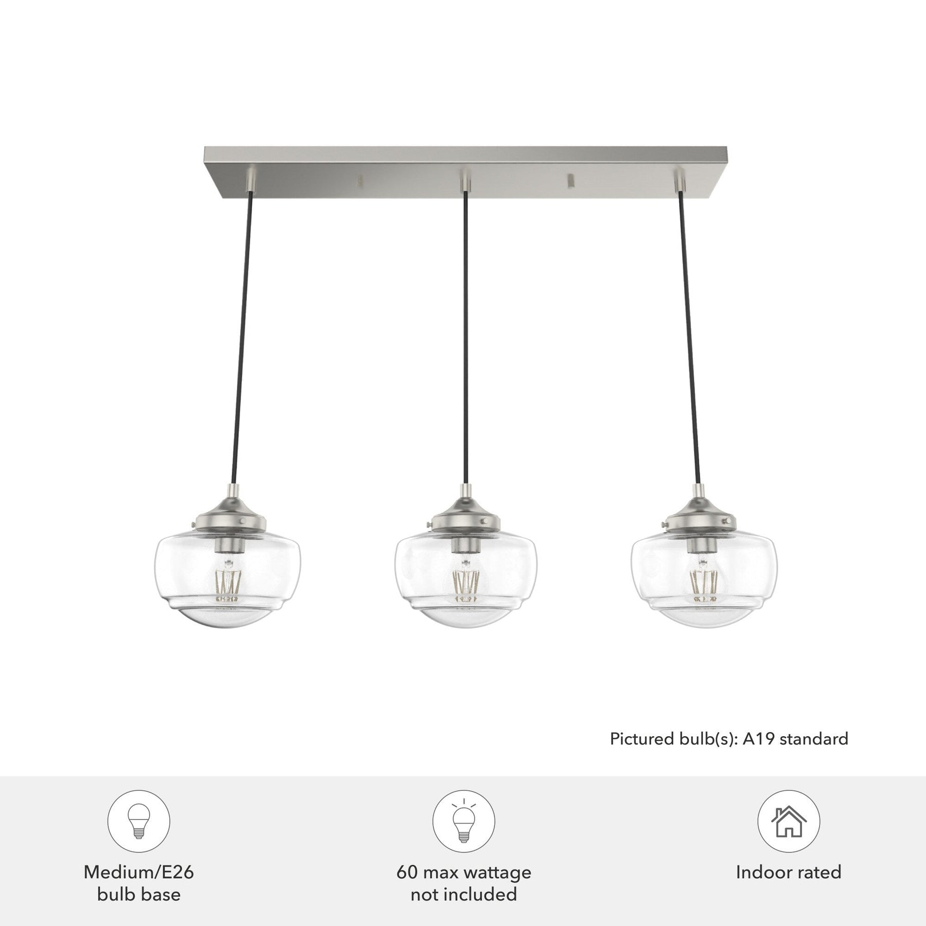 A: The fixture uses three E26-base light bulbs. It is recommended to use A19 standard bulbs, each with a maximum wattage of 60 watts or the LED equivalent.