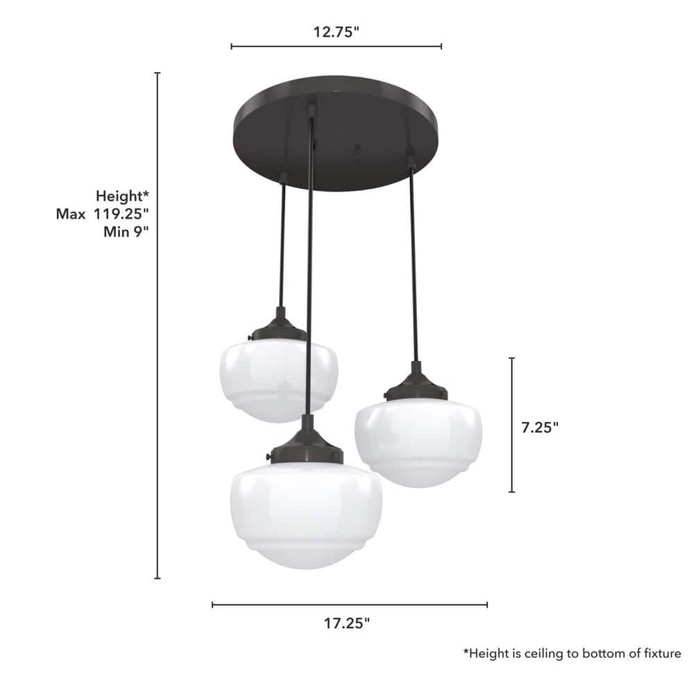 The Hunter Saddle Creek 3-Light Chandelier in noble bronze combines vintage schoolhouse charm with modern elegance. Featuring cased white glass shades and a durable metal finish, this chandelier is ideal for adding a sophisticated touch to any living or dining space. With a flexible hanging length and easy installation, it is perfect for both DIY enthusiasts and pros.