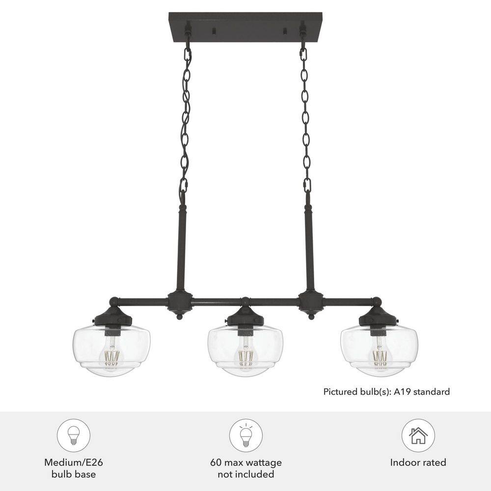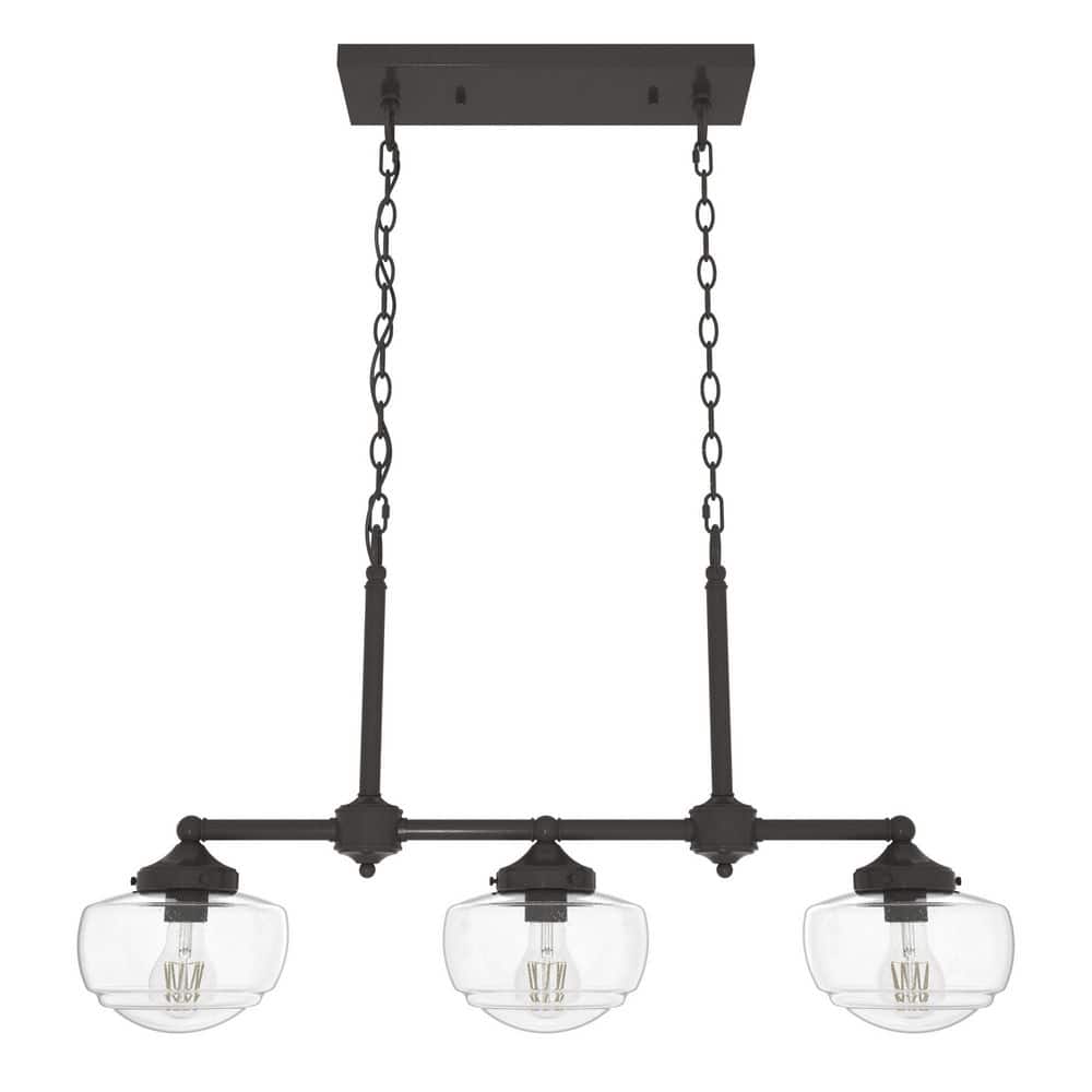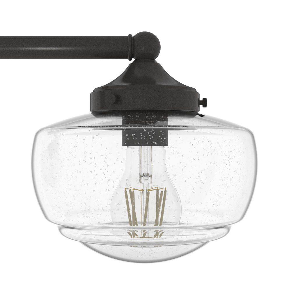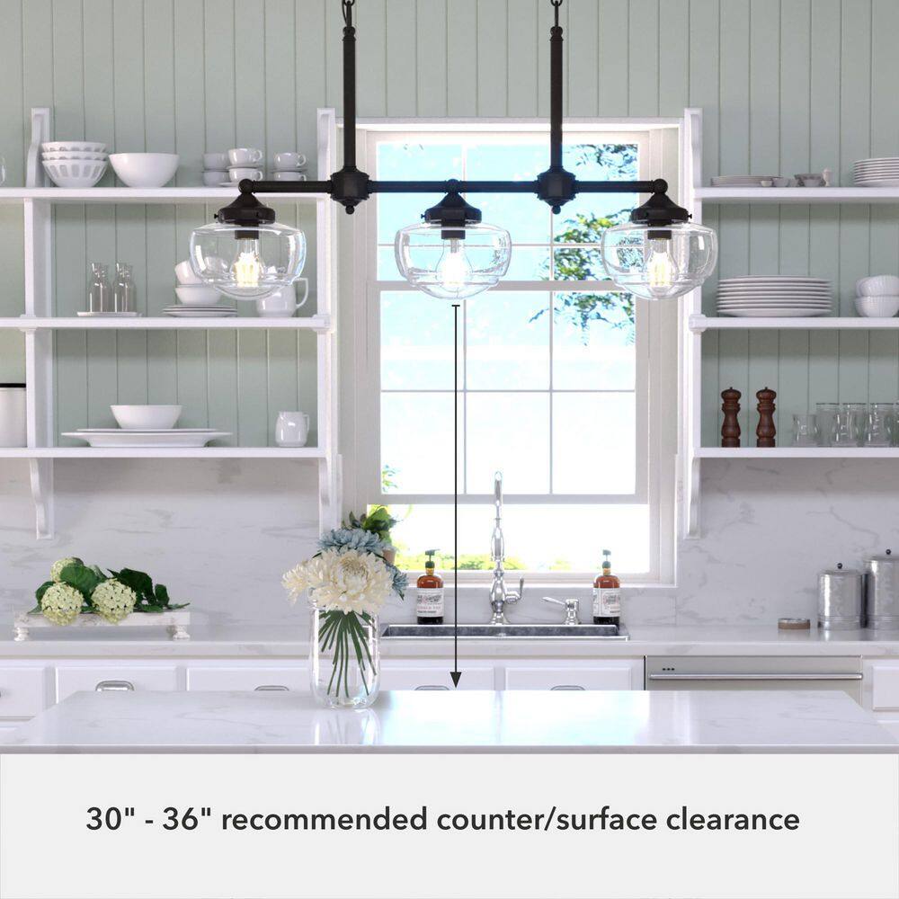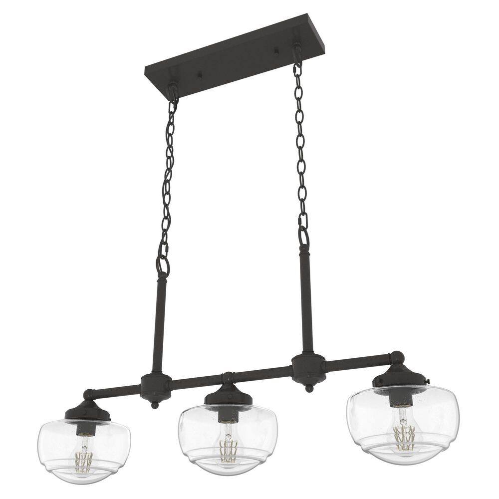 Illuminate your space with the Hunter Saddle Creek Chandelier, a perfect blend of modern and schoolhouse styles. With its noble bronze finish and clear seeded glass shades, this fixture adds a sophisticated touch to kitchens, dining rooms, and home offices. Designed for easy installation, it is both stylish and functional.