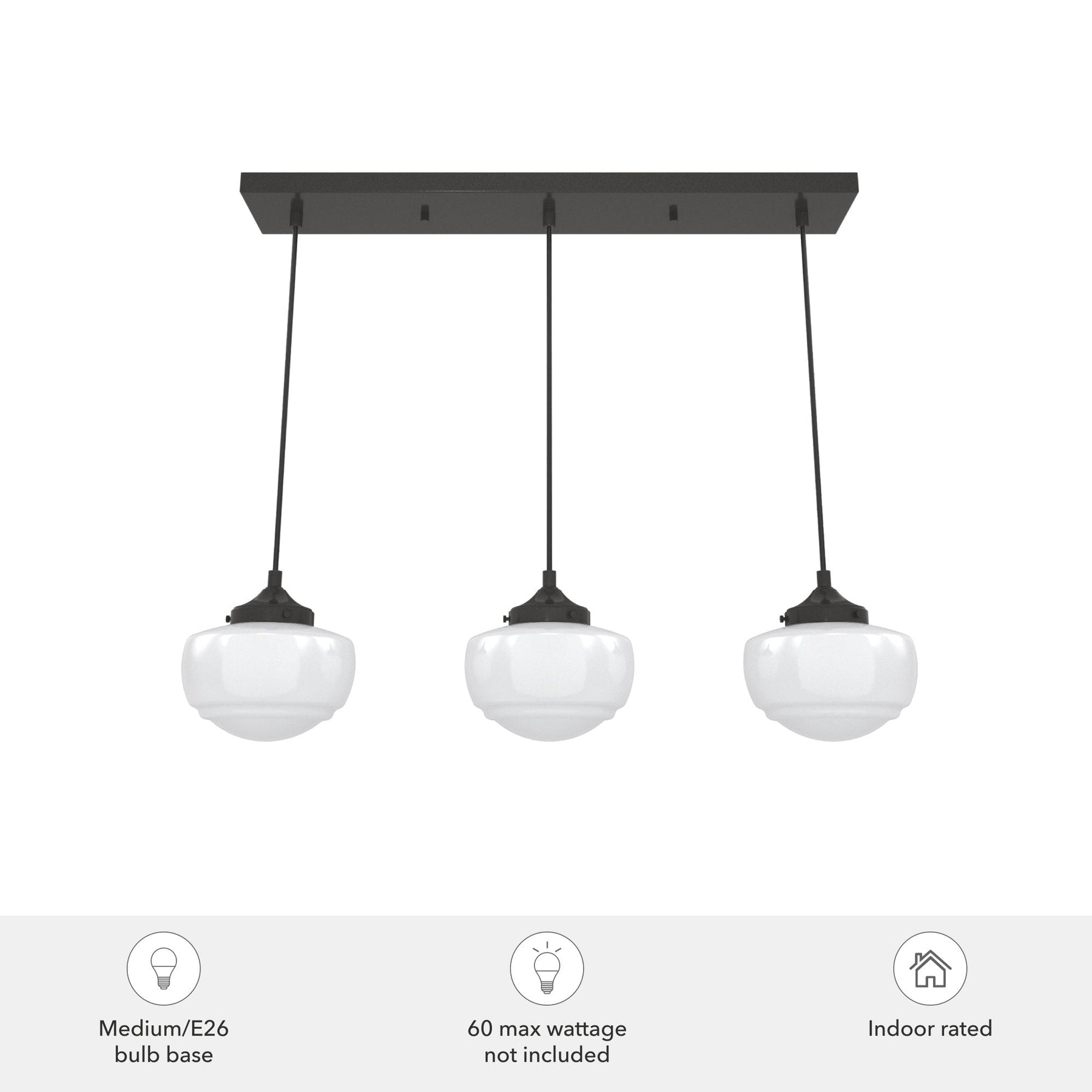 A: It requires three E26-base bulbs; A19 shape is recommended with a maximum of 60-Watts per bulb or the LED equivalent.