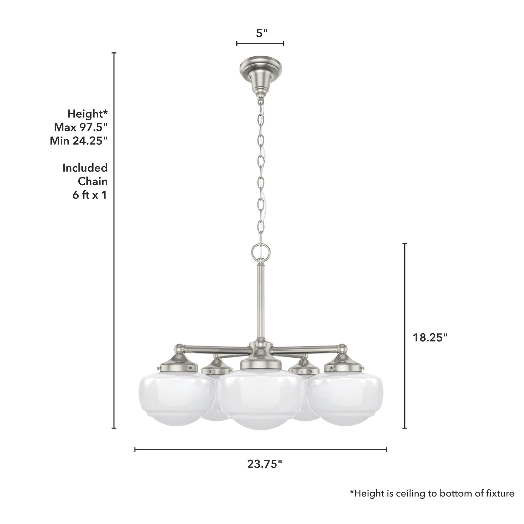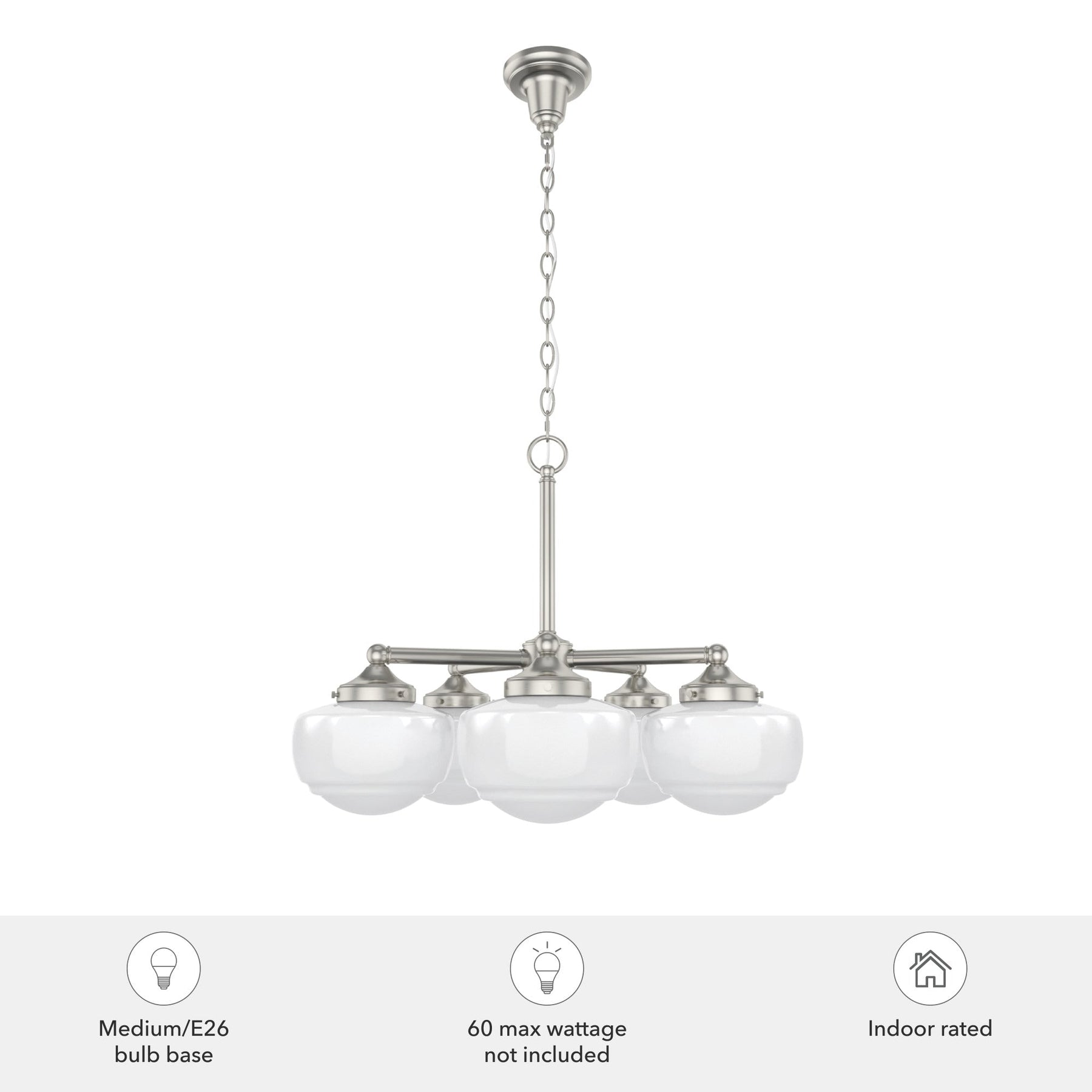 The Saddle Creek 5-Light Chandelier by Hunter transforms any room into a haven of understated elegance, with its brushed nickel finish juxtaposing beautifully against opal glass domes. This refined piece is more than just illumination; it's a statement. Inspired by the timeless charm of transitional design, this fixture acts as a centerpiece in dining rooms or a radiant accent in foyers. With its blend of tradition and innovation, the Saddle Creek Chandelier is a beacon of luxurious living, enveloping spaces in warmth and sophistication.