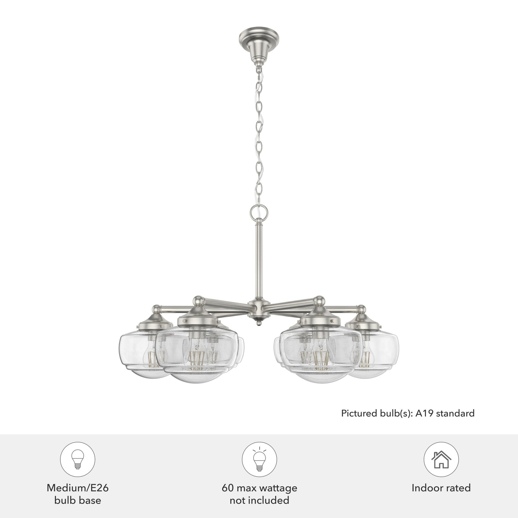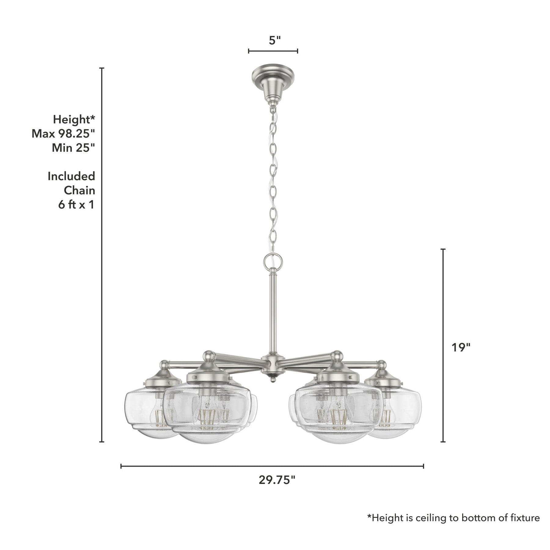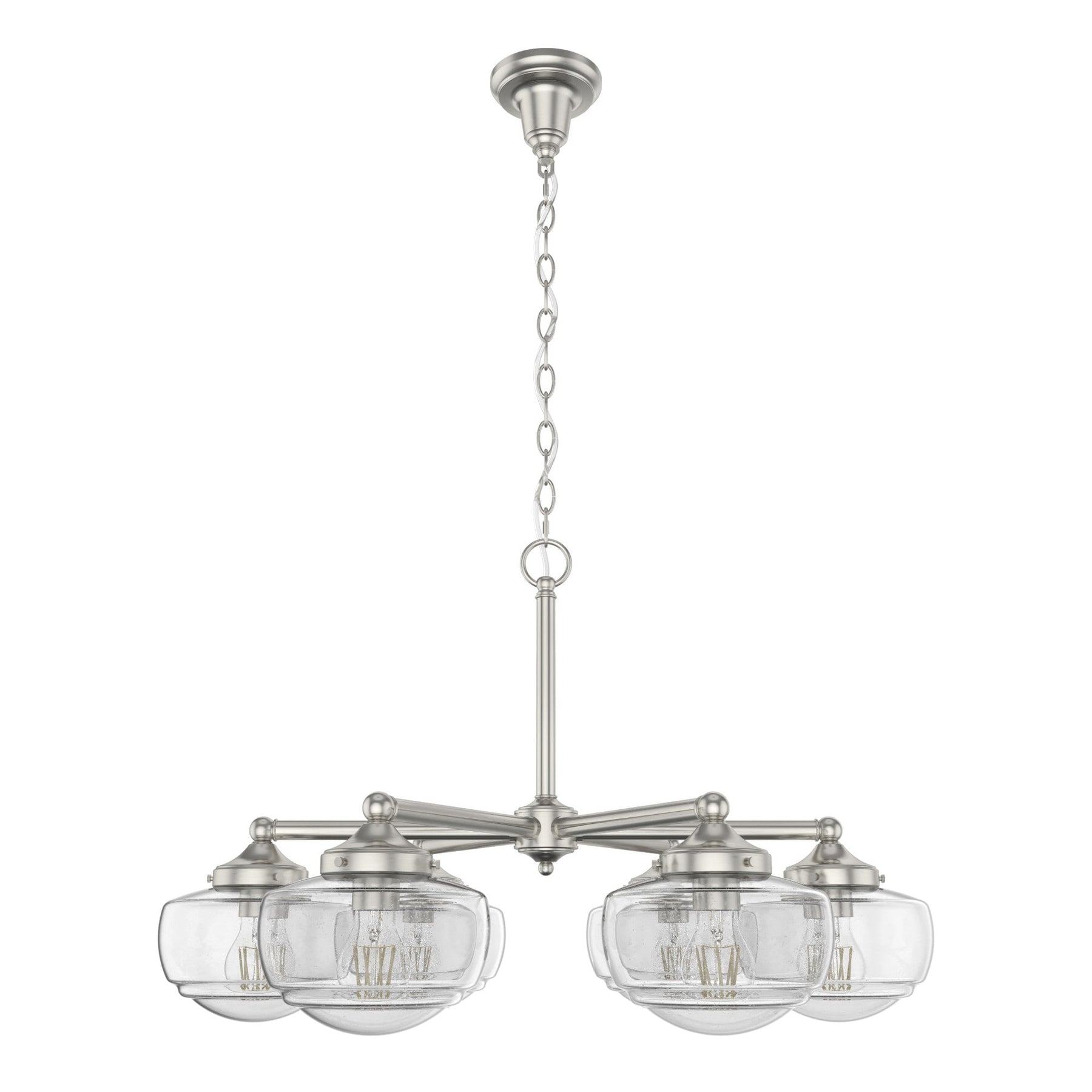 The Hunter Saddle Creek 6-Light Chandelier combines transitional elegance with modern LED capabilities, offering a brushed nickel finish that adds sophistication to any interior. Designed with six seeded glass shades and flexible height adjustments, it's perfect for illuminating kitchens, dining rooms, and living spaces with understated charm.