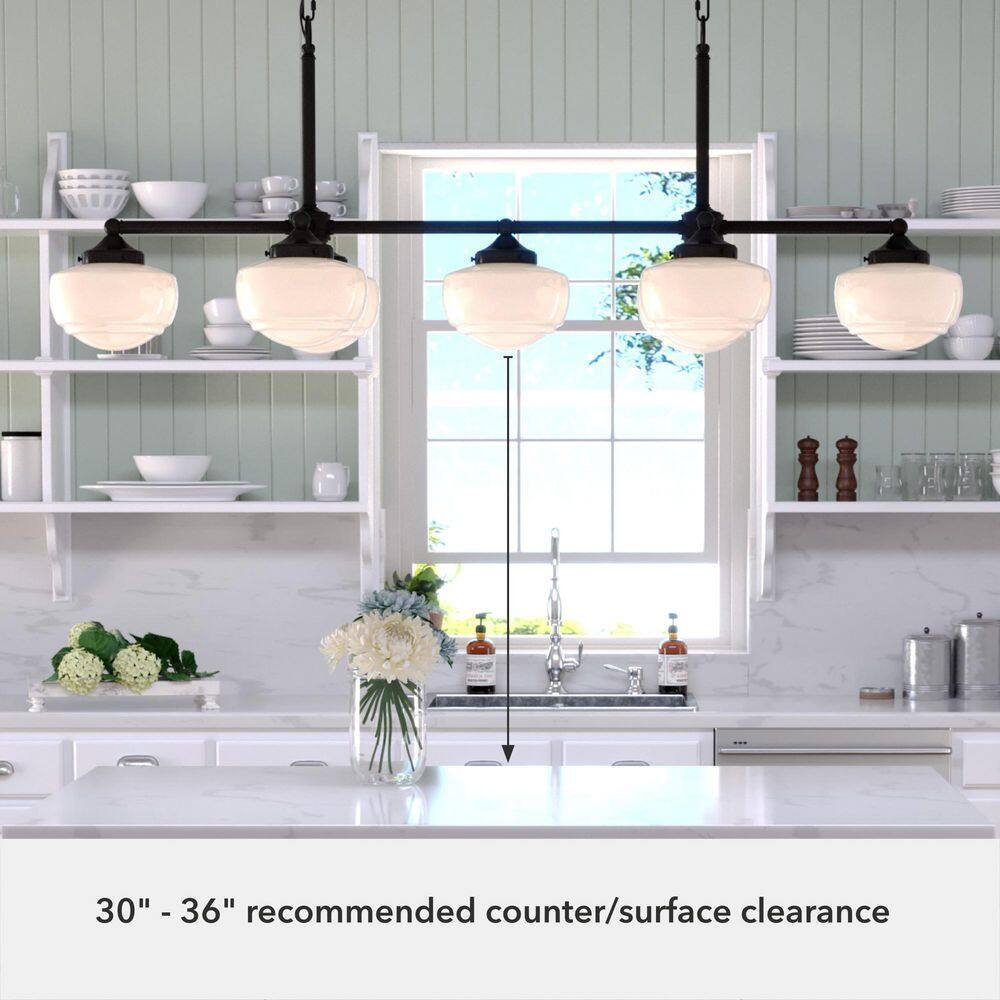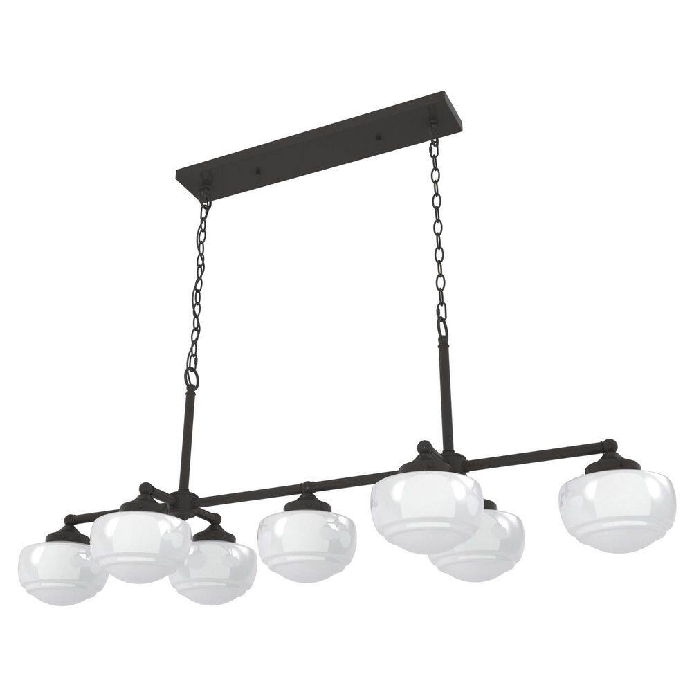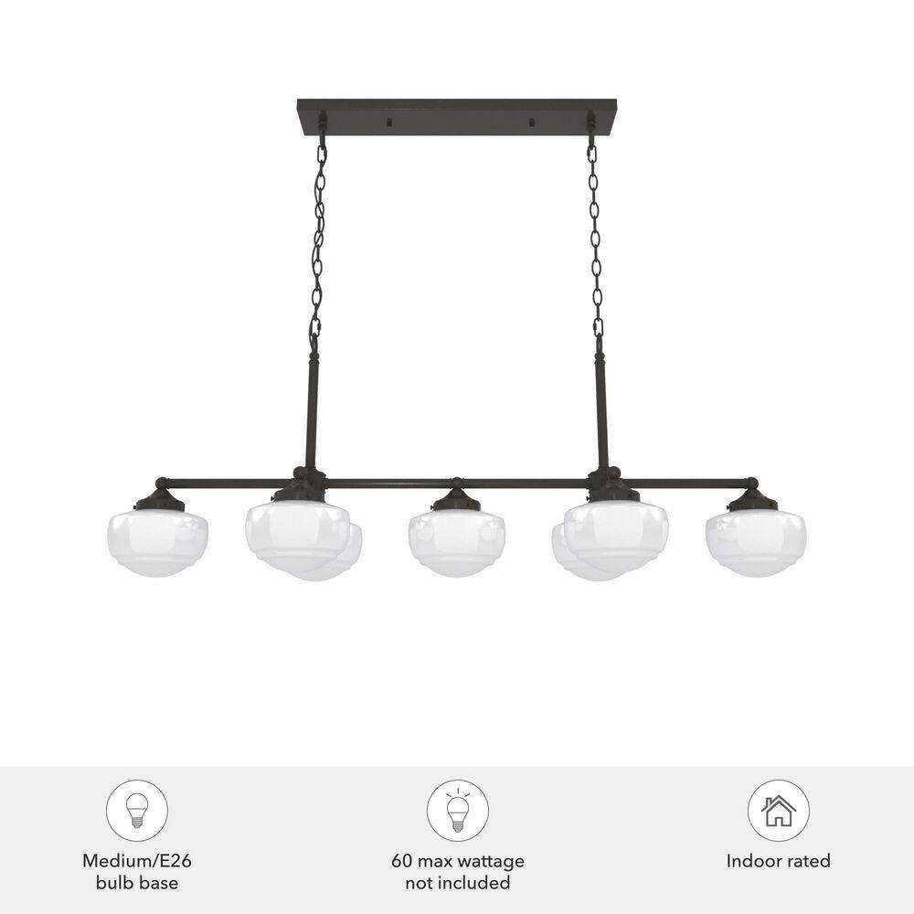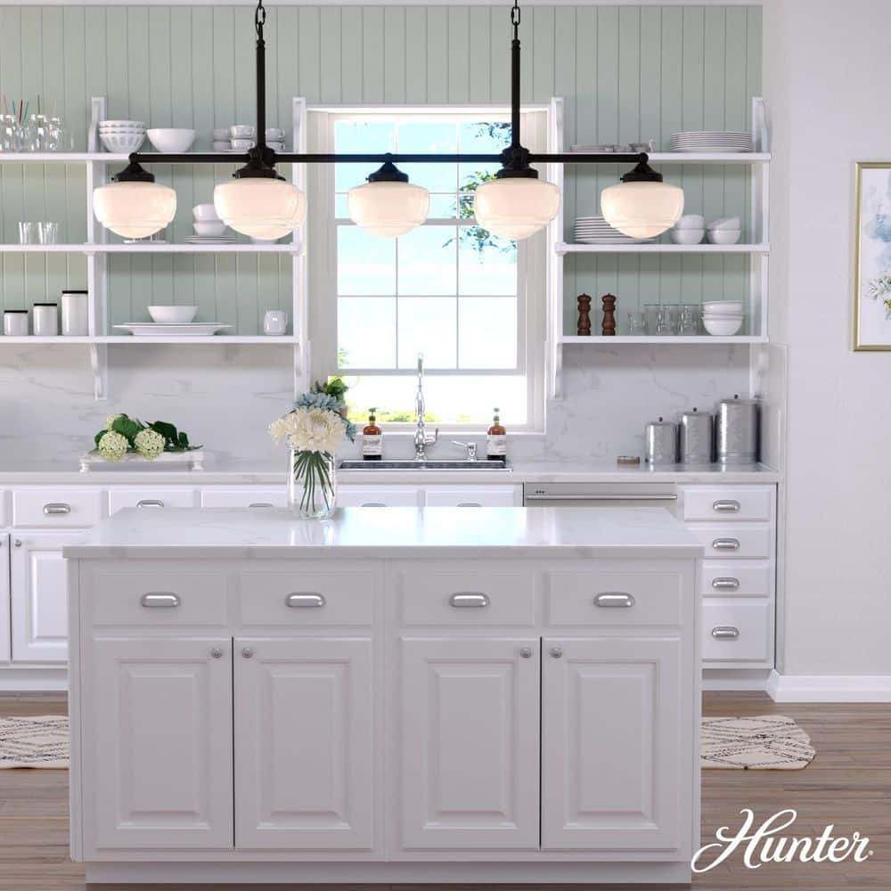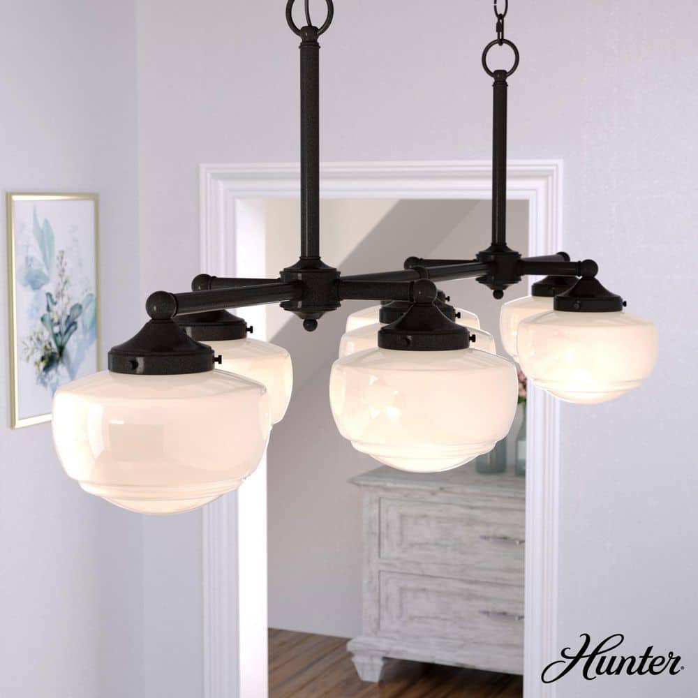 Illuminate any space with the Hunter Saddle Creek 7-Light Noble Bronze Chandelier, defined by its elegant fusion of vintage schoolhouse style and modern design. The cased white glass shades complement the noble bronze finish, offering a versatile look fit for both formal dining rooms and casual kitchen islands. A truly transitional piece, it combines tradition with contemporary flair.