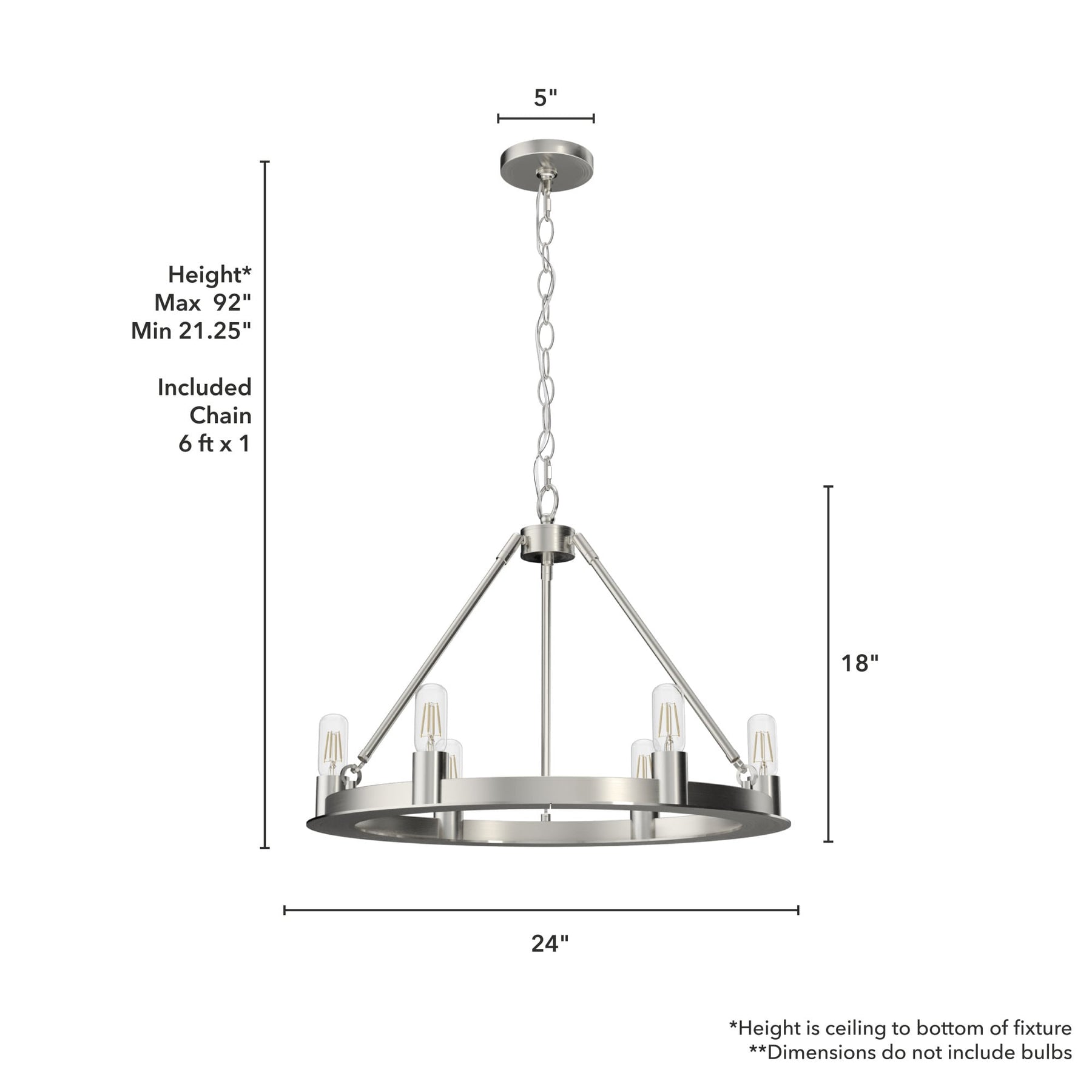 Enhance your space with the Hunter Saddlewood 6-Light Chandelier, featuring a brushed nickel finish and a transitional design perfect for various room settings. Its adjustable chain offers versatile hanging options, while the fixture accommodates six LED bulbs for customizable ambiance. Ideal for kitchens, dining areas, and living rooms, this chandelier combines classic charm with modern functionality.
