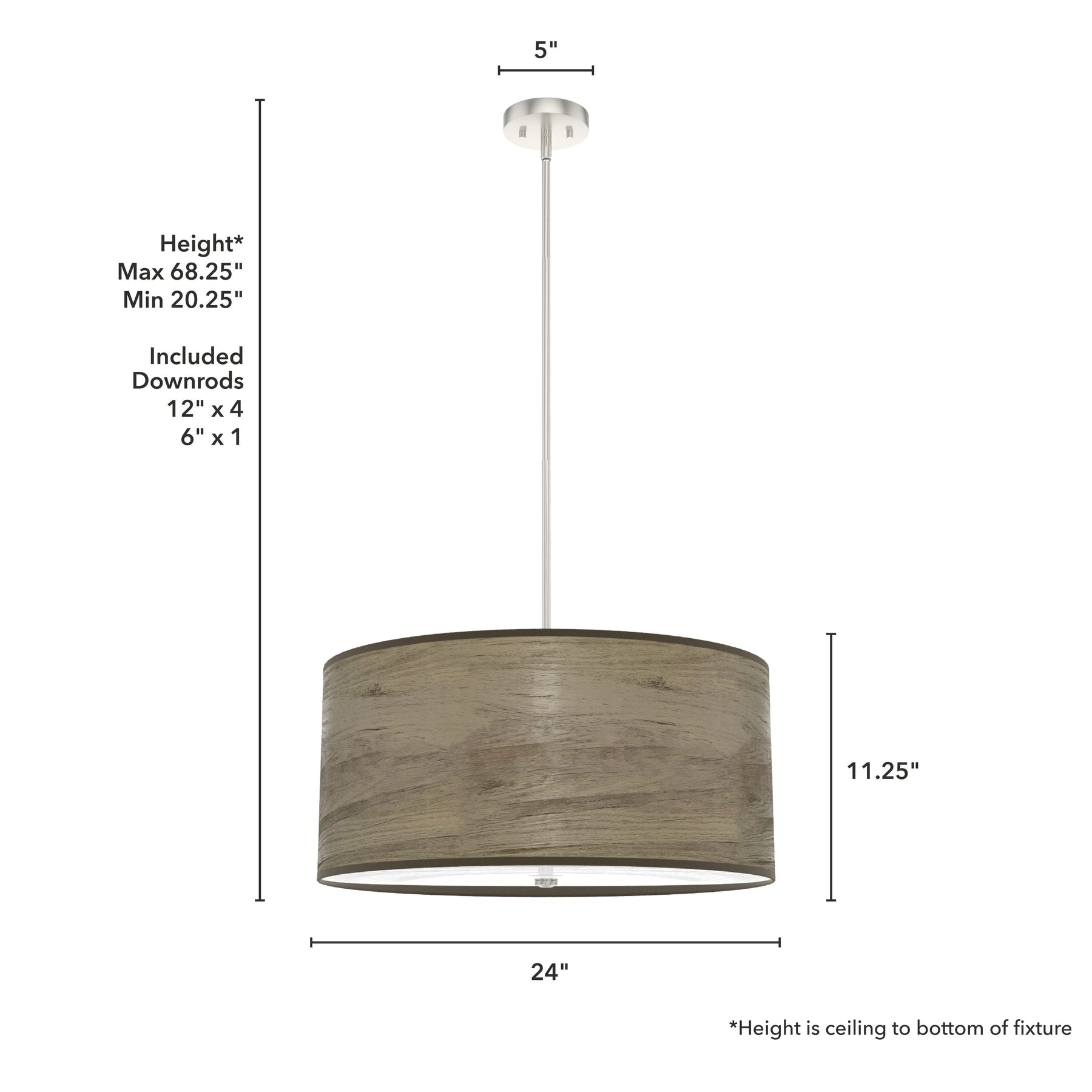 A: The Solhaven light comes with one 6-inch and four 12-inch downrods, allowing you to adjust the height from 20.25 inches to 68.25 inches to suit your ceiling height.