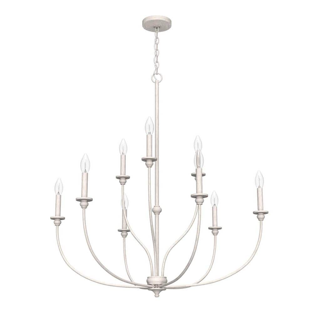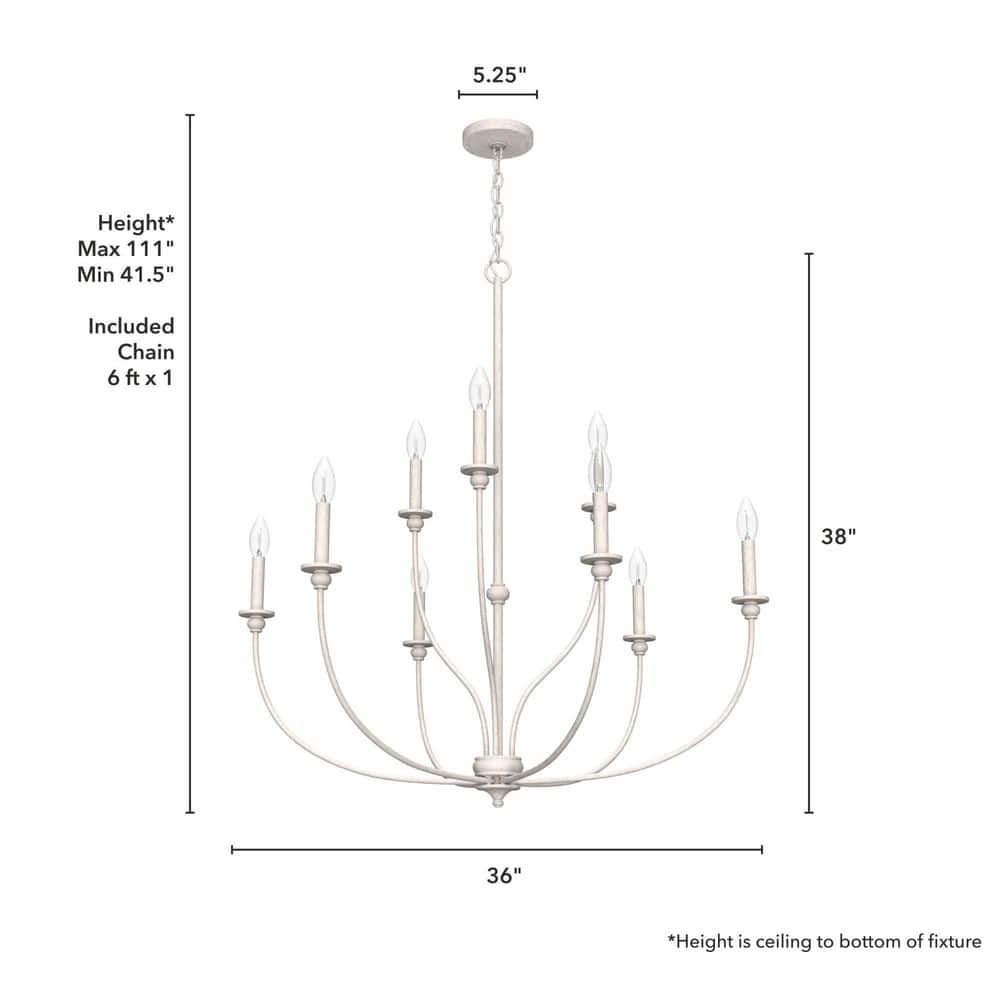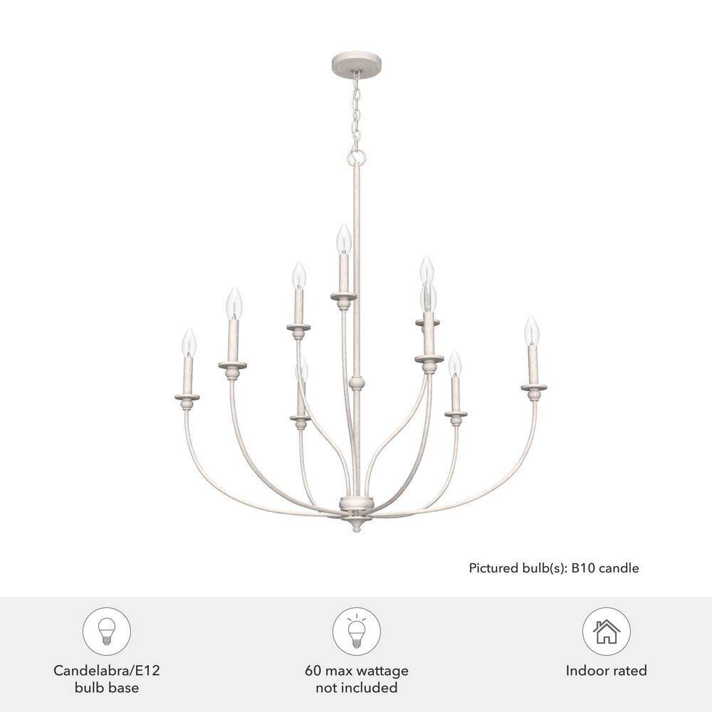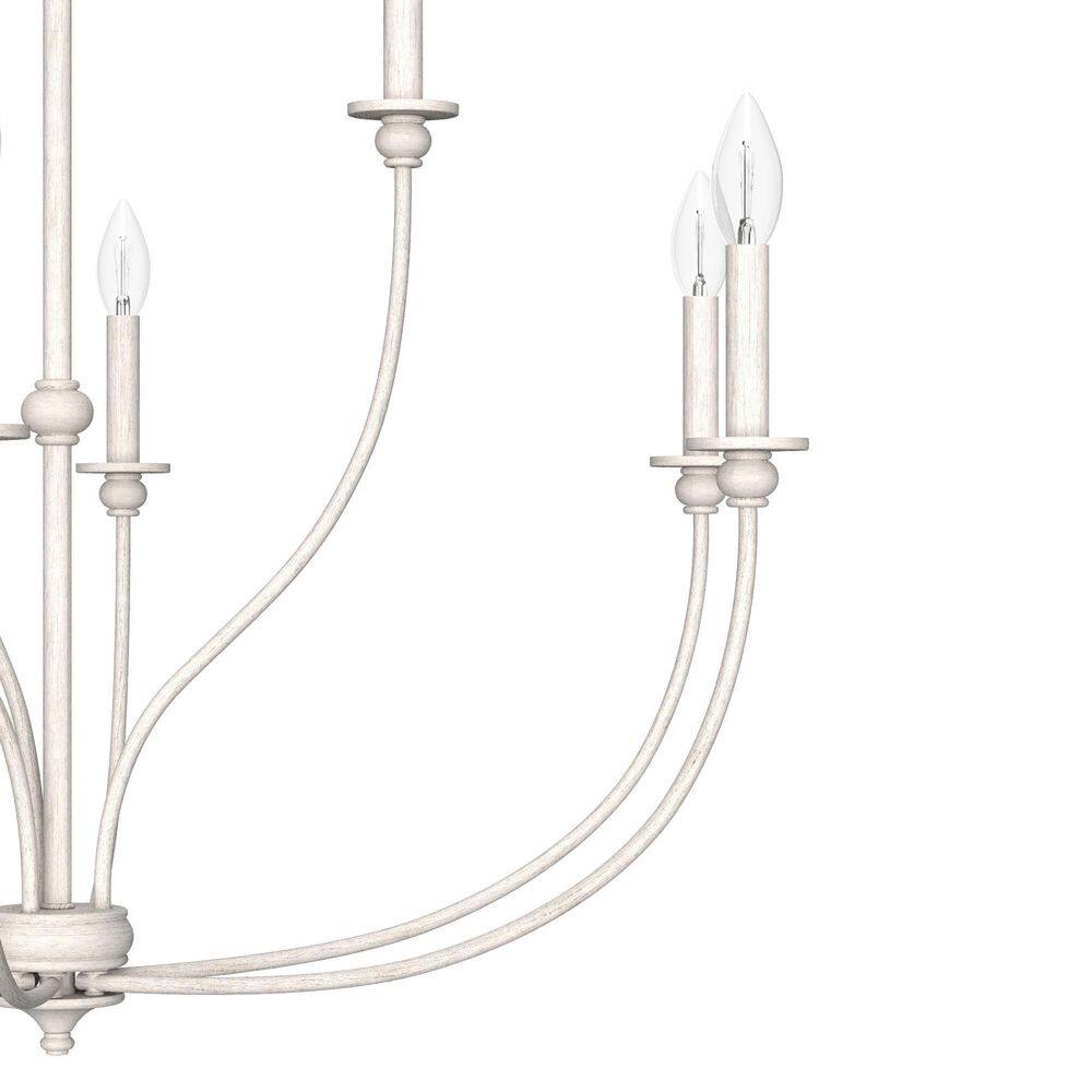 Illuminate your space with the timeless elegance of the Hunter Southcrest 9-Light Chandelier. Featuring a distressed white finish, this two-tier chandelier embodies classic cottage style with its candelabra-inspired design. Perfect for adding a vintage touch to dining rooms, foyers, or living areas, this fixture offers both durability and aesthetic appeal.