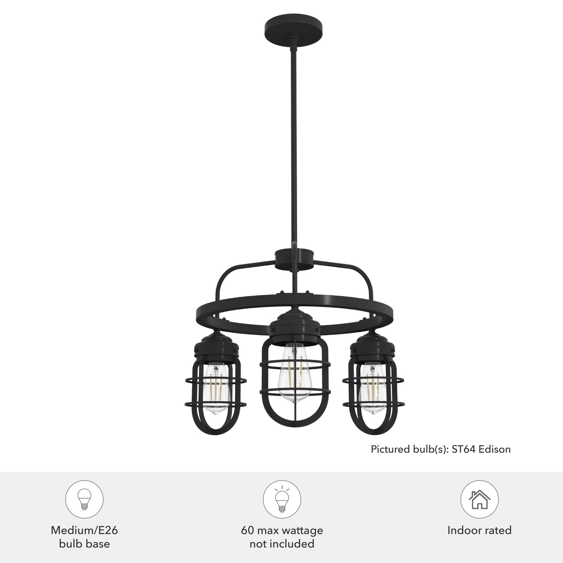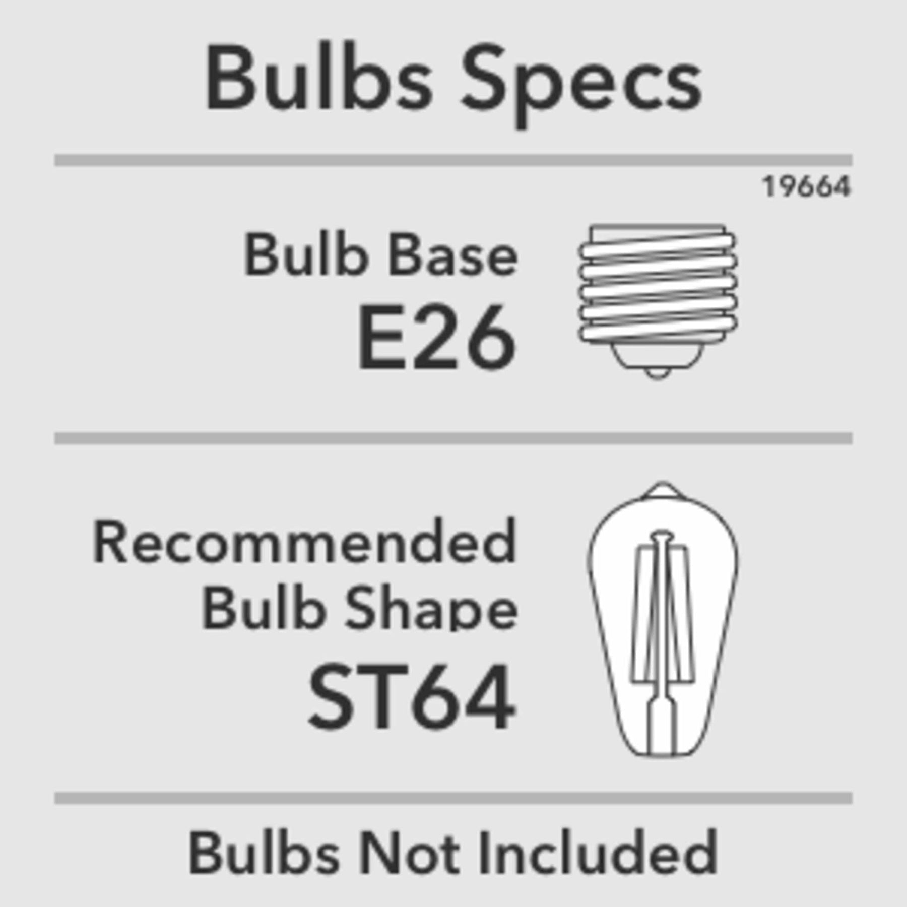 A: The Starklake uses three E26-base bulbs, each with a maximum of 60 watts or equivalent in LED. Bulbs are not included.