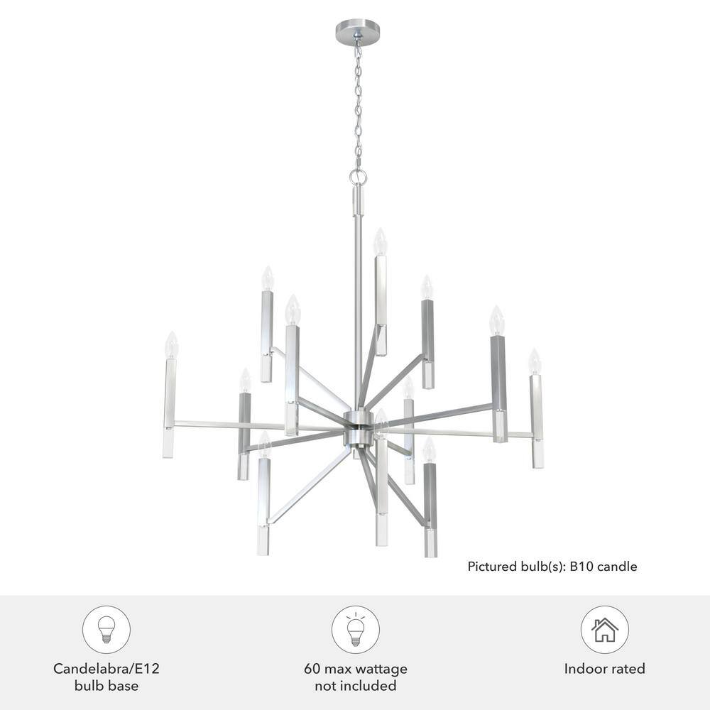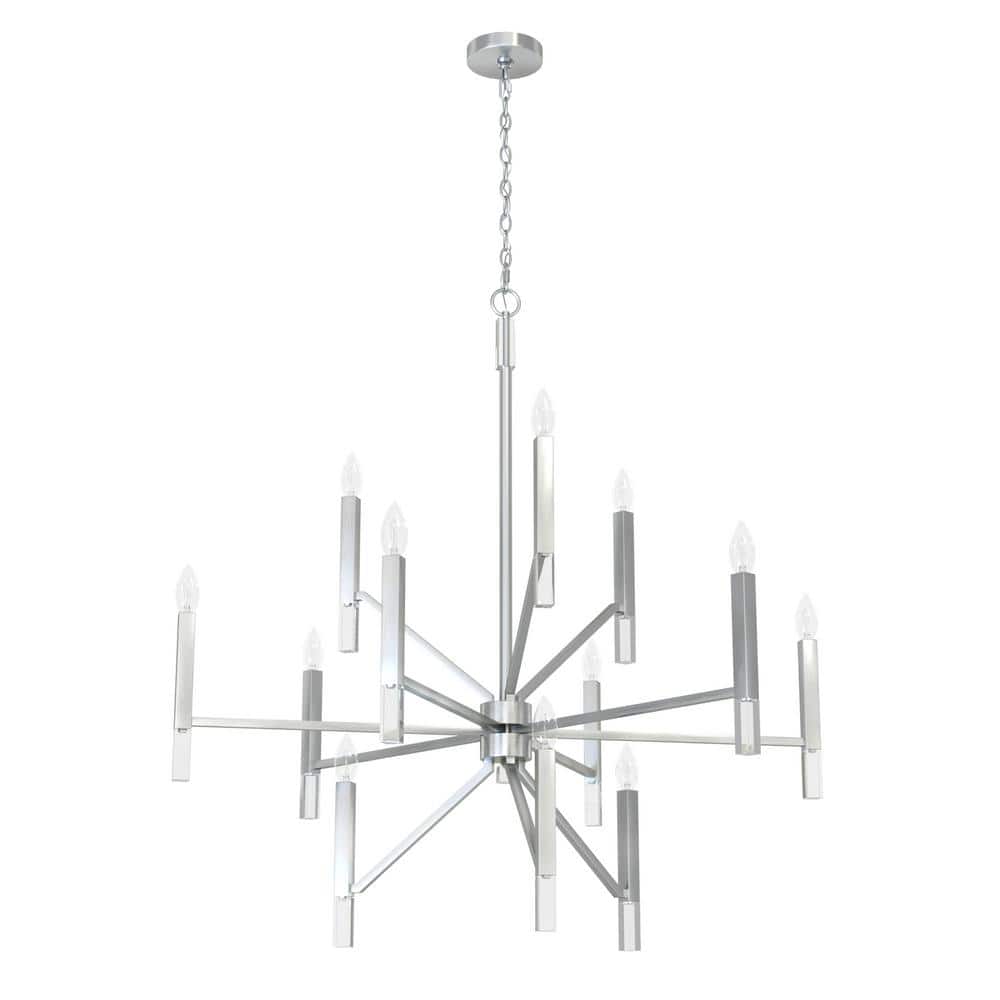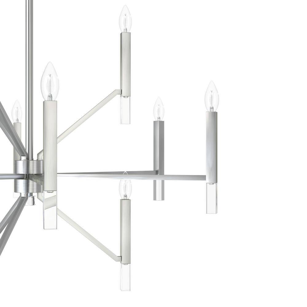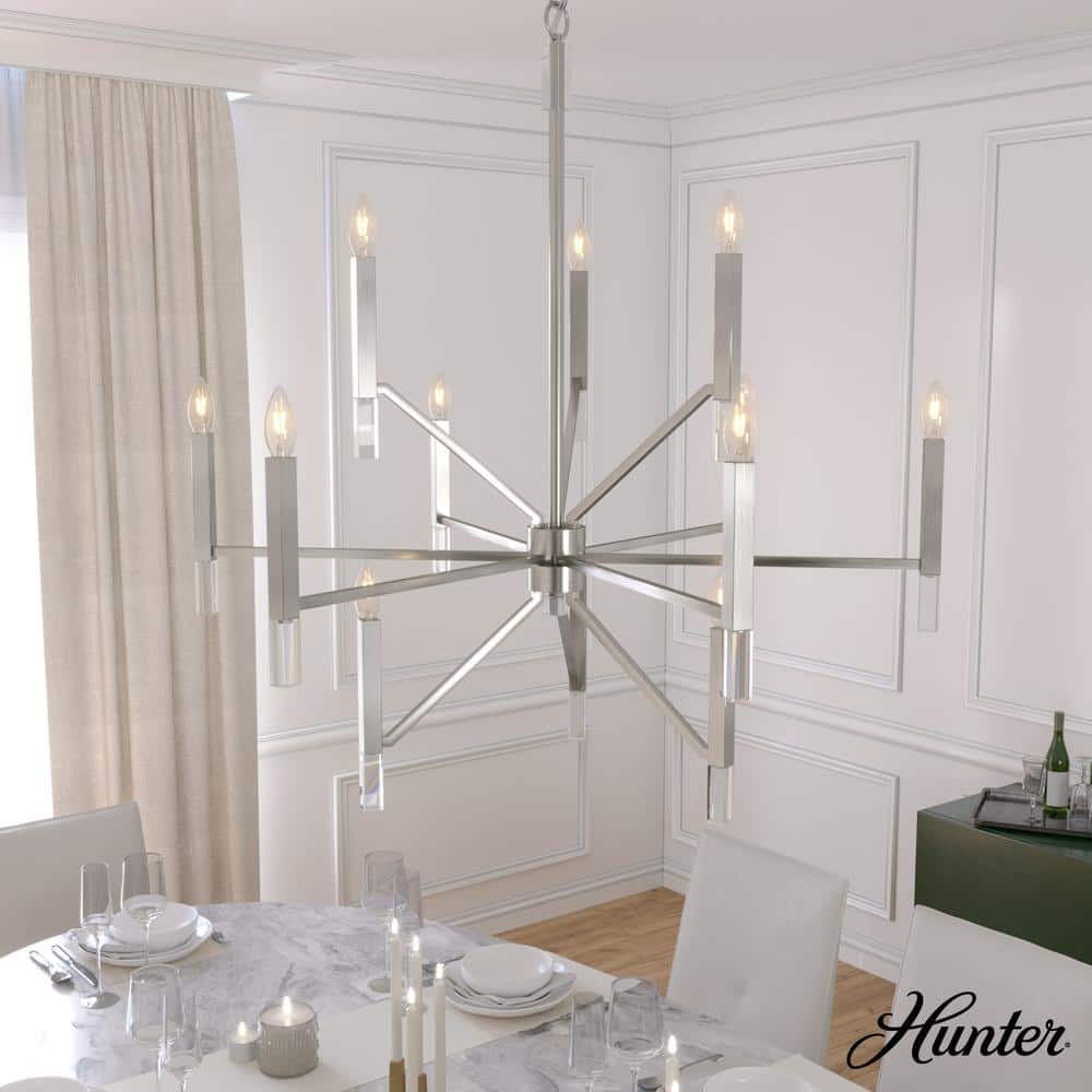 Illuminate your space with the Hunter Sunjai 12-Light Brushed Nickel Chandelier. This elegant chandelier features a striking 3-tier design with jewel-like accents, creating a cascade of light for living rooms, dining areas, and more. Built with premium materials, it ensures durability and a long lifespan, enhancing any room with its timeless beauty.