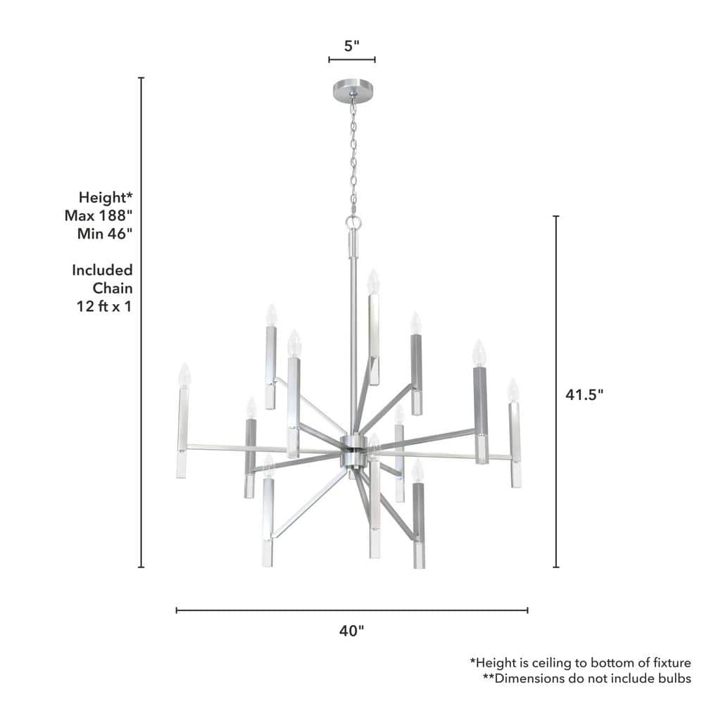 A: The chandelier uses twelve E12-base light bulbs, and B10 candle bulbs are recommended. Each bulb can be up to 60 watts or the LED equivalent.