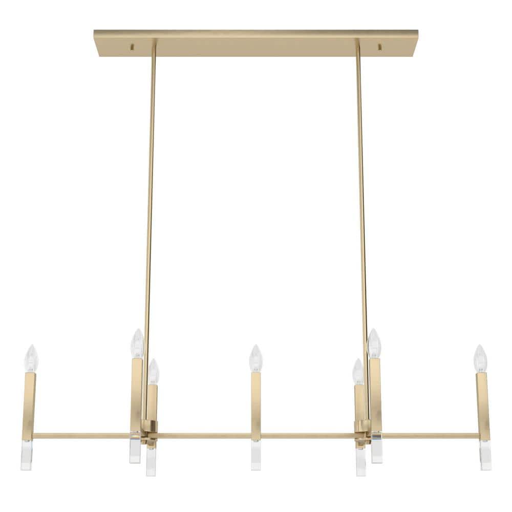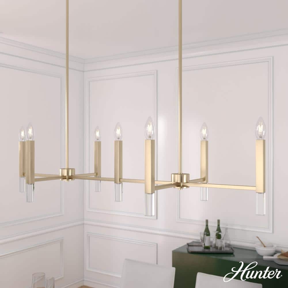 The Hunter Sunjai 7-Light Alturas Gold Candlestick Chandelier is a luxurious lighting solution that blends modern design with a touch of glamour. Its geometric adornments add sparkle to its clean-lined metal candles, making it a perfect centerpiece for kitchens and dining areas. Designed with versatility and style, it's a stunning addition to any home decor.