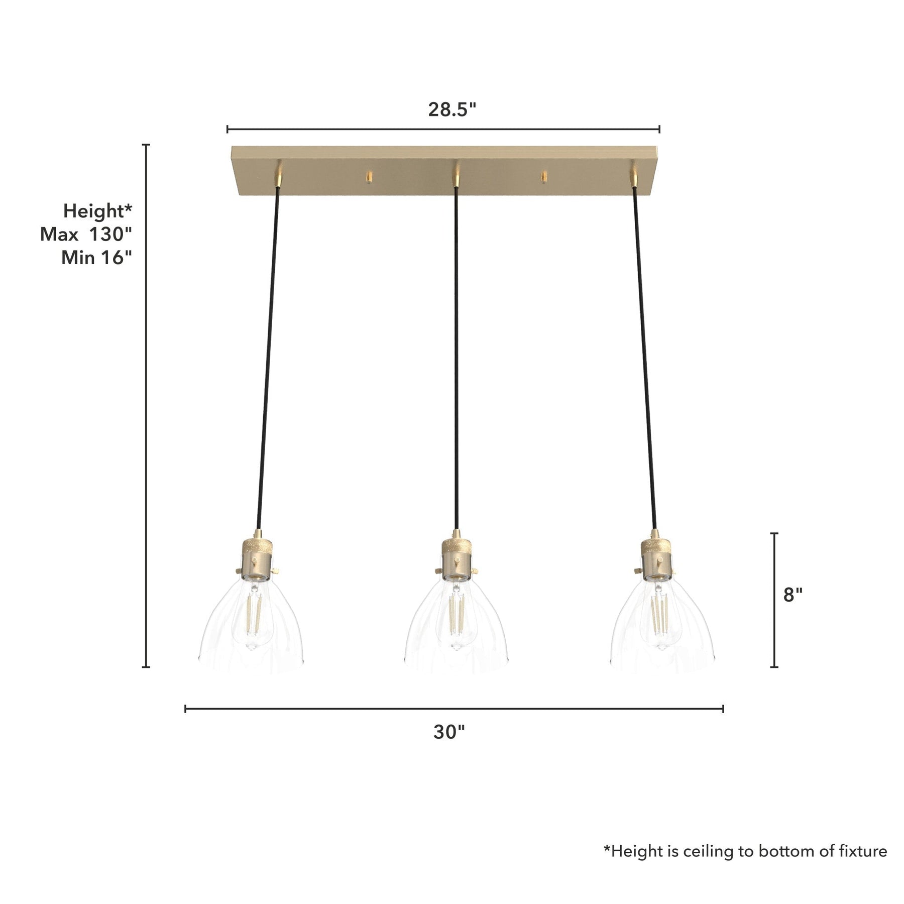 The Van Nuys Alturas Gold 3-Light Mini Pendant gracefully elevates any room with its chic blend of transitional design and industrial flair. Its clear glass shades emit a mesmerizing glow, transforming kitchen islands and dining tables into focal points of warmth and sophistication. Style it over a long dining table or in a lofty foyer to highlight its linear form and captivating allure. This stunning piece is a testament to luxurious yet functional lighting, blending seamlessly within modern and bohemian interiors.