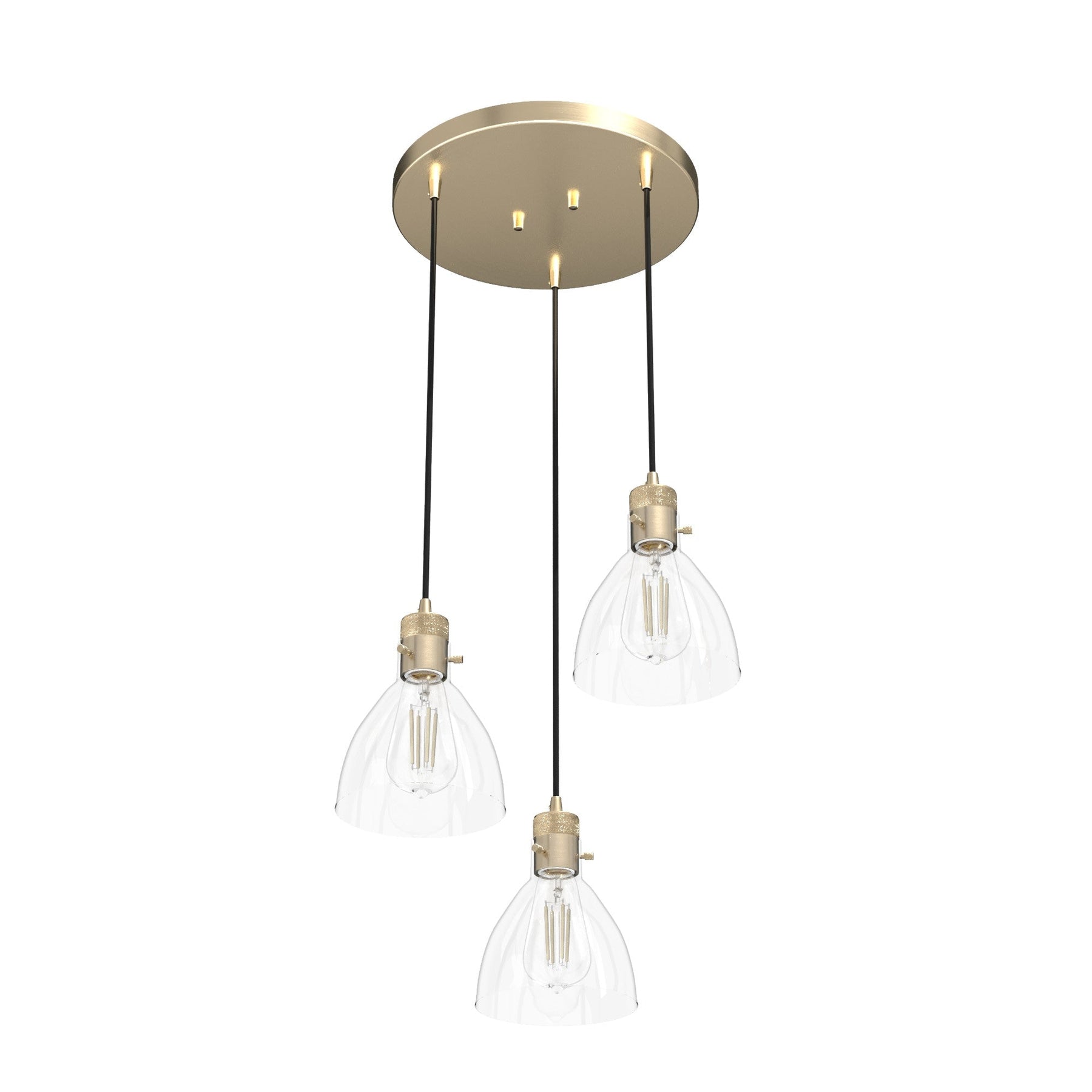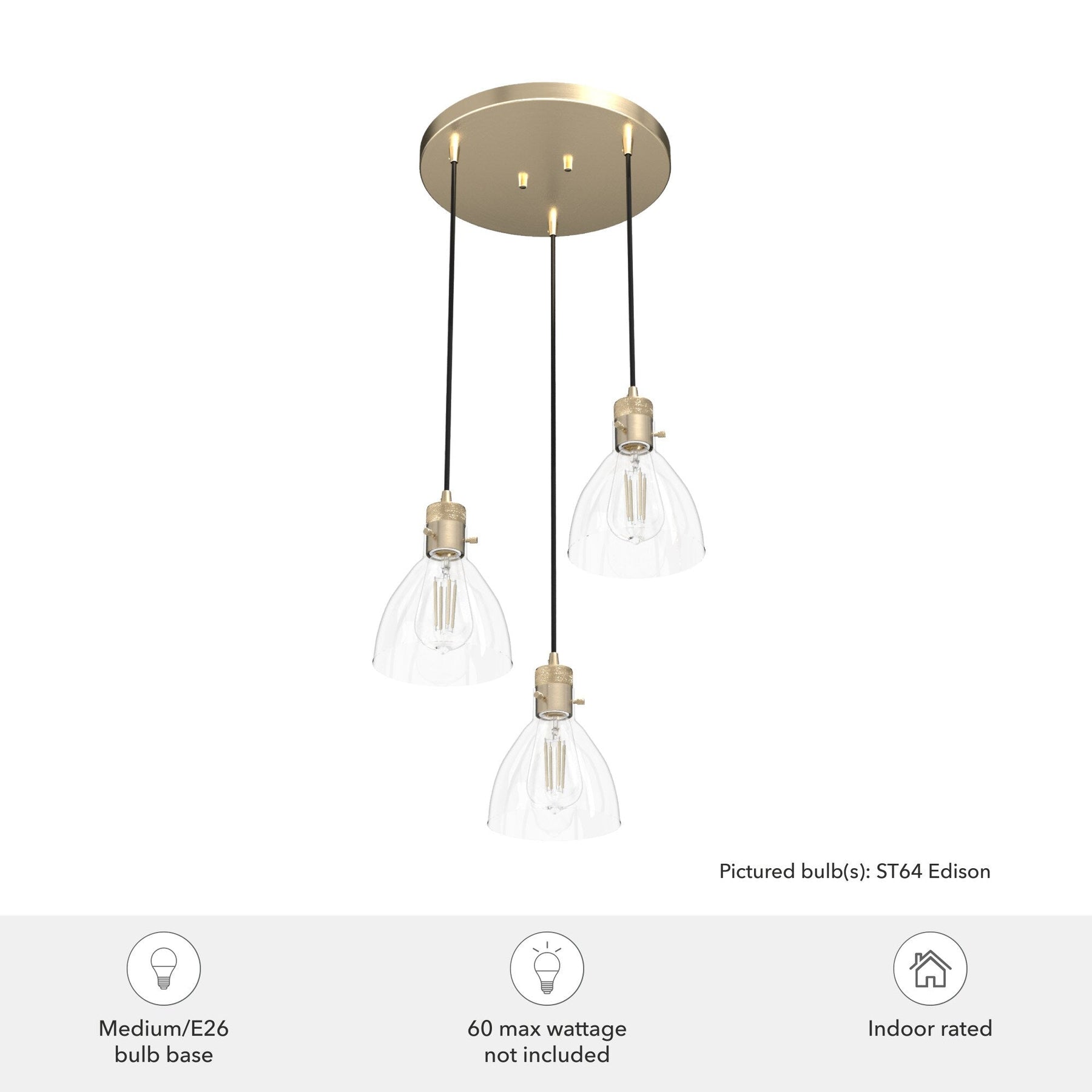 A: The pendant requires three E26-base light bulbs of either 60 watts each or the LED equivalent.