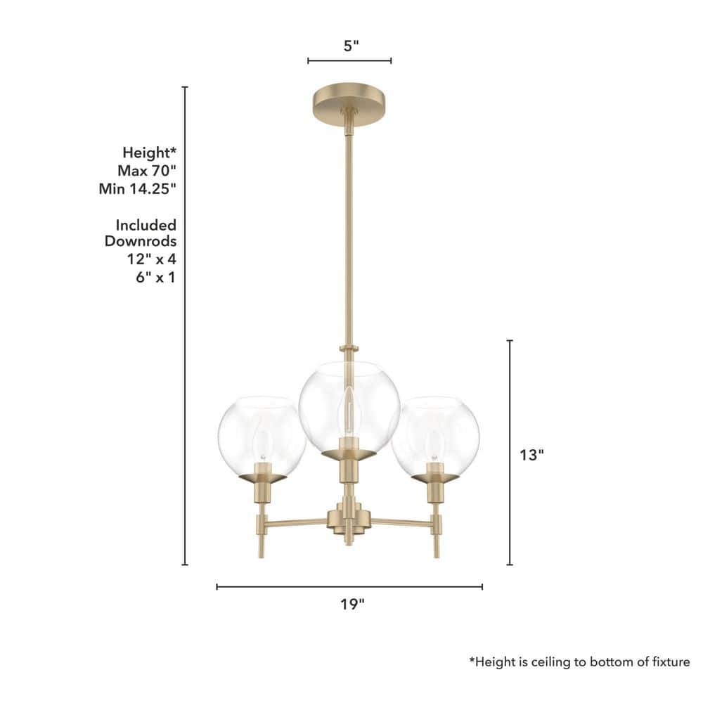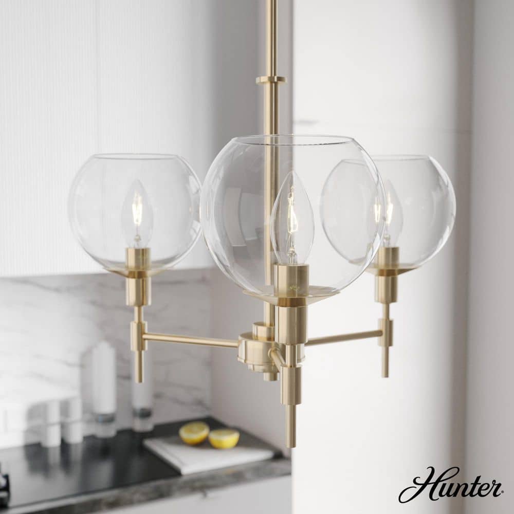 Transform your space with the exquisite Xidane 3-Light Alturas Gold Crystal Chandelier by Hunter. With its stunning mid-century modern design and gleaming clear glass shades, this chandelier illuminates kitchens, dining areas, or foyers. Crafted from durable metal and featuring a flexible hanging length for versatile placement, this fixture is perfect for adding a touch of elegance to any room.