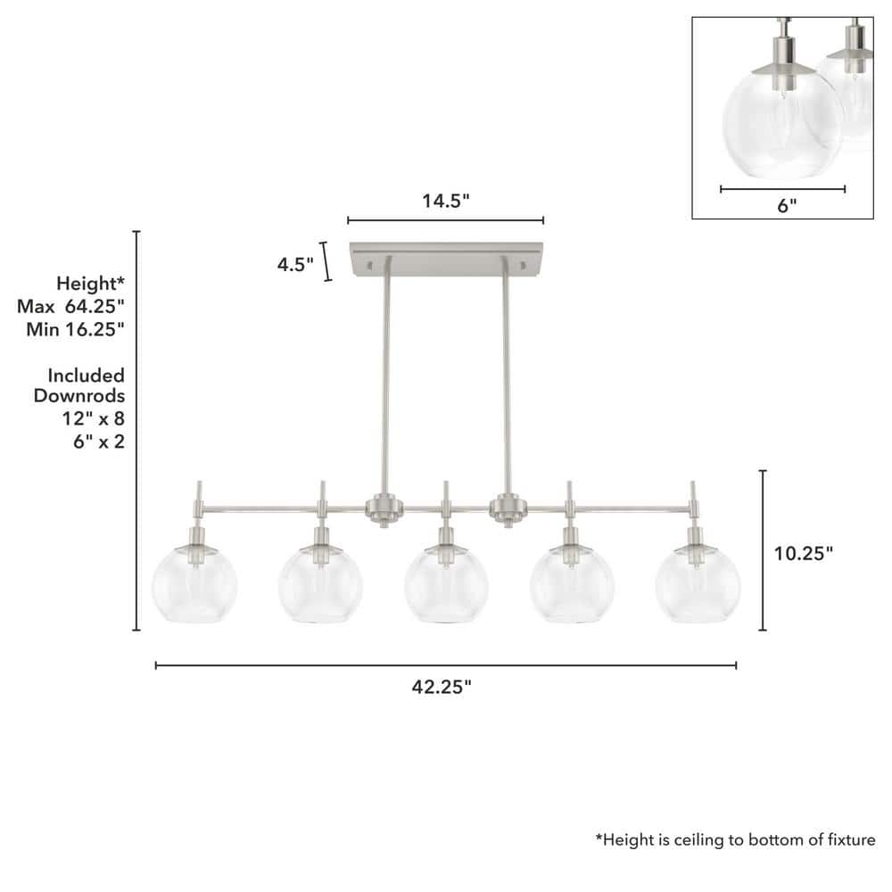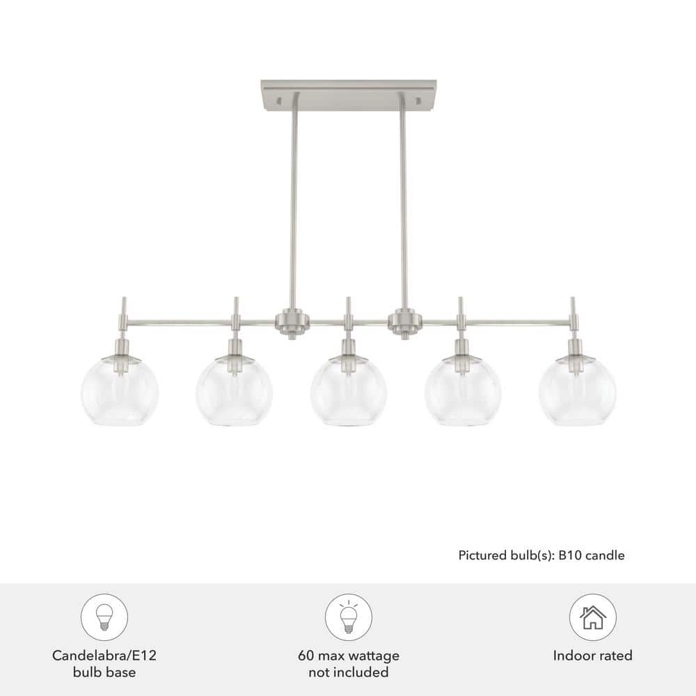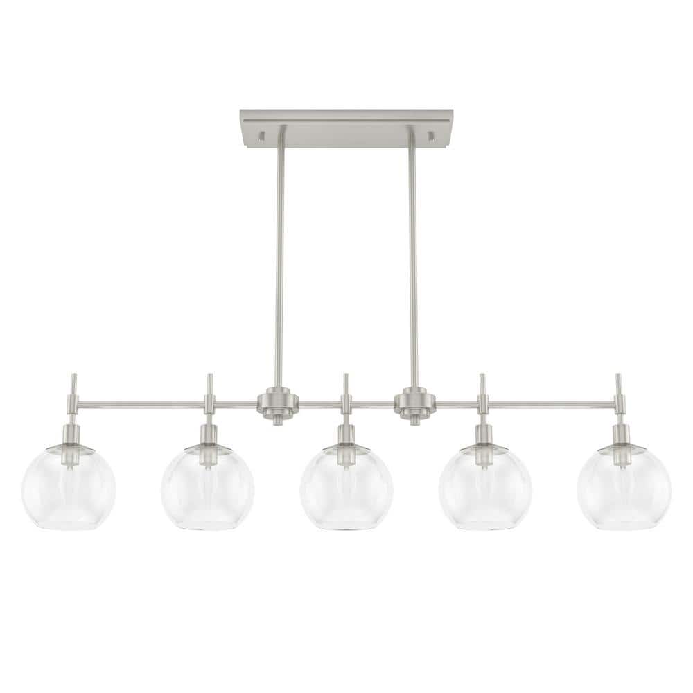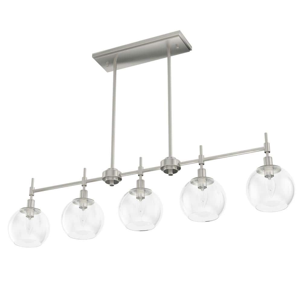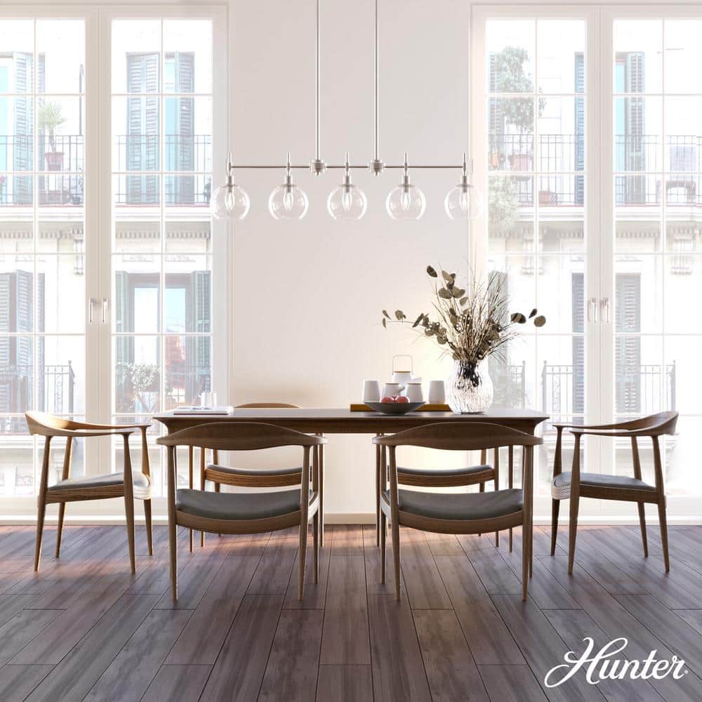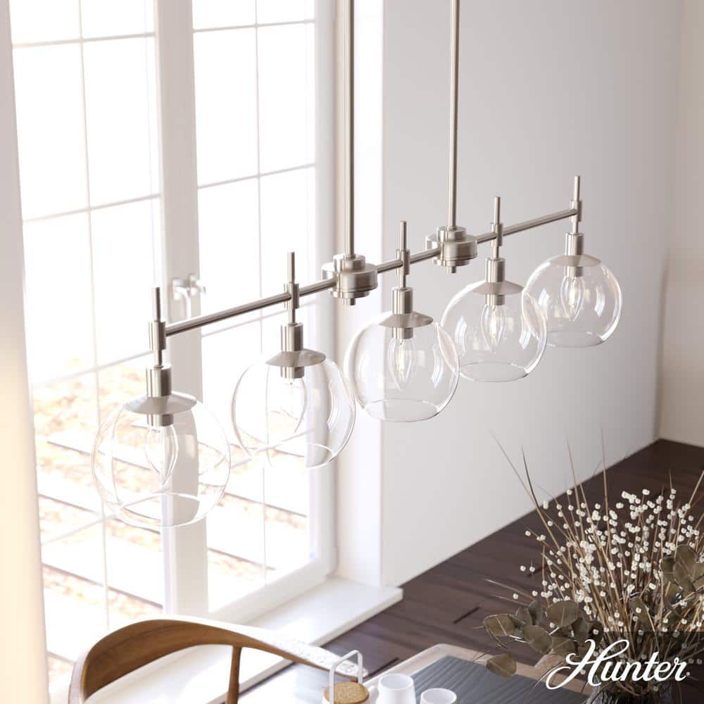 Illuminate your space elegantly with the Xidane 5-Light Billiard Chandelier by Hunter. This mid-century modern fixture features a brushed nickel finish and clear glass shades for a sophisticated flair, perfect for kitchens, dining areas, or living rooms. With its dimmable capability and adjustable hanging length, it's designed to adapt beautifully to your home's ambiance.