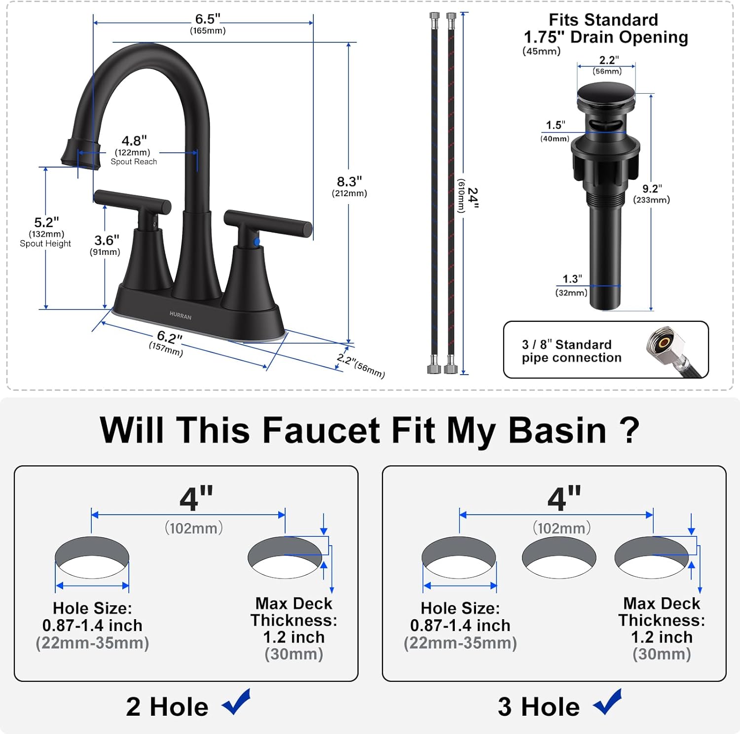 Matte Black 4 inch Centerset Bathroom Sink Faucet, Pop Up Drain, 2 Hot/Cold Water Supply Lines, No Flow Aerator, Installation Hardware, Instruction Manual |