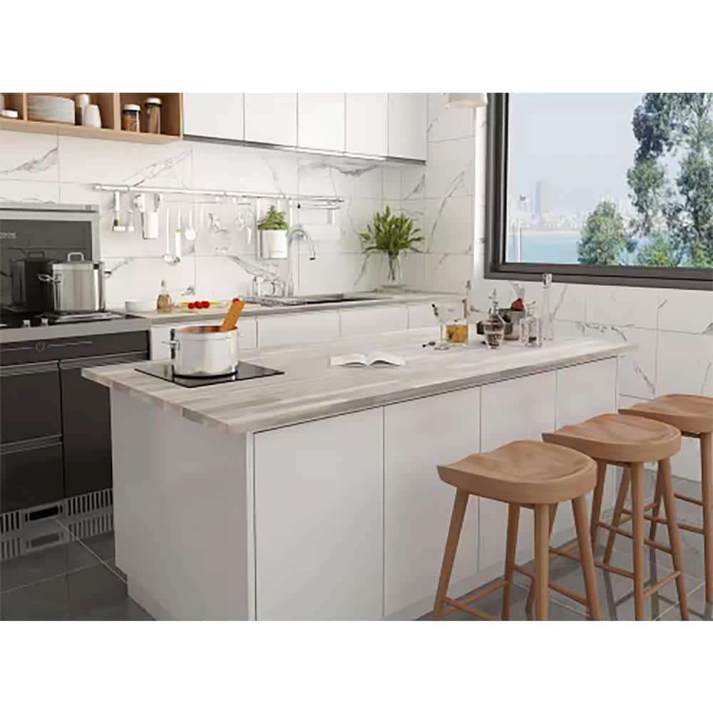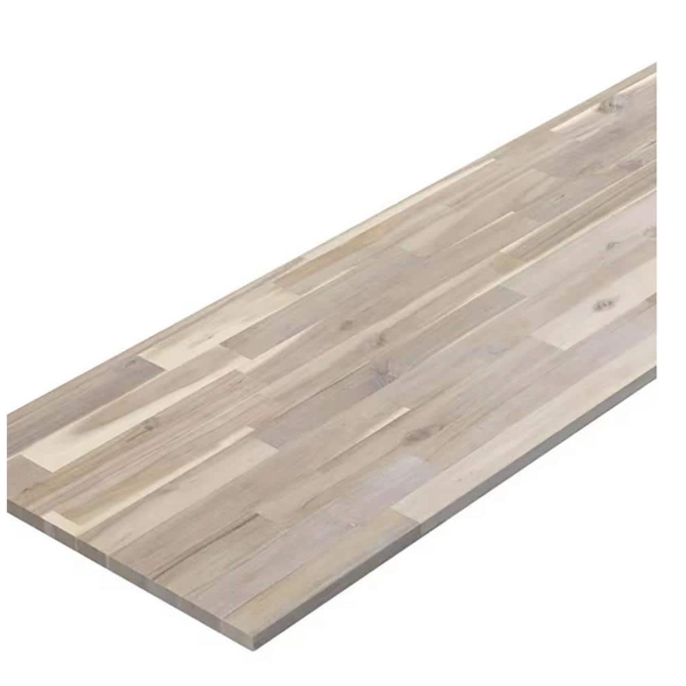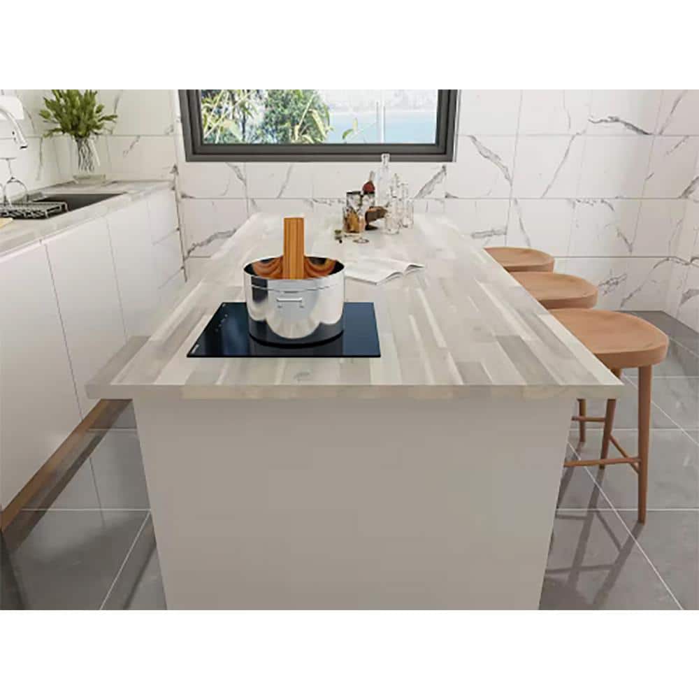 Enhance your kitchen with the Interbuild Acacia Butcher Block Island Countertop, finished in a sophisticated Organic White. Made from solid acacia hardwood, this countertop showcases finger-joined slats for a unique, rustic appeal. Its VOC-free hardwax oil finish ensures it's both food-safe and environmentally friendly.