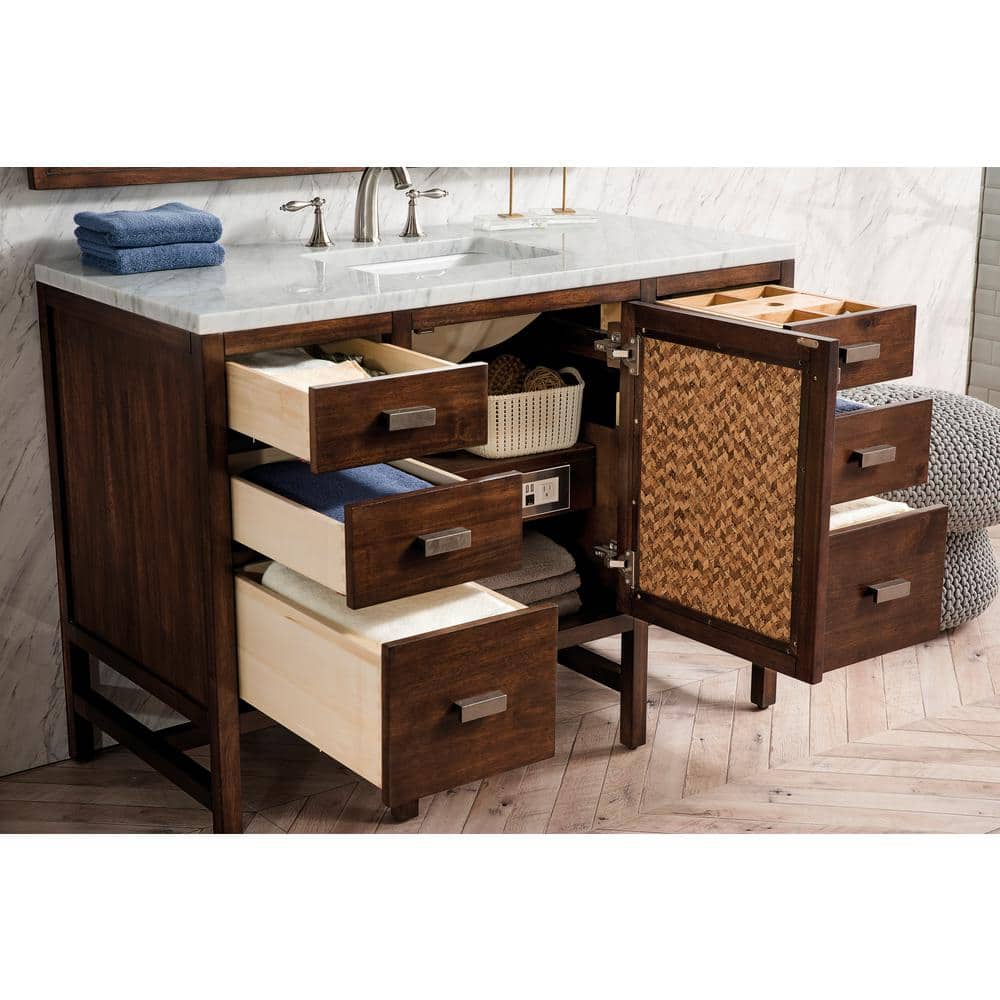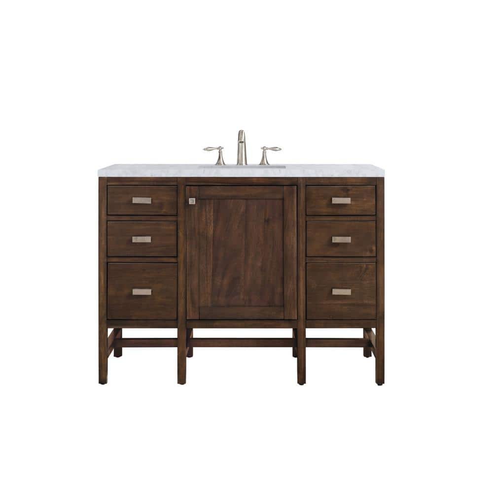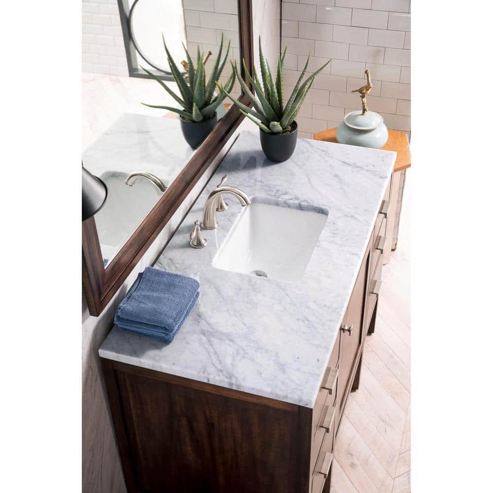 The Addison 48-inch Single Vanity by James Martin Vanities combines timeless Shaker-inspired design with modern functionality. Featuring a durable Carrara Marble top and a solid wood cabinet in a Mid-Century Acacia finish, this vanity offers both style and practicality.