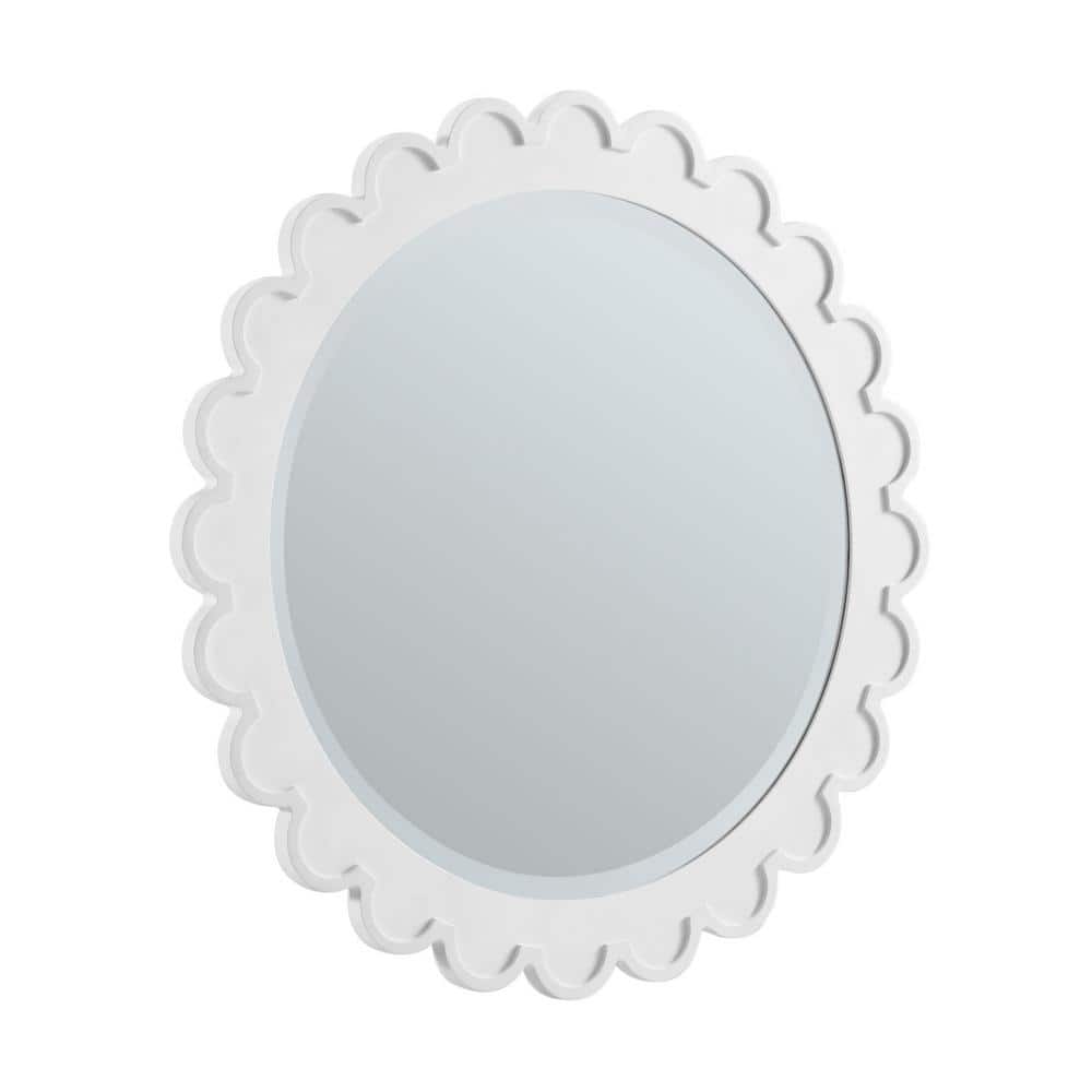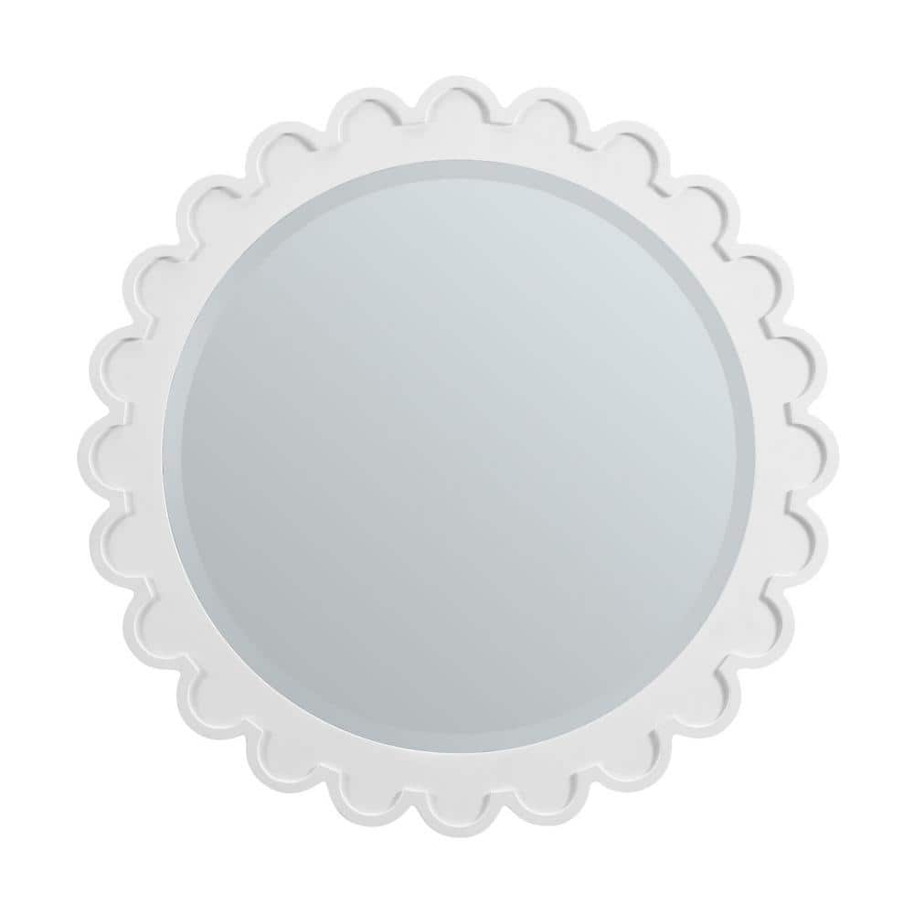 The Adelese Vanity Mirror by James Martin Vanities features a bright white finish and scalloped edges, adding elegance to any bathroom. Its beveled glass enhances depth and dimension, making it a stylish and functional addition.