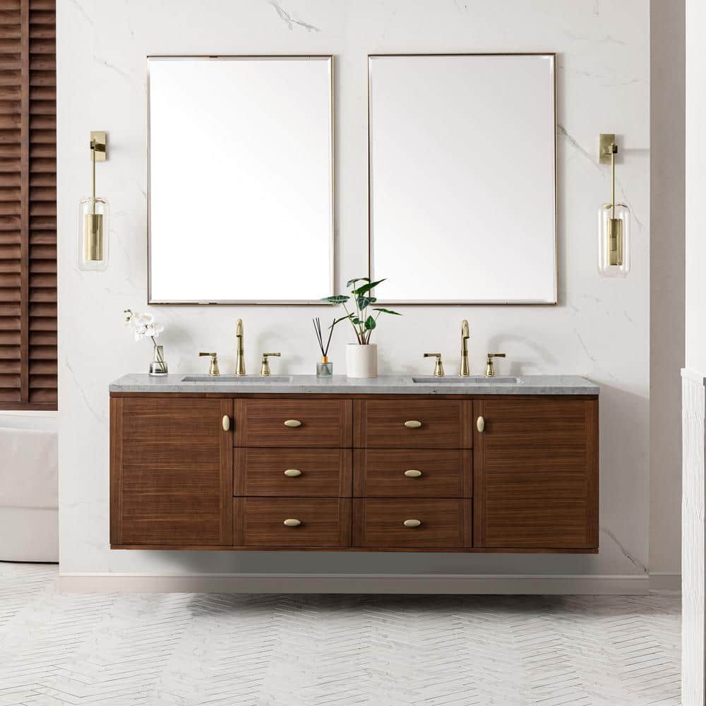 The Amberly Vanity is a masterpiece of mid-century modern design, blending natural walnut tones with sleek quartz surfaces. Its dual sink configuration and ample storage make it both functional and stylish. Pair it with brass fixtures to enhance its sophisticated charm. This vanity is the perfect centerpiece for a luxurious bathroom retreat.