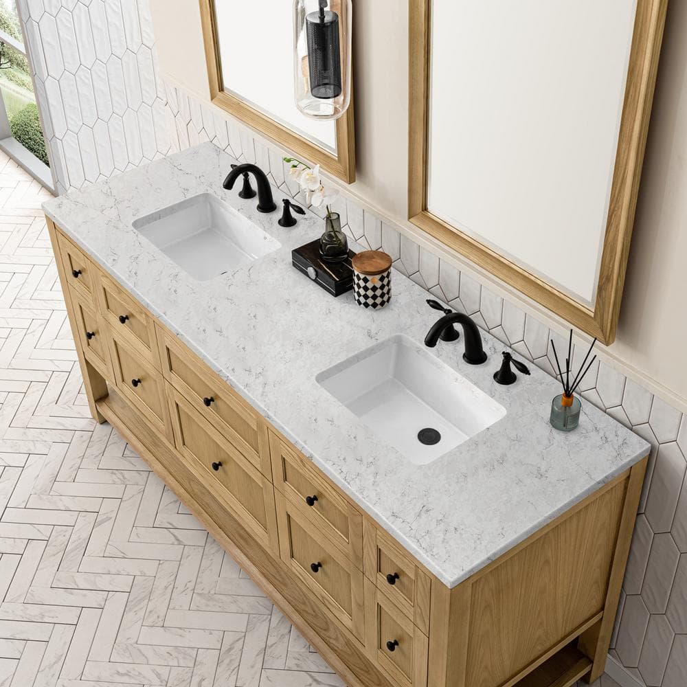 The Breckenridge 72-inch Bathroom Vanity combines modern farmhouse charm with practical storage. Featuring a Light Oak finish and Eternal Jasmine Pearl quartz top, it includes dual sinks, soft-close drawers, and USB/electrical ports.