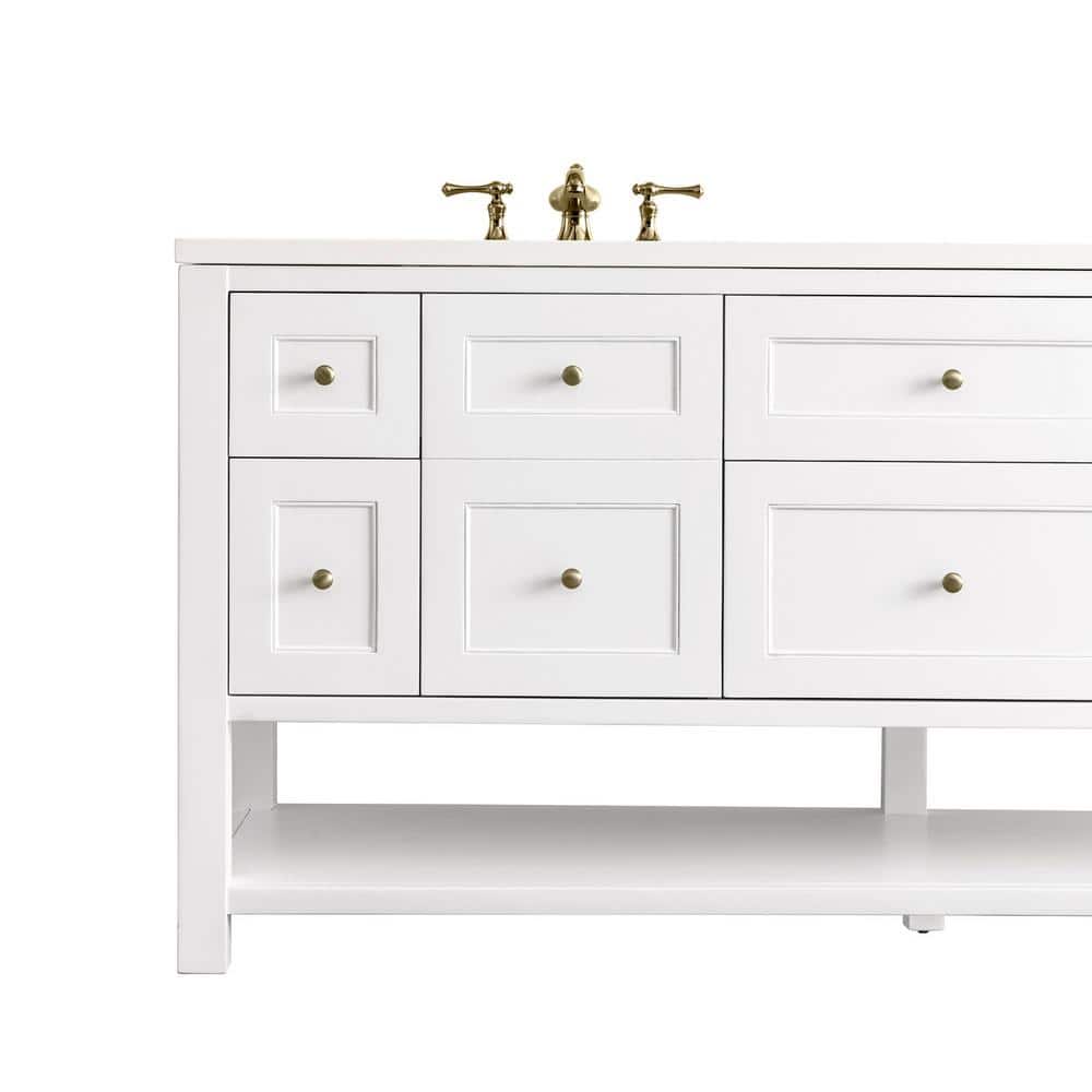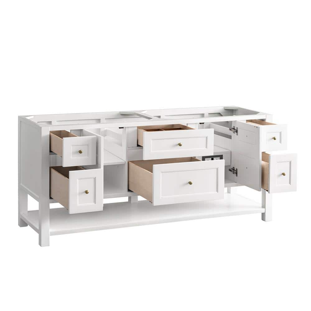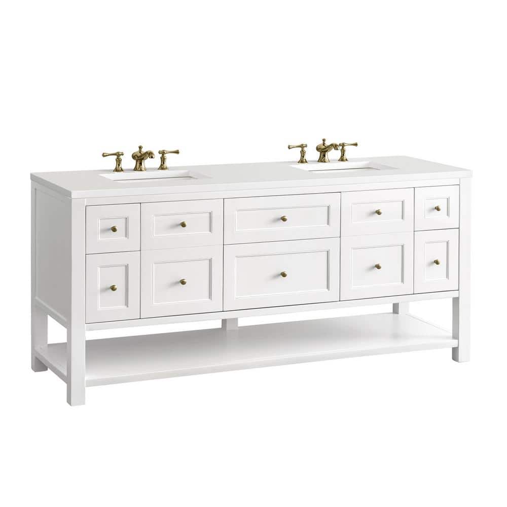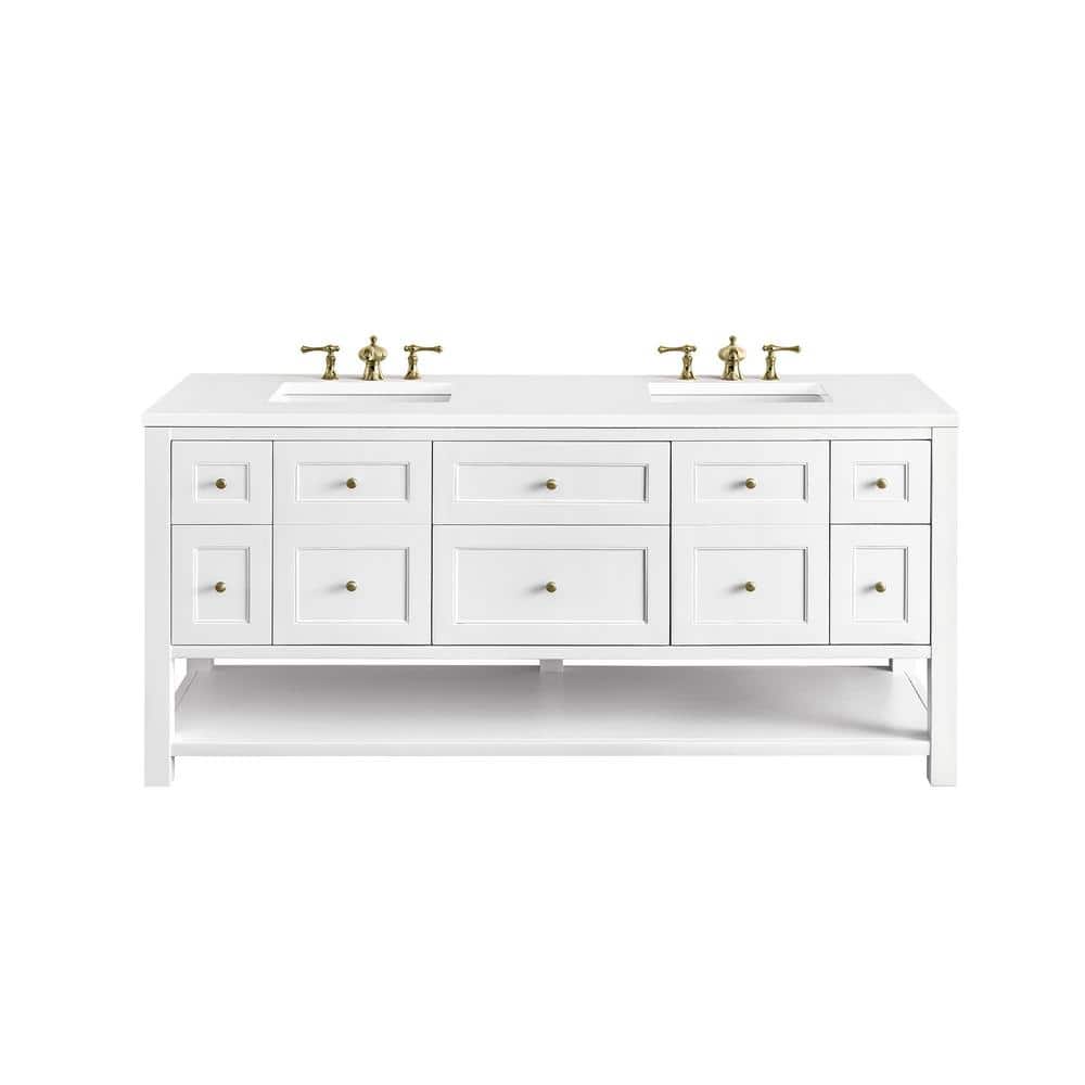 The Breckenridge 72" Double Vanity combines modern farmhouse charm with practical features. It boasts a Bright White finish, White Zeus Quartz top, and ample storage with six drawers and adjustable shelves. Perfect for enhancing any bathroom space.