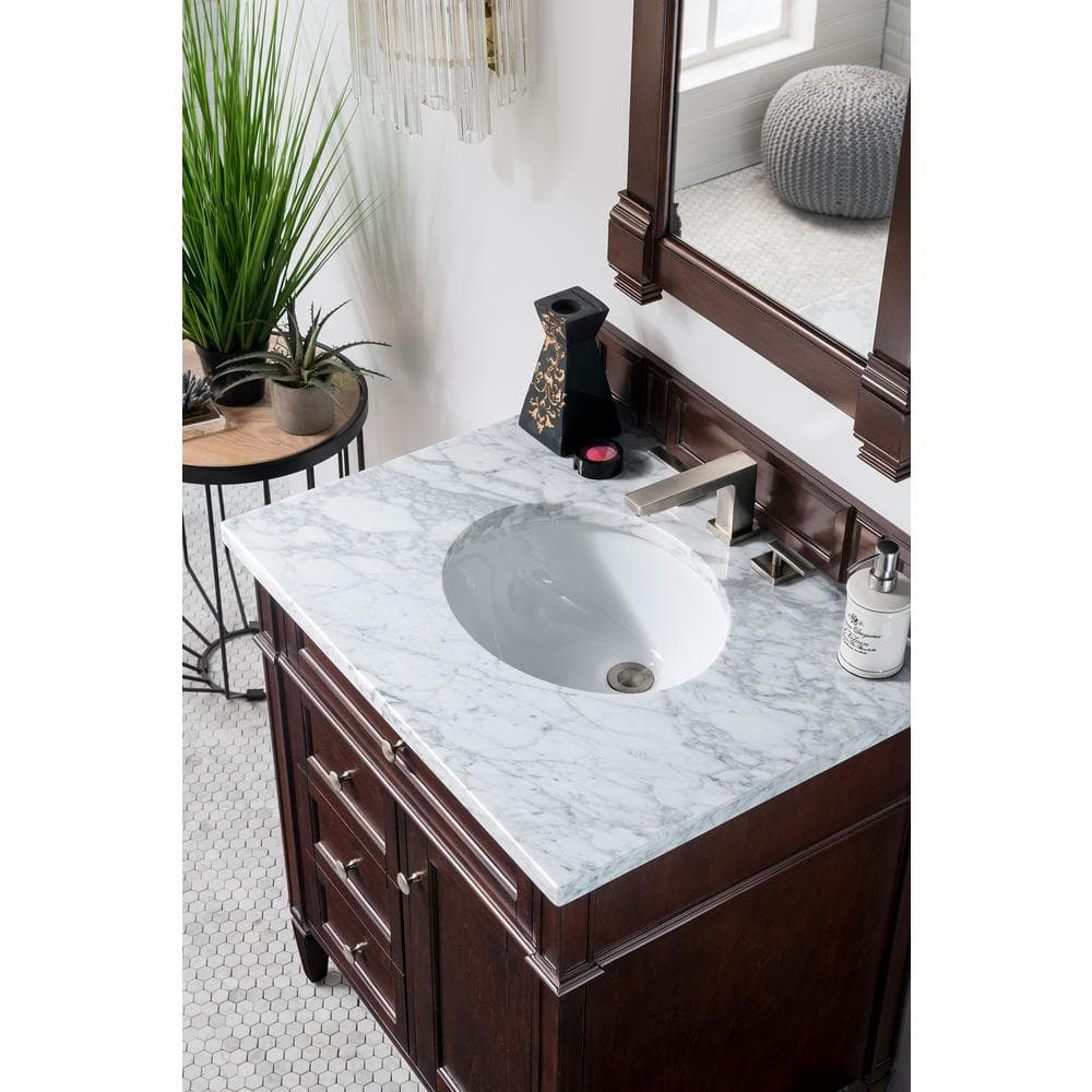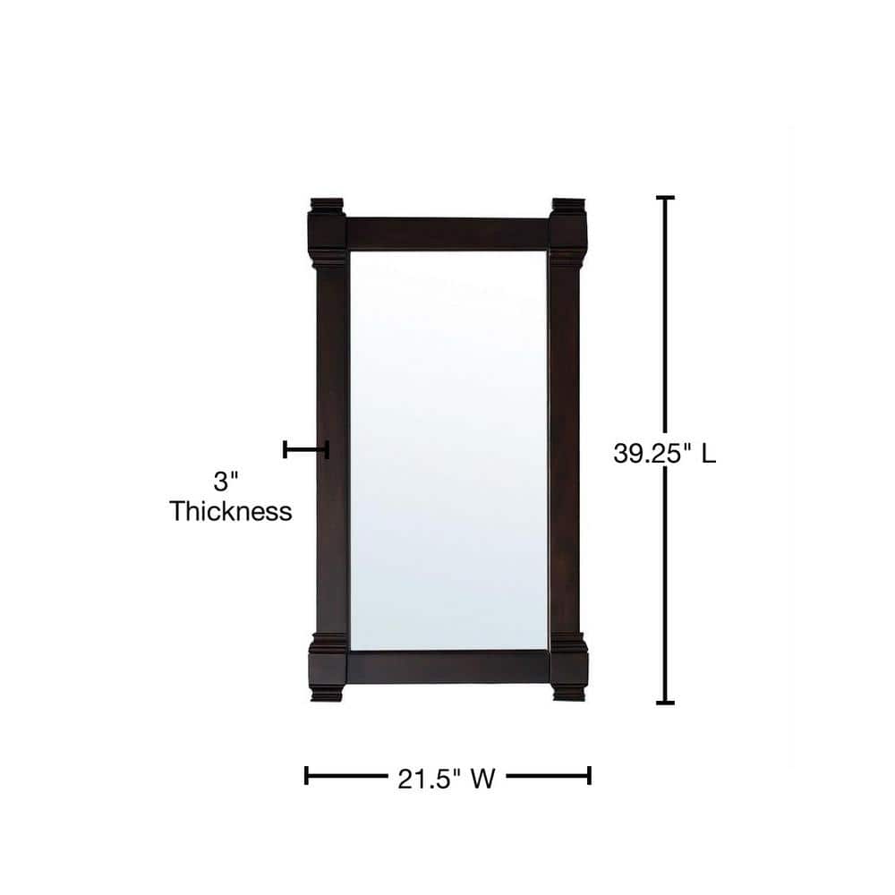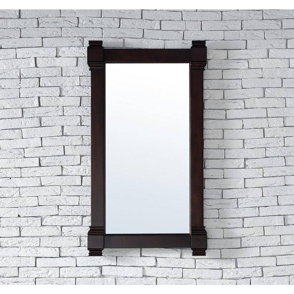 The Brittany Vanity Mirror by James Martin Vanities combines traditional and transitional styles, featuring a solid wood frame in a burnished mahogany finish. Its beveled glass and premium construction make it a durable and elegant addition to any bathroom.
