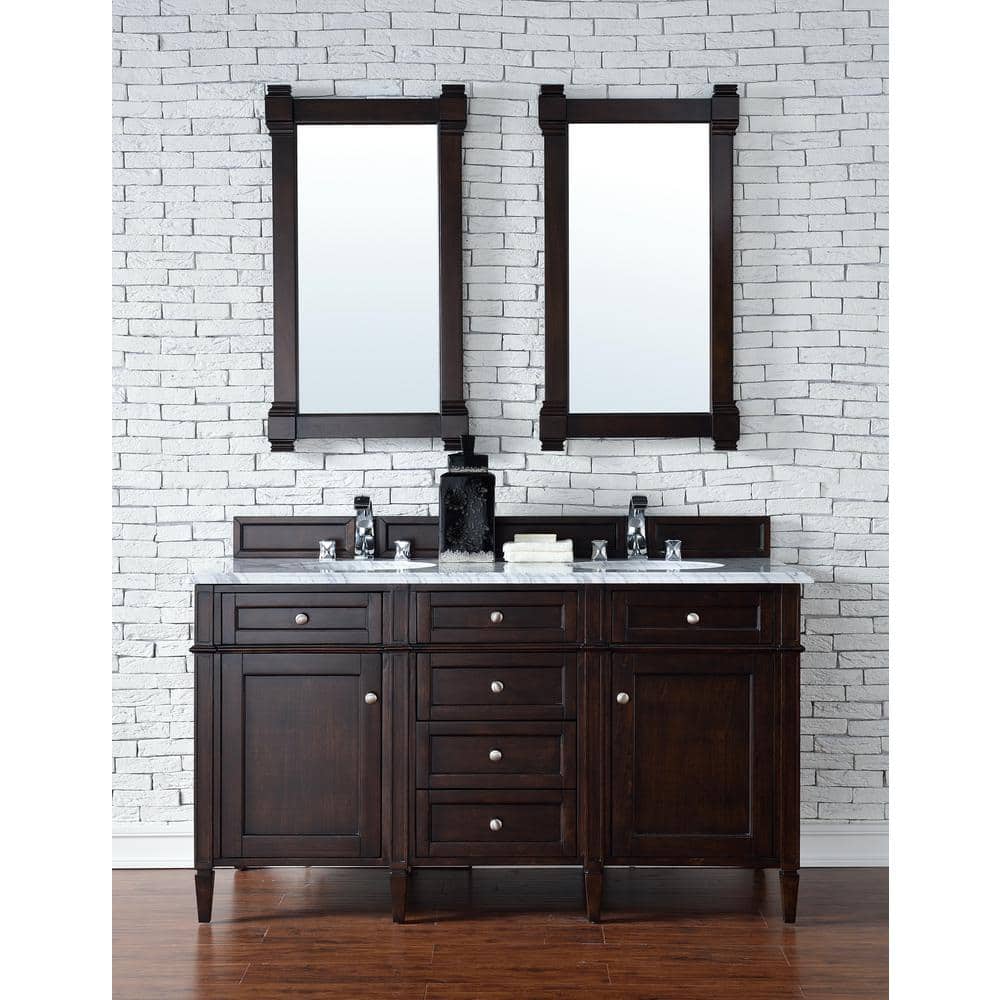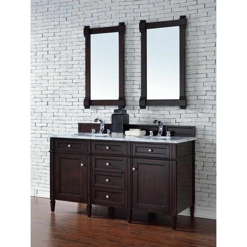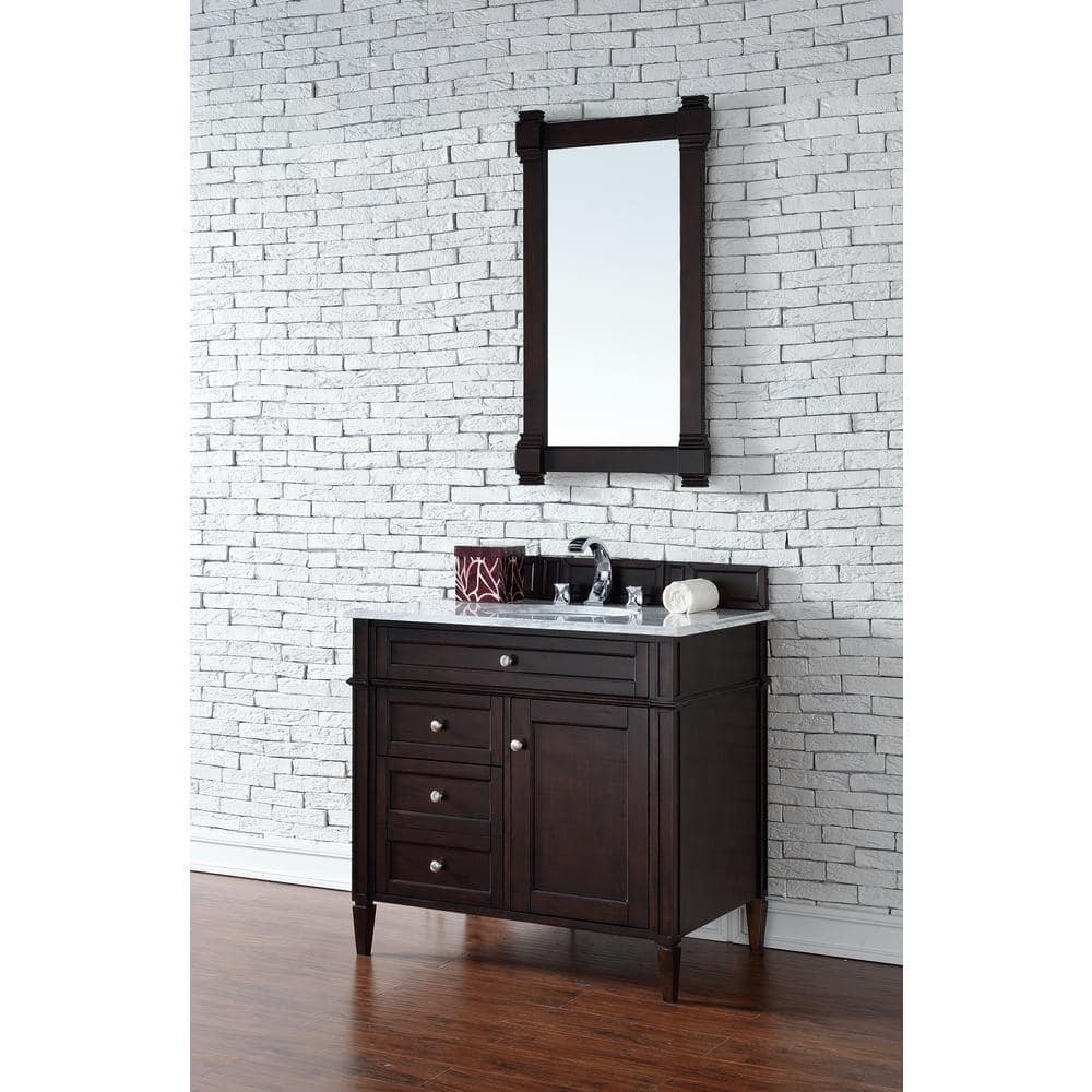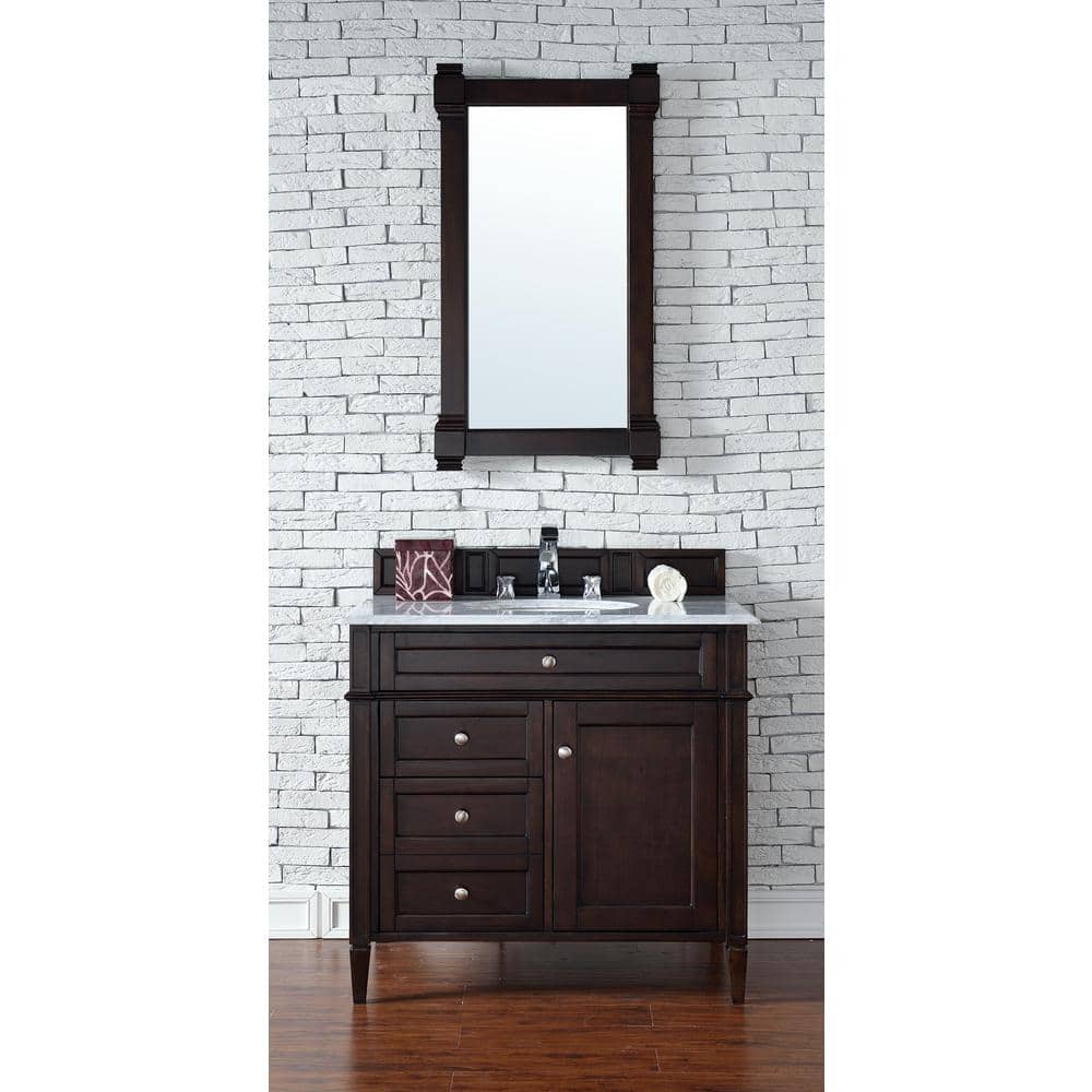 The Brittany Vanity Mirror by James Martin Vanities combines traditional and transitional styles, featuring a solid wood frame in a burnished mahogany finish. Its beveled glass and premium construction make it a durable and elegant addition to any bathroom.