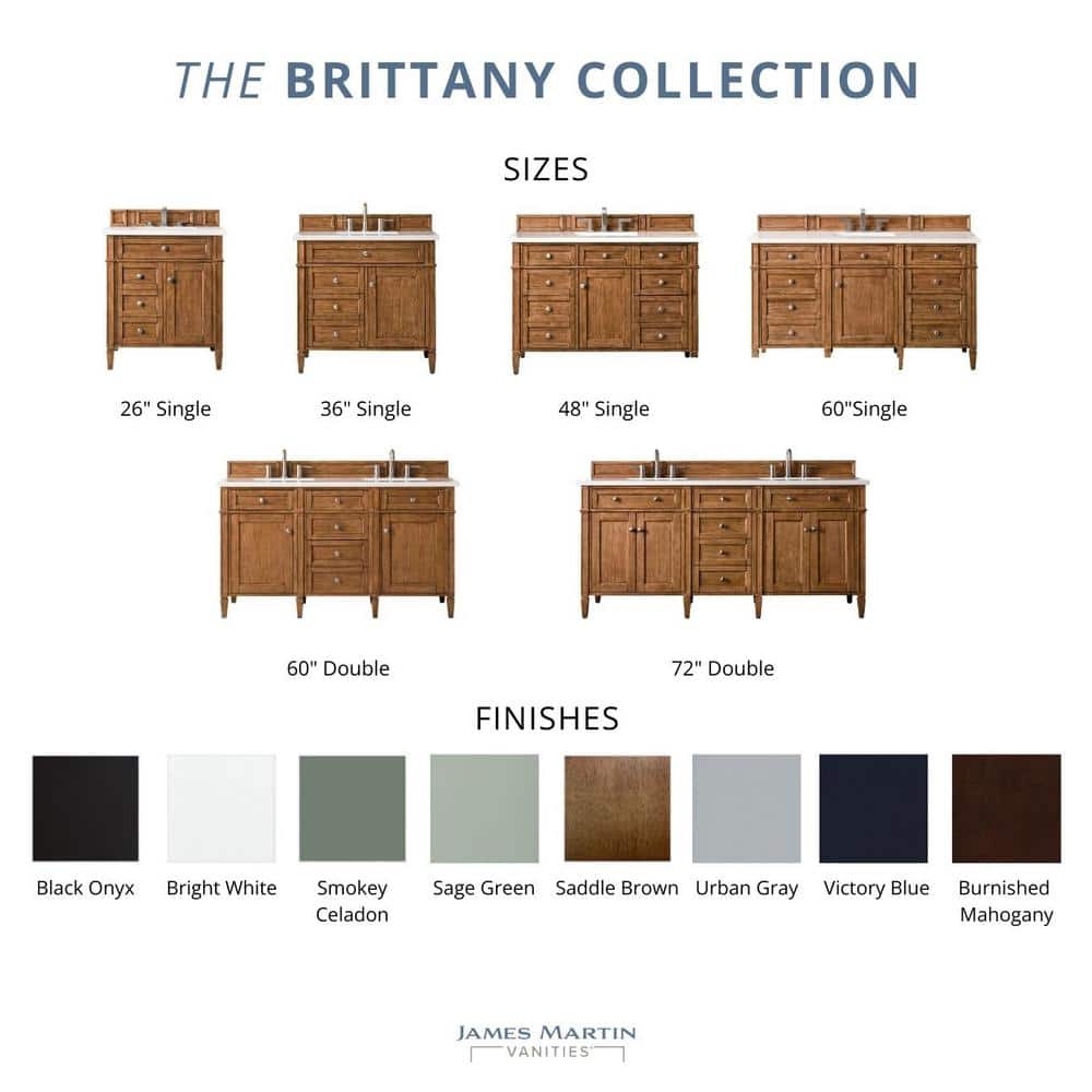 The Brittany 47-inch Single Bath Vanity Cabinet in Saddle Brown combines traditional and transitional styles with ample storage. Crafted from solid kiln-dried hardwood, it features soft-close drawers and doors, a premium moisture-resistant finish, and a matching decorative wood backsplash.