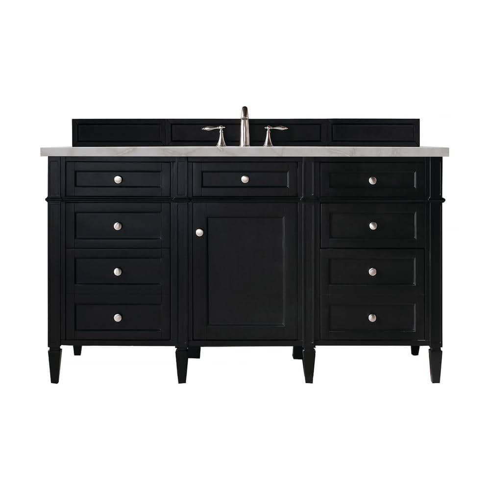 The Brittany 60" Black Onyx Single Bathroom Vanity combines timeless design with modern functionality. Featuring a Victorian Silver quartz top and ample storage, it is perfect for enhancing any bathroom space.