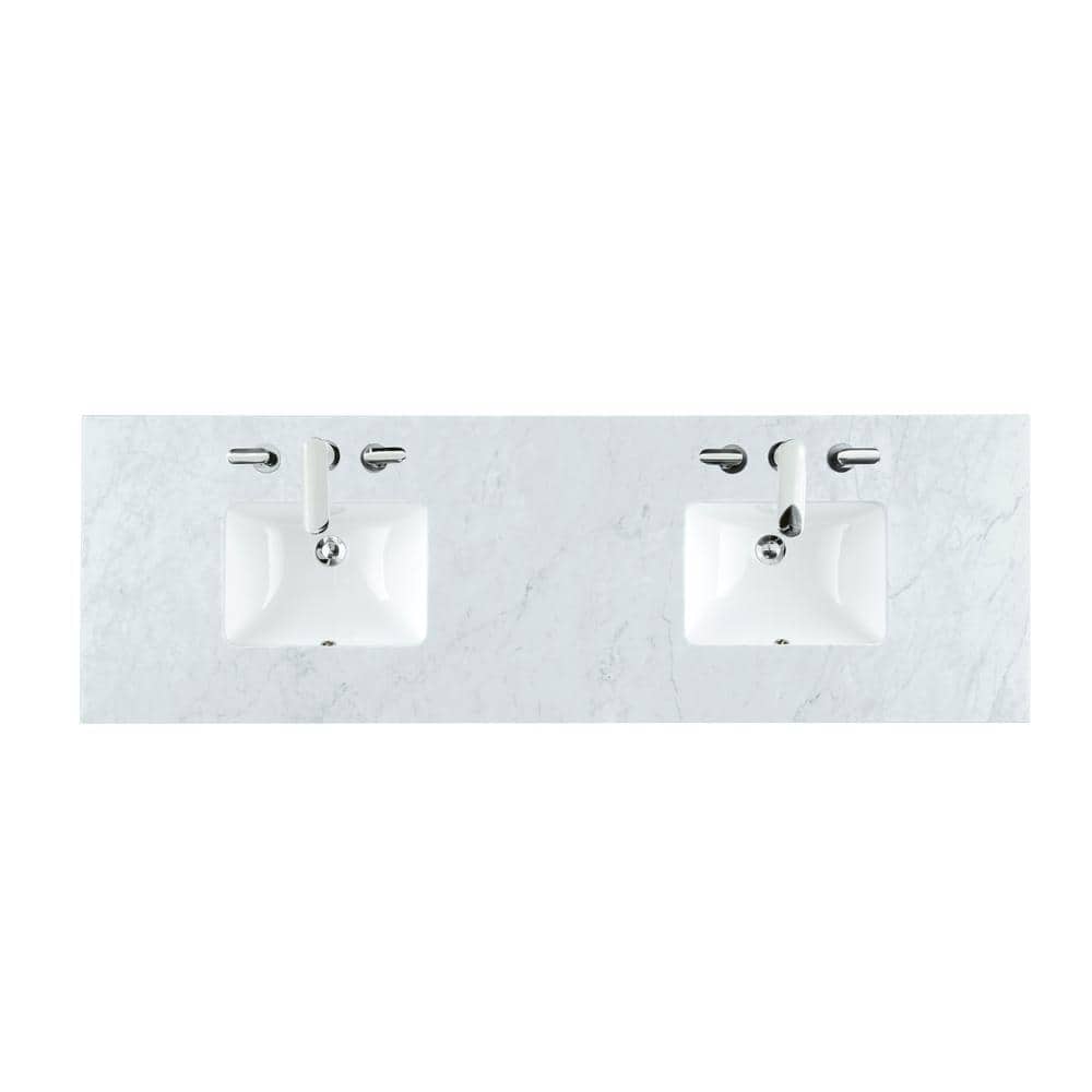 High-Quality Top: Carrara marble top with predrilled faucet holes and undermount sinks.