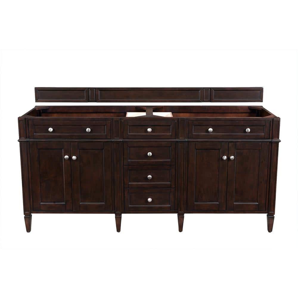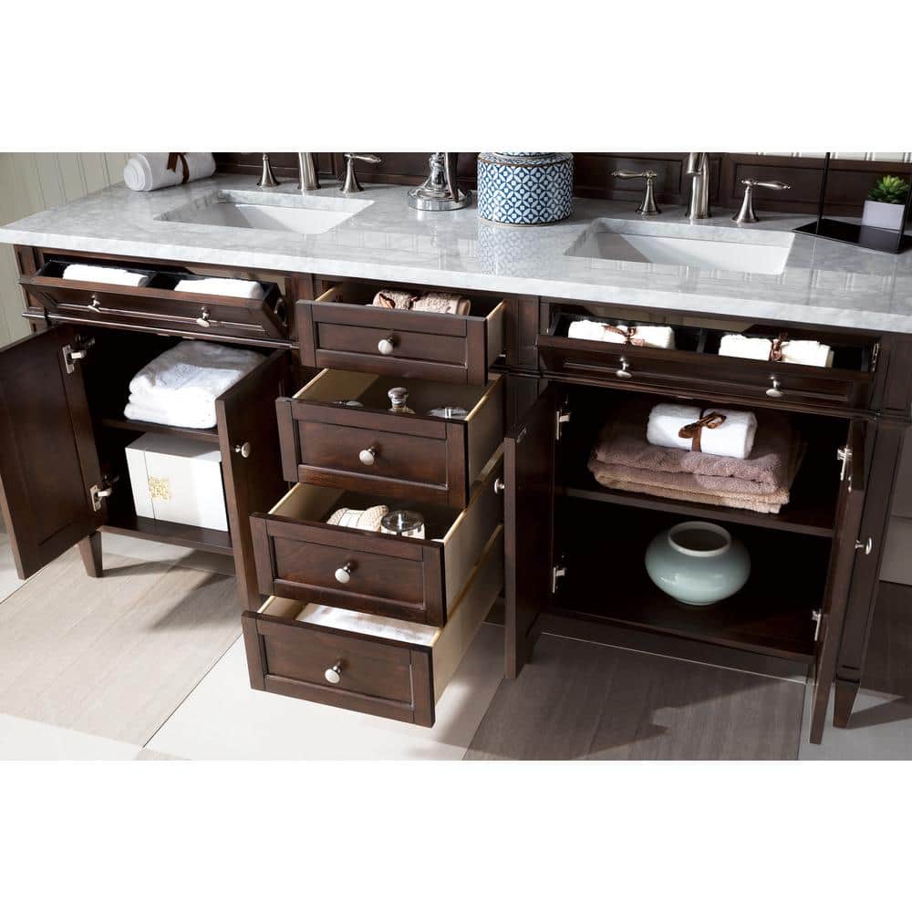 The Brittany 72-inch Double Vanity in Burnished Mahogany combines traditional craftsmanship with modern functionality. Featuring a Carrara marble top and ample storage, this vanity is perfect for enhancing your bathroom's elegance.