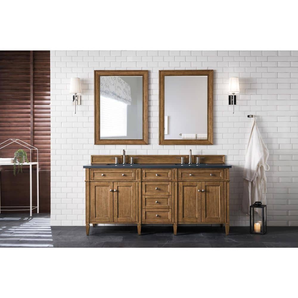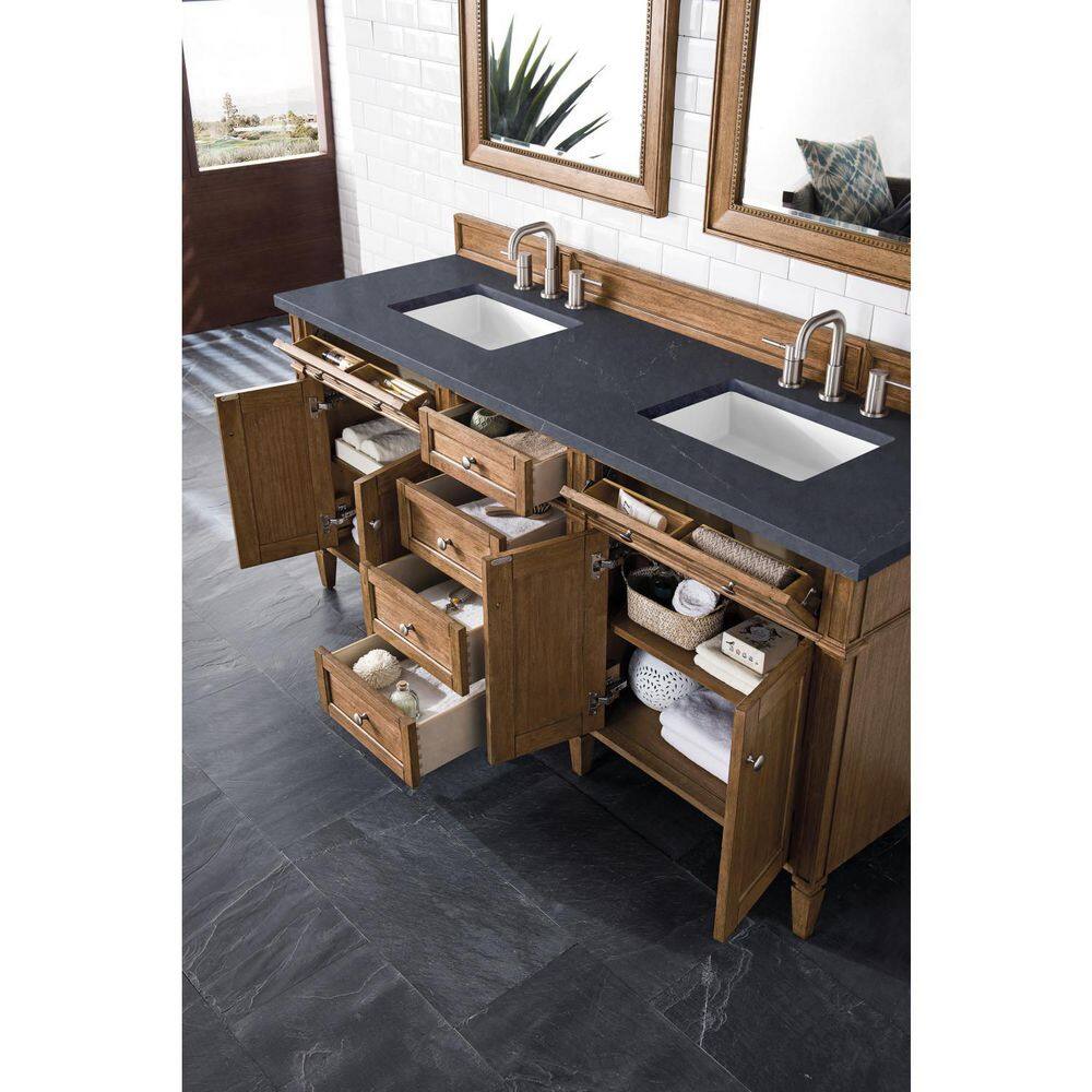 The Brittany 72" Saddle Brown Vanity by James Martin Vanities combines traditional and transitional styles with ample storage and a durable quartz top. It features a warm wood finish, soft-close drawers, and a premium Charcoal Soapstone countertop.