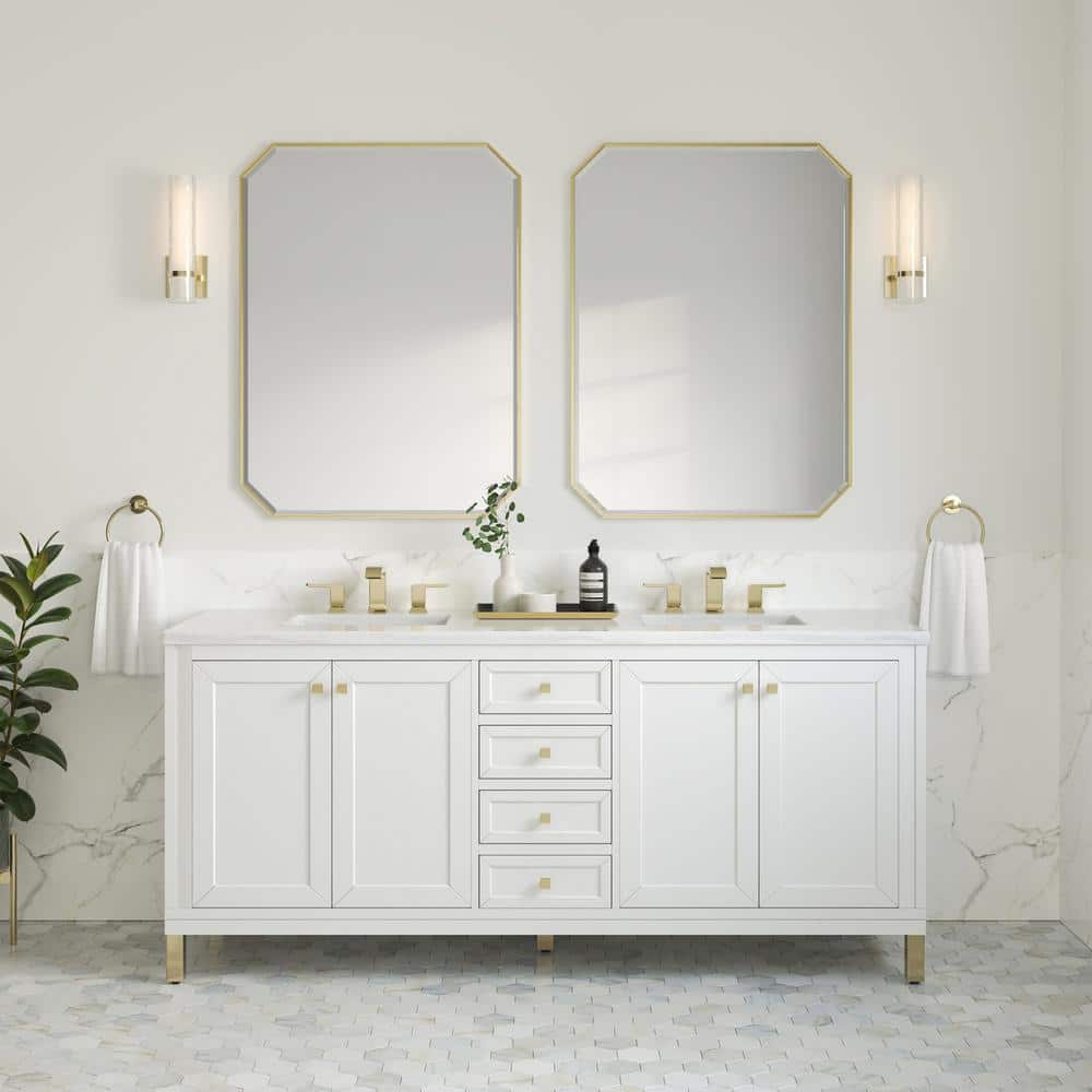 The James Martin Vanities Chicago 72" Double Vanity is a masterpiece of design and functionality. Its Glossy White finish and Arctic Fall Solid Surface top create a striking visual contrast, while the Champagne Brass hardware adds a touch of luxury. Perfect for both modern and transitional spaces, this vanity offers ample storage and versatility with its wall-mount option. Elevate your bathroom's aesthetic with this sophisticated centerpiece.