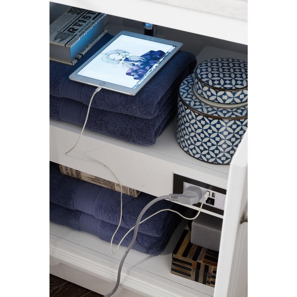 The De Soto Vanity is a masterpiece of traditional design and modern functionality. Its Bright White finish and White Zeus Quartz top create a clean, sophisticated look, while the soft-close drawers and integrated outlets add convenience. Style it with a pair of elegant mirrors and plush towels to create a spa-like retreat. This vanity is the epitome of luxury and practicality, perfect for transforming your bathroom into a serene sanctuary.