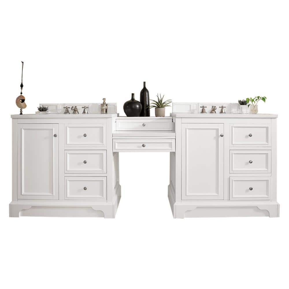 The De Soto Double Bathroom Vanity by James Martin Vanities combines traditional style with modern functionality. Featuring a Bright White finish, White Zeus Quartz top, and double sinks, it offers ample storage and a luxurious look for any bathroom.